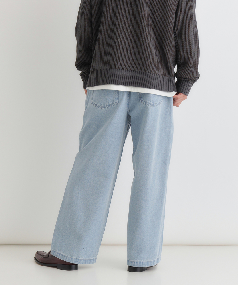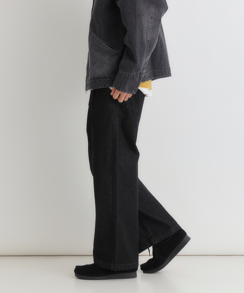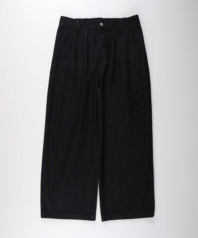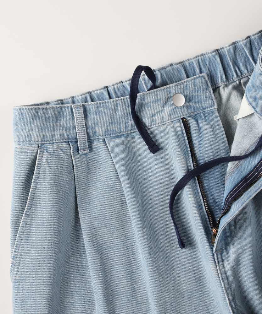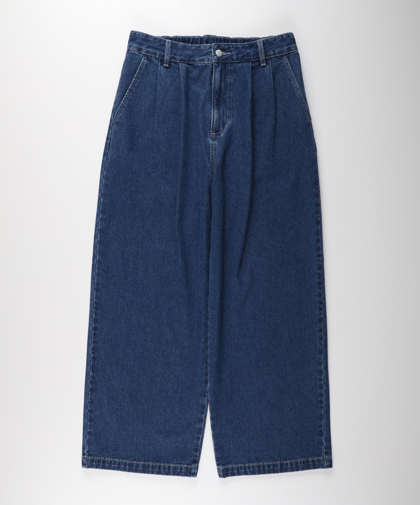【仕様】洗練されたワイドスラックスシルエットが特徴。控えめなタックデザインが、シンプルながらも奥行きのあるスタイルを実現します。【素材】 柔らかく適度な厚みを持つデニム生地を使用しています。しっかりとしたハリ感がありつつも、動きやすさも考慮されています。独自のウォッシュ加工により程よい風合いが加わり、普段使いでも特別感を演出します。 【スタイリング】 シンプルなTシャツやオックスフォードシャツとの相性が抜群。スニーカーでカジュアルに、革靴で少しドレッシーに仕上げることも可能です。アウトドアやカジュアルなビジネスシーンにぴったりなアイテムで、万能なスタイリングを楽しめます。
