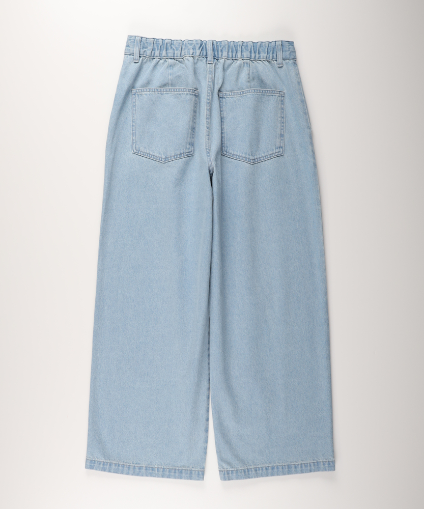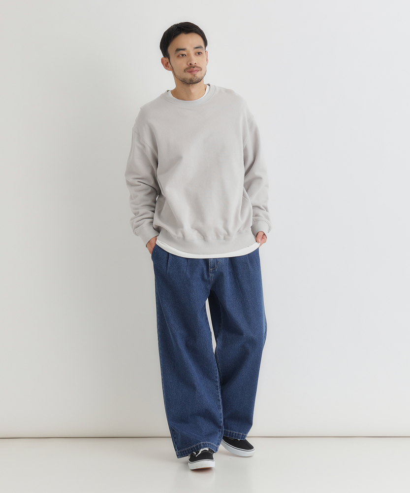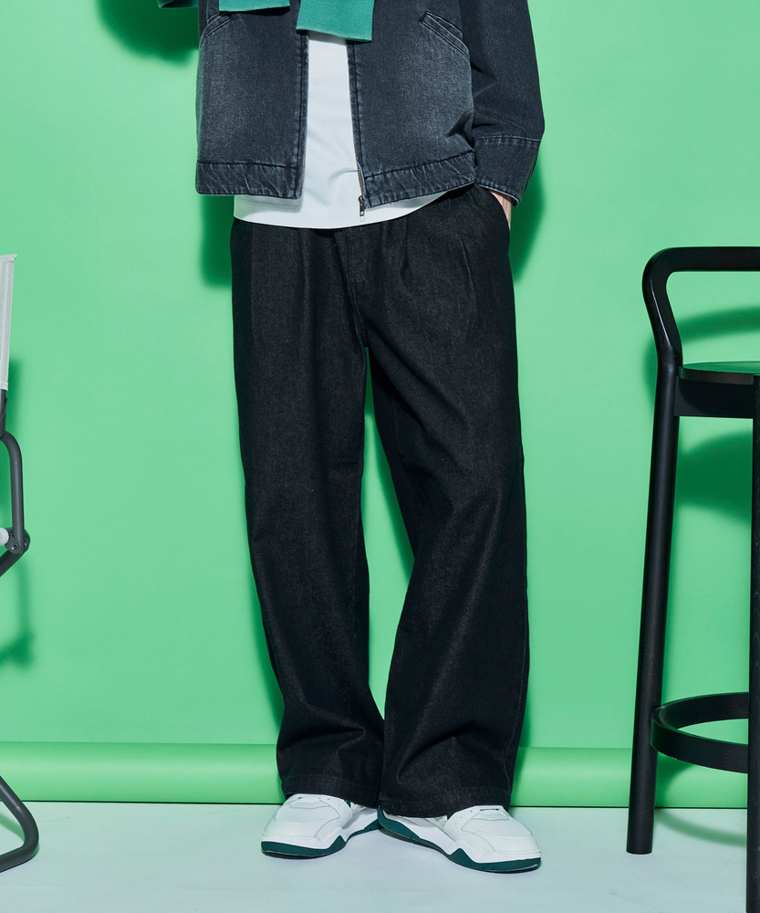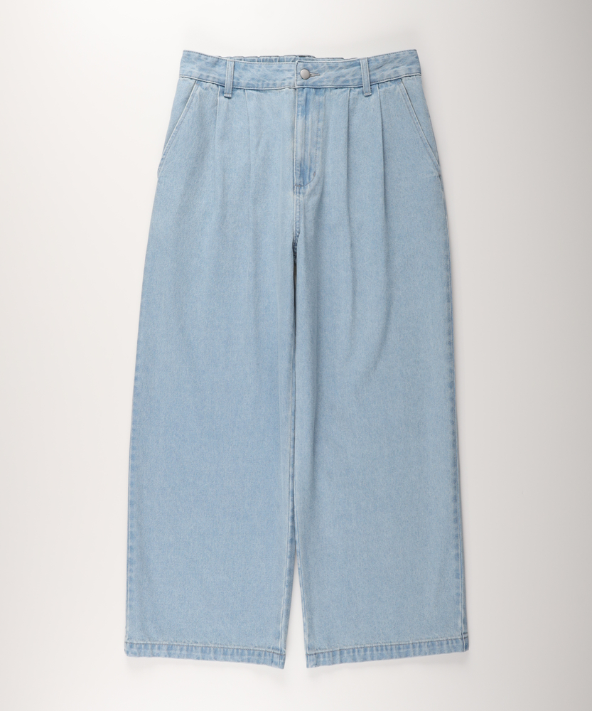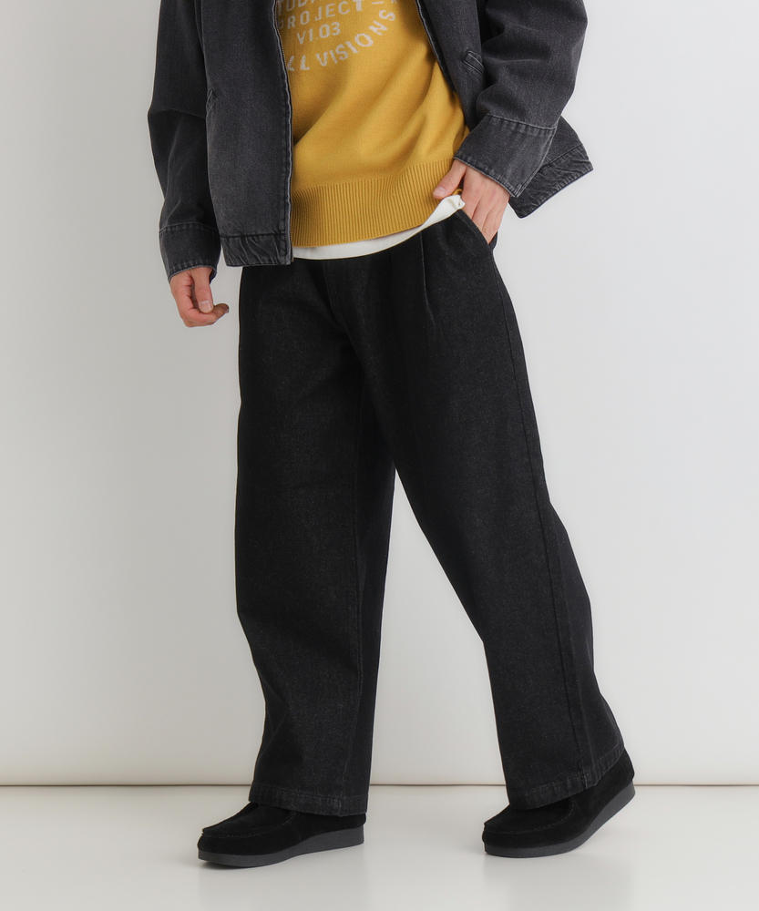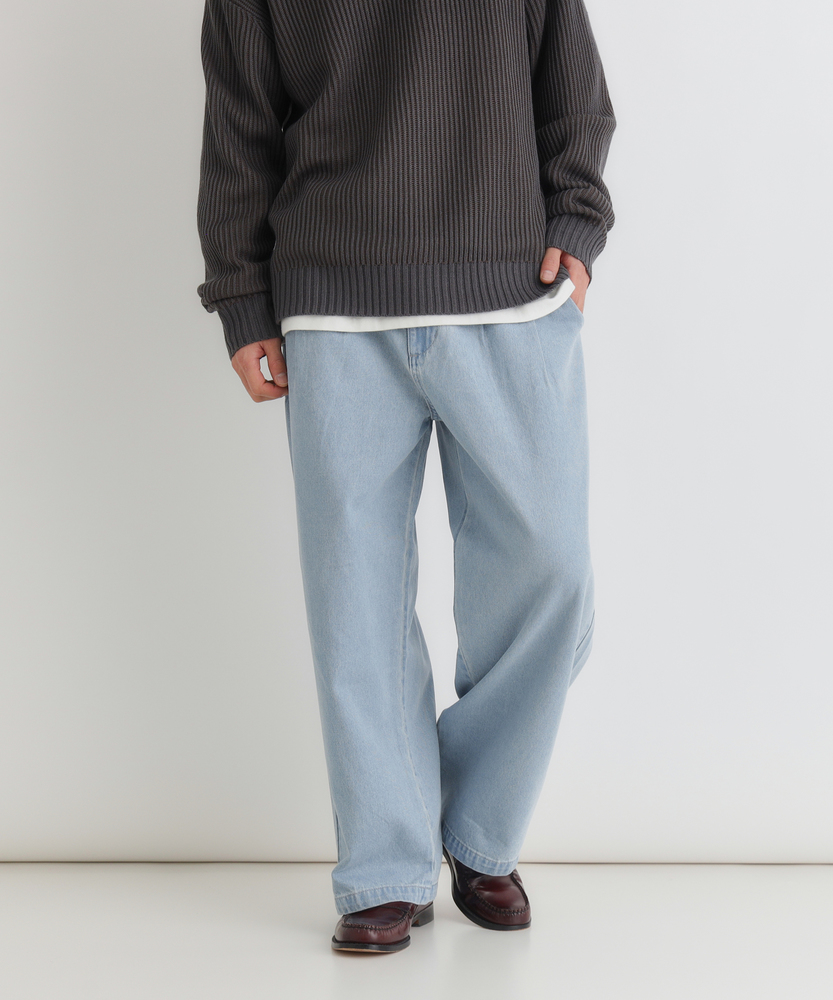 【仕様】洗練されたワイドスラックスシルエットが特徴。控えめなタックデザインが、シンプルながらも奥行きのあるスタイルを実現します。【素材】 柔らかく適度な厚みを持つデニム生地を使用しています。しっかりとしたハリ感がありつつも、動きやすさも考慮されています。独自のウォッシュ加工により程よい風合いが加わり、普段使いでも特別感を演出します。 【スタイリング】 シンプルなTシャツやオックスフォードシャツとの相性が抜群。スニーカーでカジュアルに、革靴で少しドレッシーに仕上げることも可能です。アウトドアやカジュアルなビジネスシーンにぴったりなアイテムで、万能なスタイリングを楽しめます。