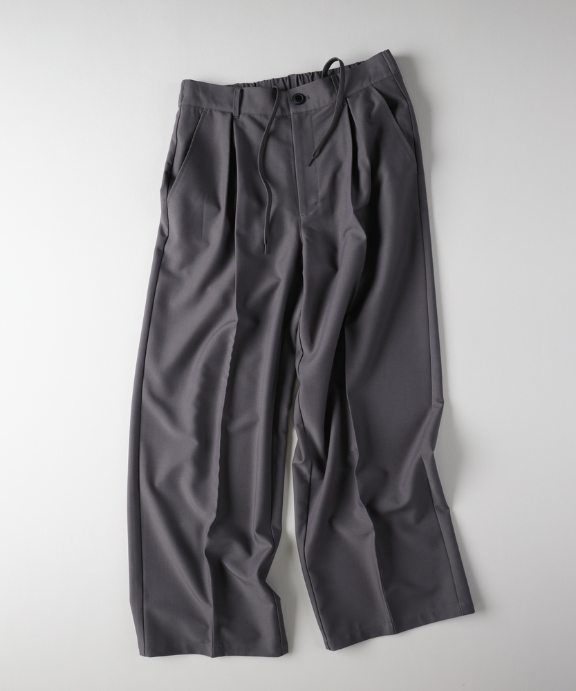 休日も楽にカッコよく。ウエストゴム&シワになりにくくて楽!1ランク上のカジュアルスタイルに。TRトラウザーシリーズ■Point・全体的にゆったりとしたトレンドのワイドシルエット。・ウエストゴムで楽な穿き心地。・シワになりにくい素材でお手入れもラク【仕様】ゆったりとしたワイドシルエットが特徴のトラウザー。フロントのタックが立体感を生み出し、リラックスした印象を与えます。ウエストはゴム仕様で、快適なフィット感を実現しています。【素材】 軽やかなTR素材を使用。シワになりにくく、動きやすさを兼ね備えたこのパンツは、デイリーユースに最適です。さらりとした肌触りで、季節を問わず快適に着用できます。 【スタイリング】 シンプルなTシャツやシャツと合わせて、大人のカジュアルスタイルに幅広く対応。スニーカーやサンダルを合わせることで、リラックスしたスタイルに。アクセサリーで個性をプラスすれば、洗練された印象に仕上がります。 【楽して上品。TRトラウザーシリーズ】TRトラウザーシリーズ▶