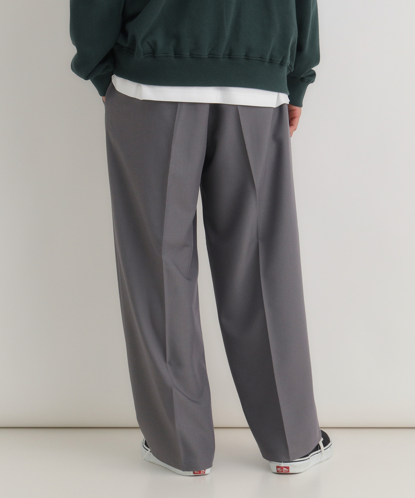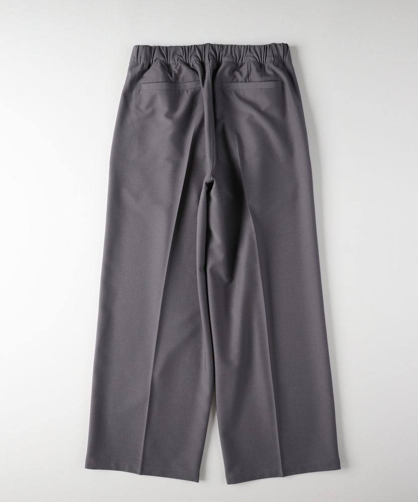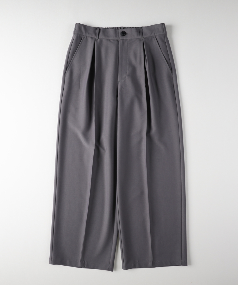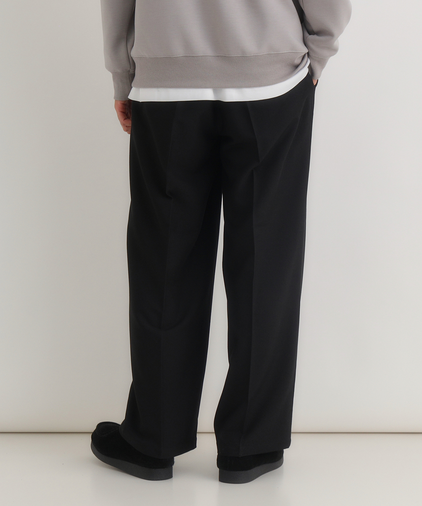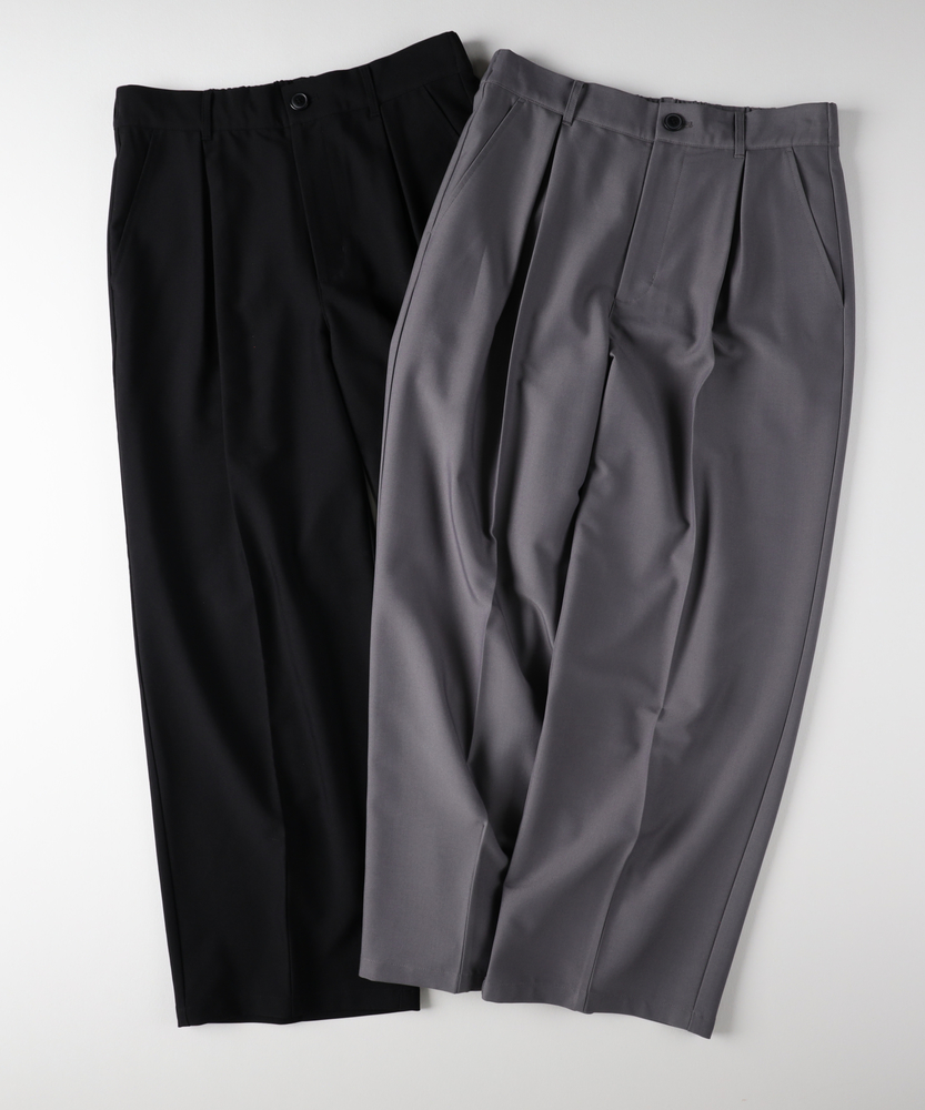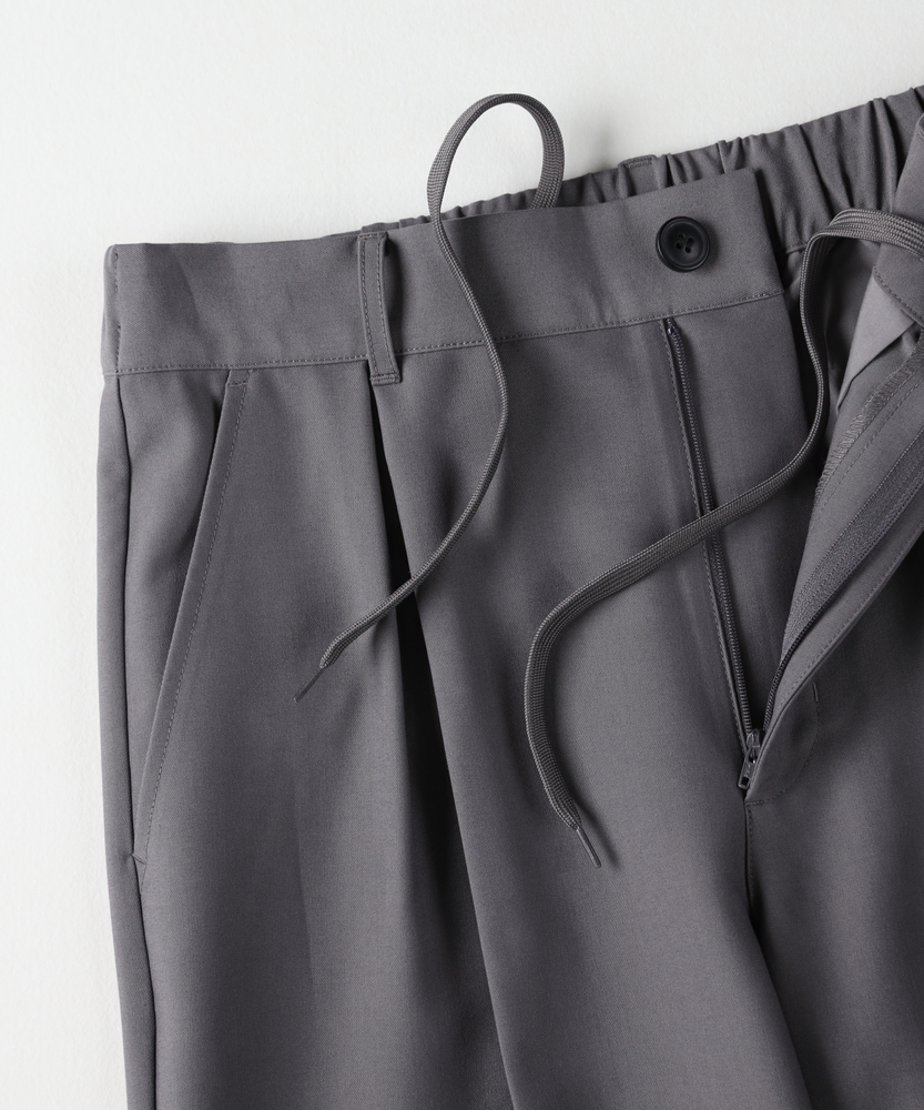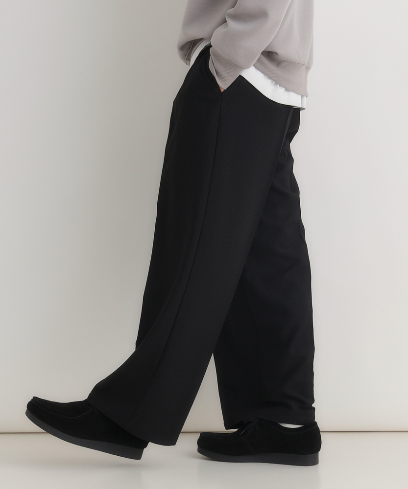休日も楽にカッコよく。ウエストゴム&シワになりにくくて楽!1ランク上のカジュアルスタイルに。TRトラウザーシリーズ■Point・全体的にゆったりとしたトレンドのワイドシルエット。・ウエストゴムで楽な穿き心地。・シワになりにくい素材でお手入れもラク【仕様】ゆったりとしたワイドシルエットが特徴のトラウザー。フロントのタックが立体感を生み出し、リラックスした印象を与えます。ウエストはゴム仕様で、快適なフィット感を実現しています。【素材】 軽やかなTR素材を使用。シワになりにくく、動きやすさを兼ね備えたこのパンツは、デイリーユースに最適です。さらりとした肌触りで、季節を問わず快適に着用できます。 【スタイリング】 シンプルなTシャツやシャツと合わせて、大人のカジュアルスタイルに幅広く対応。スニーカーやサンダルを合わせることで、リラックスしたスタイルに。アクセサリーで個性をプラスすれば、洗練された印象に仕上がります。 【楽して上品。TRトラウザーシリーズ】TRトラウザーシリーズ▶