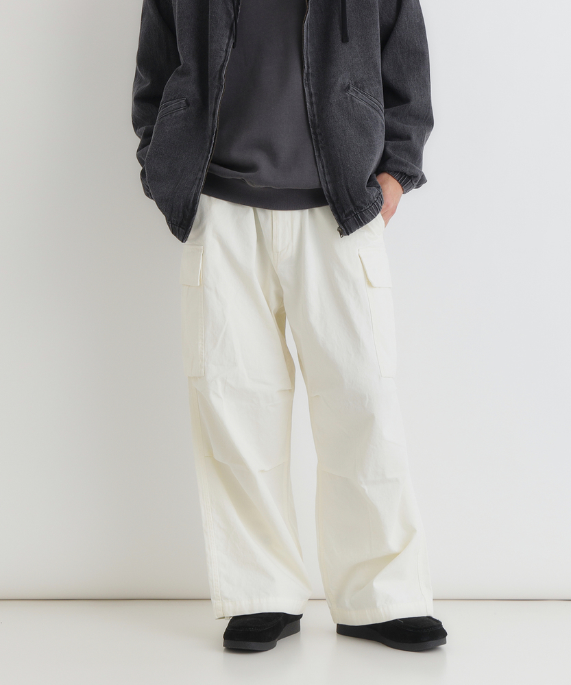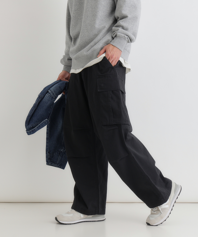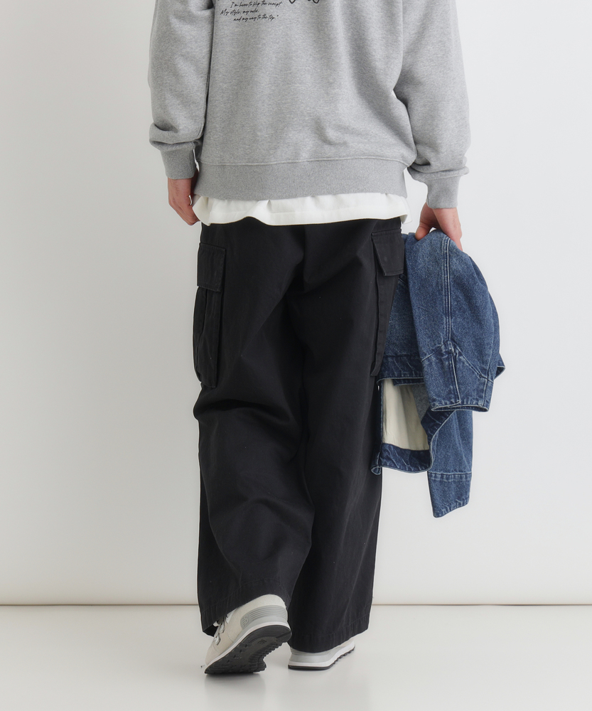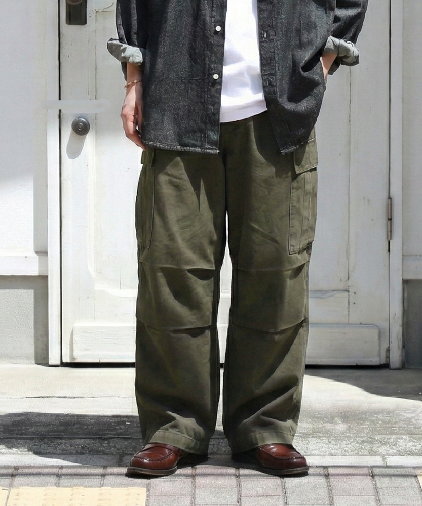 【仕様】古着のような味わい深い加工感が魅力のカーゴパンツ。ワイドシルエットがリラックスした印象を与え、カジュアルなスタイルにぴったりです。大きなサイドポケットが実用性を高め、機能美を兼ね備えたデザインに仕上がっています。【素材】 綿100%のコットンツイル生地を使用し、優しい肌触りと通気性を実現。しっかりとした厚みがありながら、軽やかな着心地が特徴です。古着のような色落ち加工が施されており、独自の風合いを楽しむことができます。 【スタイリング】 シンプルなTシャツやバンドカラーシャツとの組み合わせが絶妙です。スニーカーやサンダルでアクティブに決めたり、トレンドのアウターを重ねてスタイリングを楽しむことができます。多様な色展開が、シーンに合わせたコーディネートを可能にします。