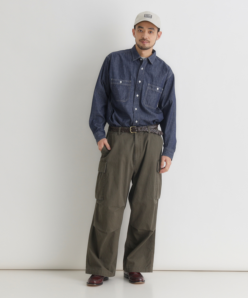【仕様】古着のような味わい深い加工感が魅力のカーゴパンツ。ワイドシルエットがリラックスした印象を与え、カジュアルなスタイルにぴったりです。大きなサイドポケットが実用性を高め、機能美を兼ね備えたデザインに仕上がっています。【素材】 綿100%のコットンツイル生地を使用し、優しい肌触りと通気性を実現。しっかりとした厚みがありながら、軽やかな着心地が特徴です。古着のような色落ち加工が施されており、独自の風合いを楽しむことができます。 【スタイリング】 シンプルなTシャツやバンドカラーシャツとの組み合わせが絶妙です。スニーカーやサンダルでアクティブに決めたり、トレンドのアウターを重ねてスタイリングを楽しむことができます。多様な色展開が、シーンに合わせたコーディネートを可能にします。