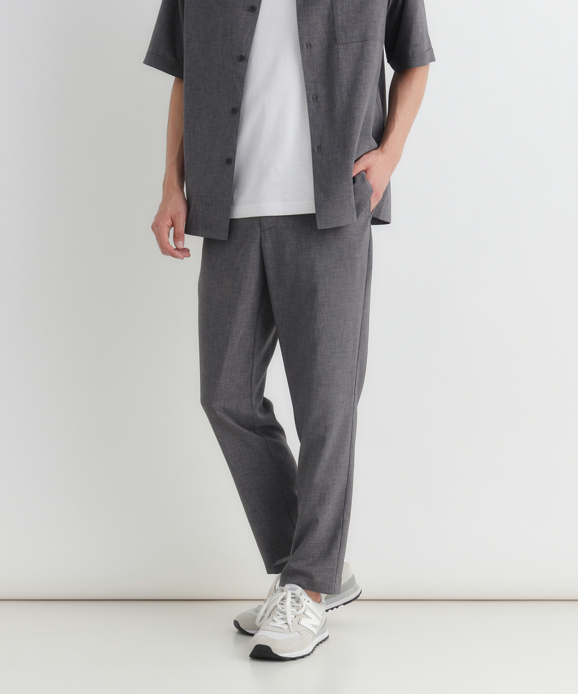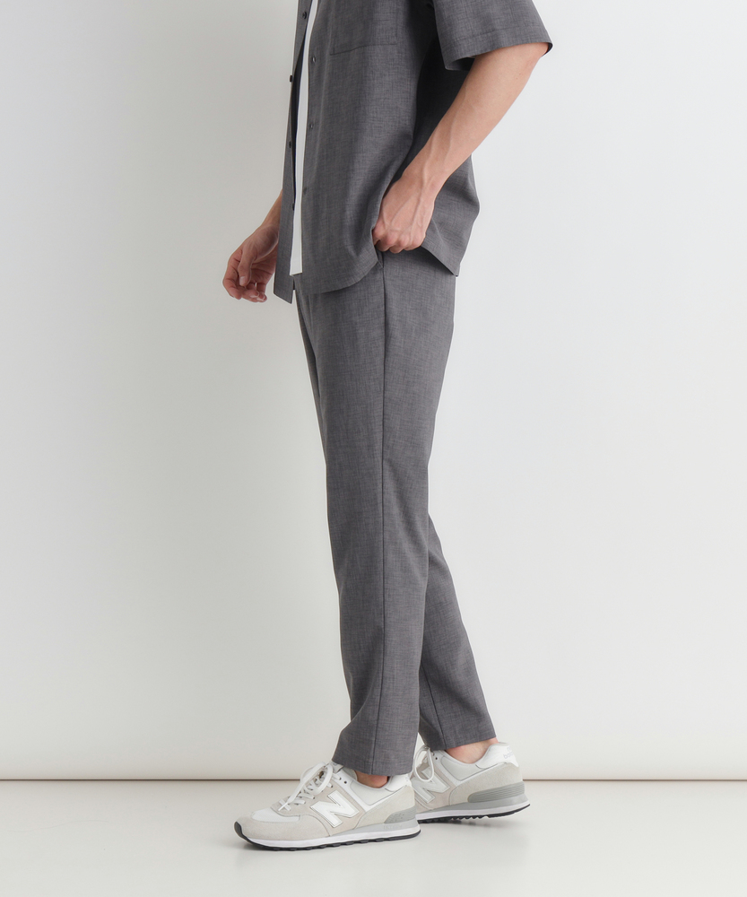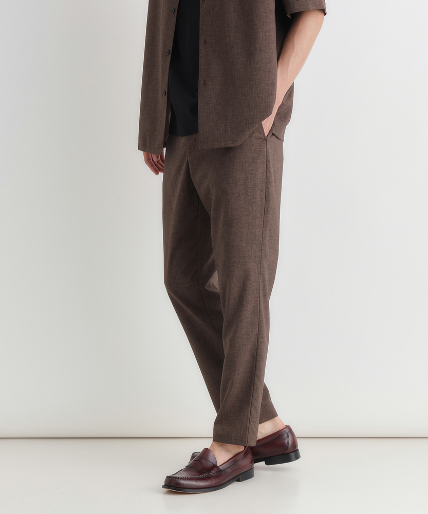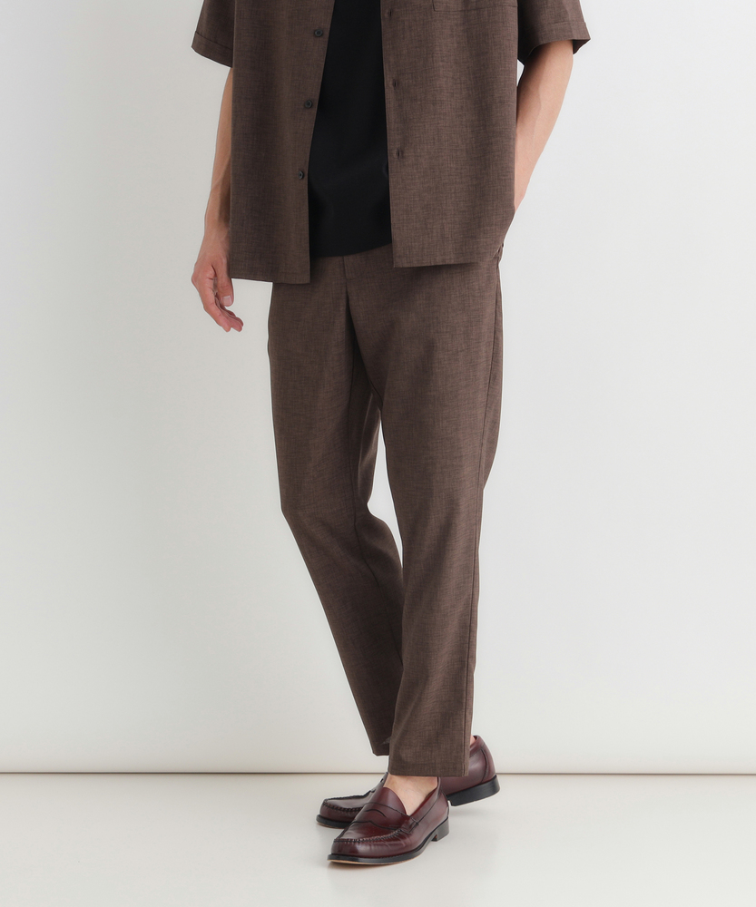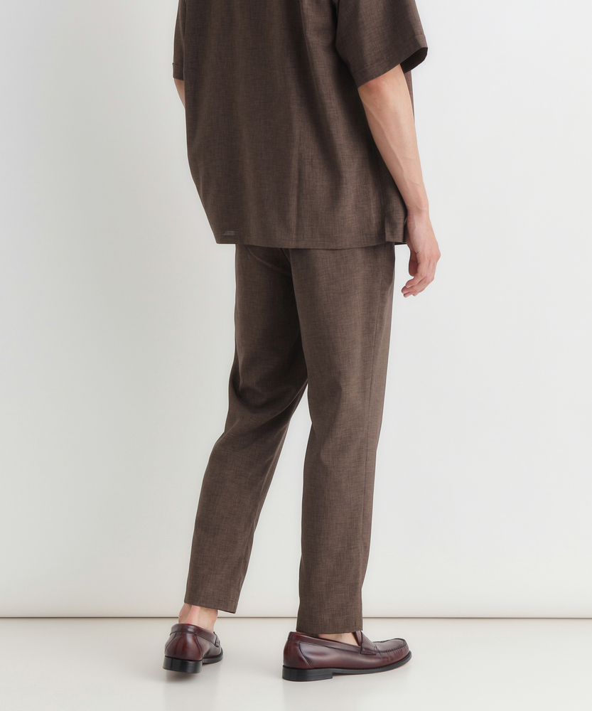 品格とリラックスを両立する、大人の新定番。軽やかに穿きこなすイージー仕様。オンオフ問わず活躍する、洗練されたテーパードシルエット。■Point・涼しげなリネンライク素材ナチュラルな風合いを再現。ドライなタッチで清涼感アップ。暑い季節も軽やかな穿き心地。・スラックス見えする上品さベルトループ付きの本格仕様。フロントボタンできちんと感を。ラフになりすぎない大人の一本。・快適なウエストデザインウエスト周りの窮屈感を軽減。動きやすくストレスフリーに。長時間の着用でも快適さをキープ。・スマートなテーパードライン裾に向かって細くなるシルエット。脚のラインをすっきりと美しく。だらしなく見えない絶妙なバランス。・着回し力の高いベーシックカラー落ち着きのあるモダンな色展開。どんなトップスとも好相性。日常のスタイリングに自然と馴染む。・オンオフ兼用できる汎用性休日のカジュアルスタイルにも。ビジネスカジュアルにも対応可能。ワードローブの頼れる存在に。【仕様】装飾を抑えたミニマルなデザインで、大人の日常に寄り添うイージーパンツです。フロントはボタンとジップ仕様でスラックスのような上品さを持ちながら、ウエスト周りはリラックスできる作りになっています。裾に向かって緩やかに細くなるテーパードシルエットが、脚のラインをすっきりと見せ、スマートな印象を与えます。【素材】生地表面の繊細な織り目とメランジ調の色合いが、奥行きのある豊かな表情を演出。見た目にも涼しげで、さらりとした肌触りが心地よく、軽やかな穿き心地を実現します。日常使いからちょっとしたお出かけまで気兼ねなく着用いただけます。【スタイリング】無地のカットソーやポロシャツを合わせた、クリーンなカジュアルスタイルに最適です。足元はスニーカーで抜け感を出すのはもちろん、ローファーやレザーシューズと合わせれば、品格漂うきれいめなスタイルとしても活躍します。シャツをタックインする着こなしもサマになる、着回し力の高い万能なアイテムです。【BACK NUMBER】ワーク・ミリタリーといったアメリカンカジュアルを根幹に、古き良きヴィンテージウェアの魅力を受け継ぎながらも、現代のライフスタイルや着こなしに合わせた素材・シルエットで再構築した、【Re-Vintage】をコンセプトに掲げるブランド。 【セットアップで着用可能なアイテムはこちら】BN26101300049 リネンライク半袖シャツ/セットアップ対応