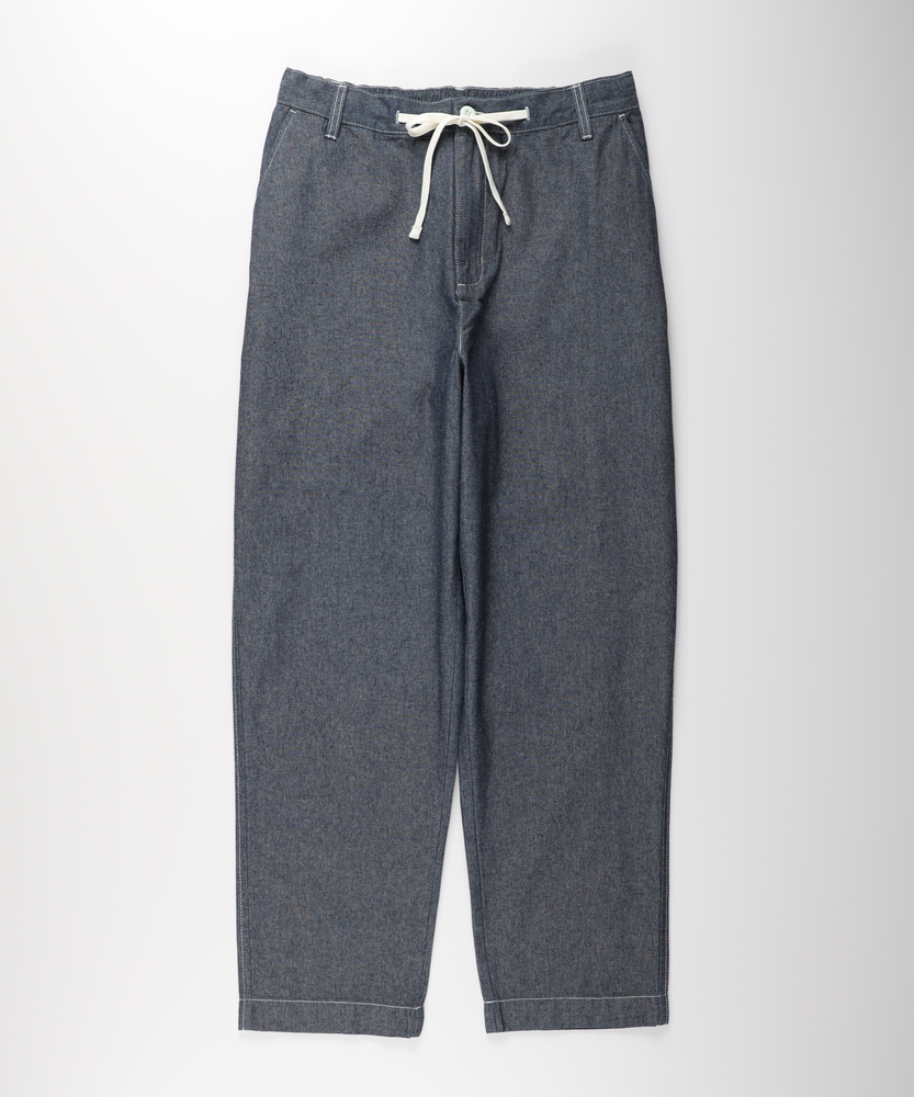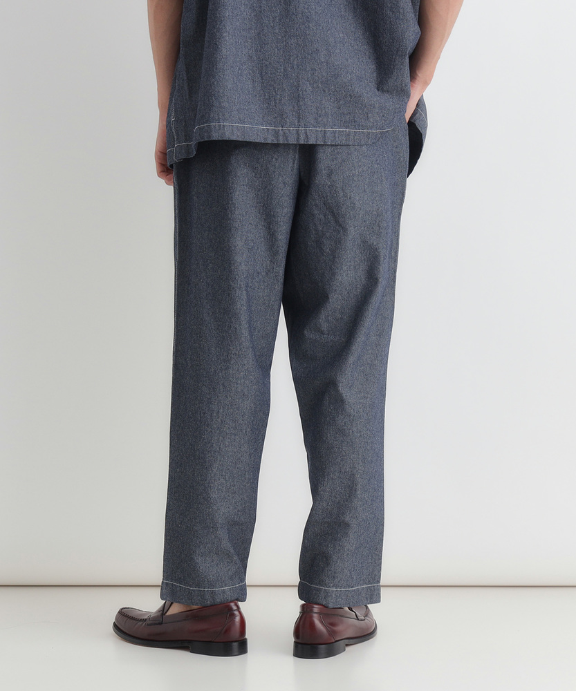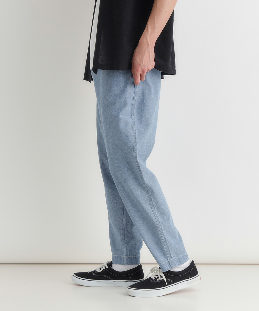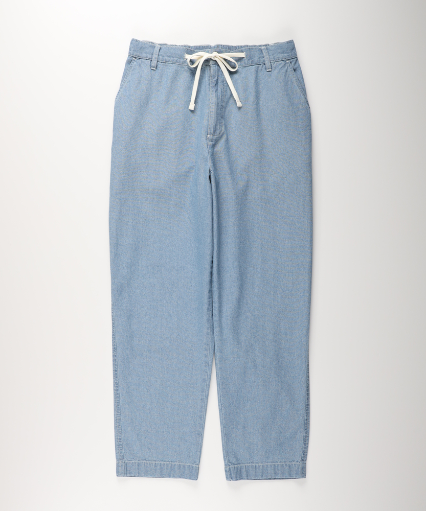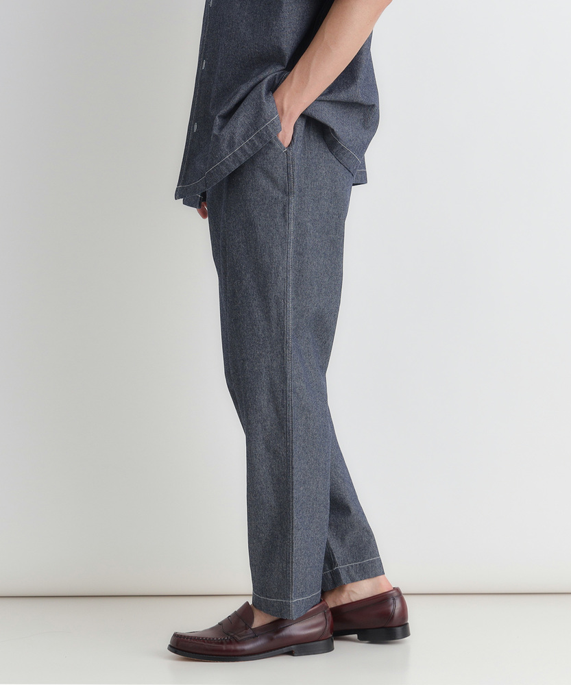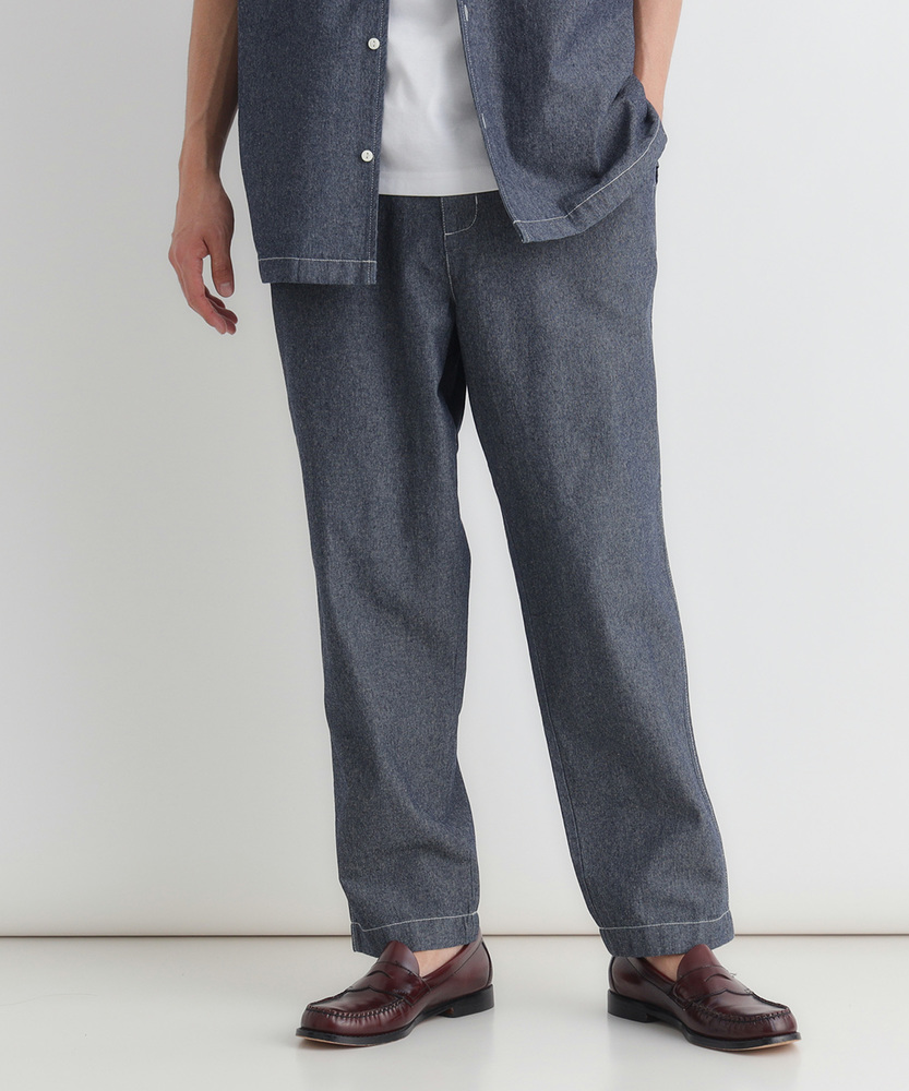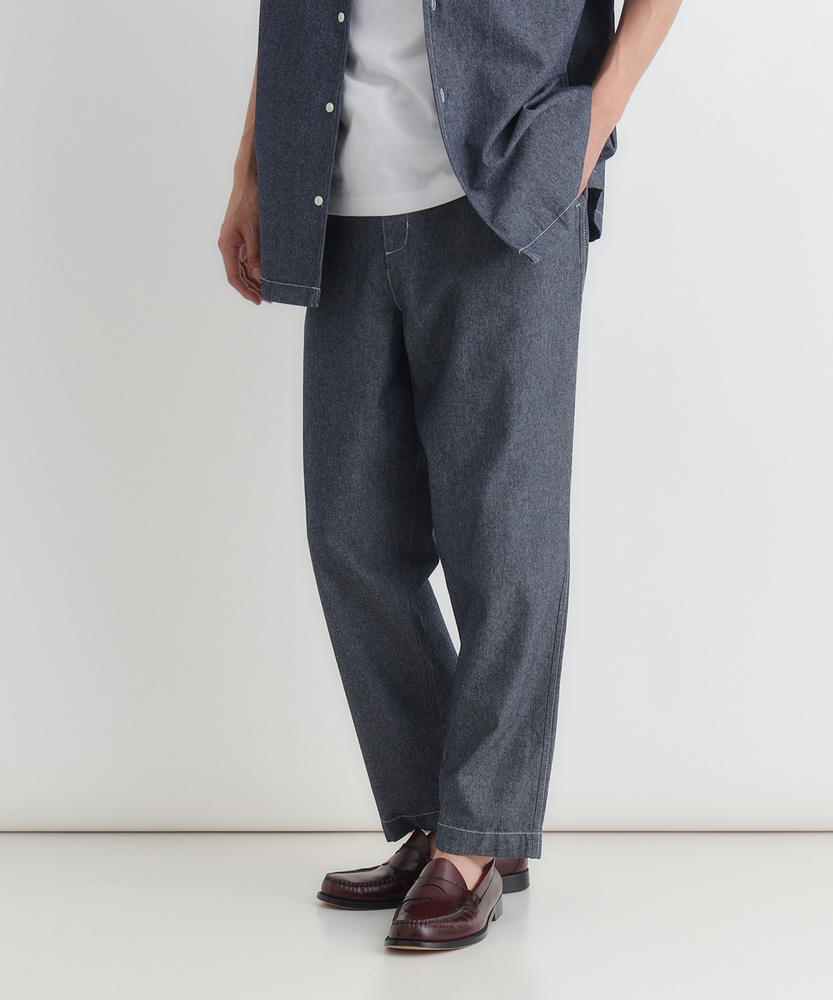 軽やかに穿きこなす、大人のサマーボトム。奥行きのある生地感がこなれた印象へ。リラックスと品格を備えたテーパードパンツ。■Point・豊かな表情のシャンブレー生地特有の霜降り状のムラ感。着るほどに肌に馴染みます。奥行きのある風合いが魅力。・肌に優しいコットン100%ナチュラルで柔らかな質感。通気性が良く快適な穿き心地。汗ばむ季節も爽やかに過ごせます。・絶妙なテーパードシルエットややゆとりのあるサイズ感。裾に向かって細くなるライン。リラックスしつつスッキリ見え。・快適なウエストデザインゴムを配したイージー仕様。お腹周りの窮屈感を軽減。休日のリラックスタイムにも。・アクセントになるディテール爽やかな白いドローコード。配色のステッチが抜け感を。さりげないワークテイスト。・着回しやすいデニムライクな色爽やかな淡色と落ち着いた濃色。幅広いトップスと好相性。大人のカジュアルダウンに最適。【仕様】ややゆとりのある腰回りから裾に向かって細くなる、美しいテーパードシルエットが特徴です。ウエストはゴム仕様に加え、白いドローコードが爽やかなアクセントに。ベルトループも備えており使い勝手も抜群。全体に施された白糸のステッチワークが程よい抜け感を生み、大人の日常に寄り添う洗練されたデザインに仕上がっています。【素材】肌触りの良い綿100%のシャンブレー生地を採用しています。特有の霜降り状のムラ感による、奥行きのある豊かな表情が最大の魅力。柔らかな質感で通気性にも優れ、汗ばむ季節も快適に着用いただけます。着るたびに肌に馴染み、風合いが増していく過程を楽しめる、ワードローブに長く置いておきたくなる素材感です。【スタイリング】シルエットの美しさを活かし、シンプルなTシャツやポロシャツを合わせるだけで、洗練された大人のカジュアルスタイルが完成します。ドローコードをあえて見せるように、トップスを軽くフロントタックインする着こなしもおすすめ。足元はスニーカーからレザーサンダルまで幅広くマッチし、休日のリラックスコーデに重宝します。 【セットアップで着用可能なアイテムはこちら】PL26101300061 シャンブレー半袖シャツ/セットアップ対応