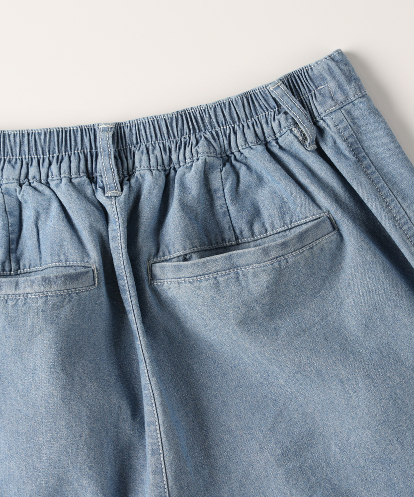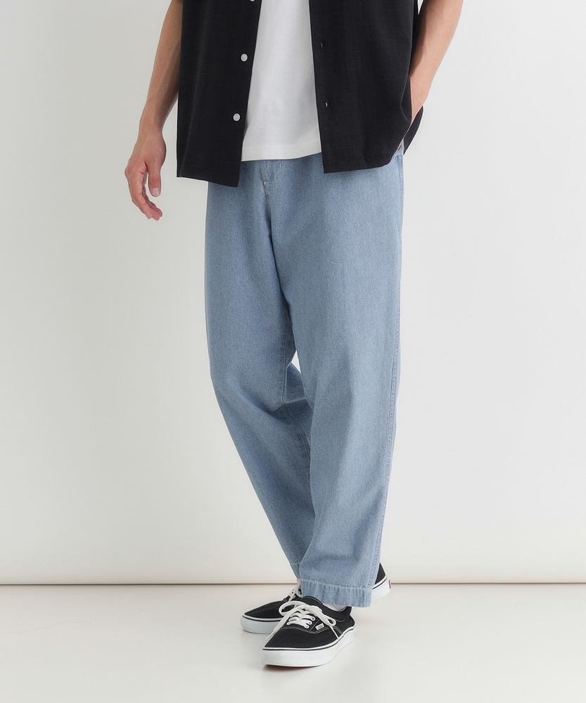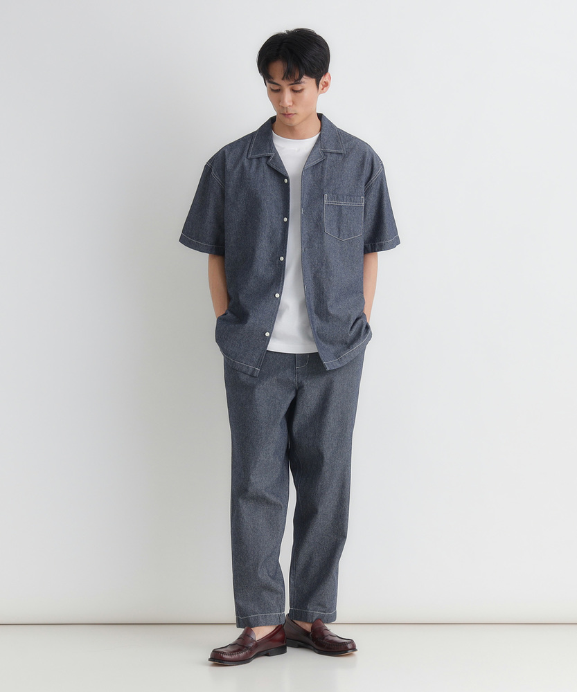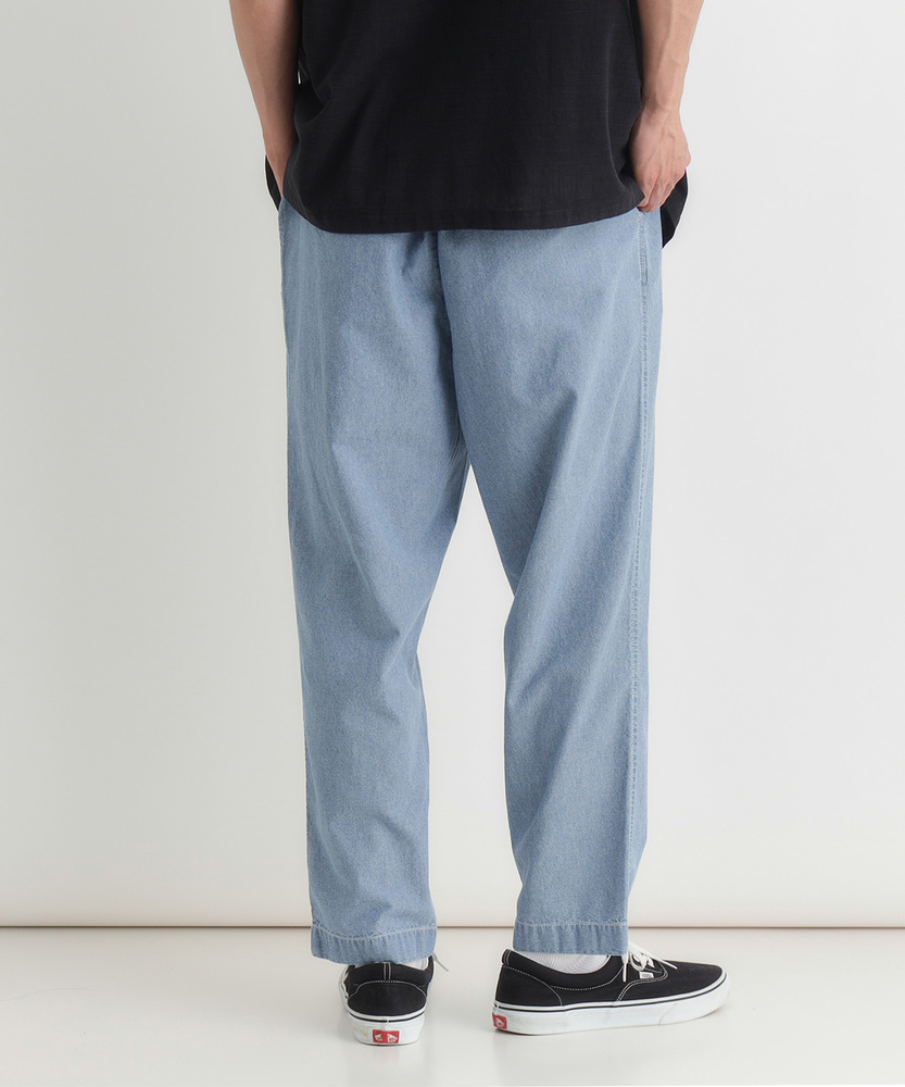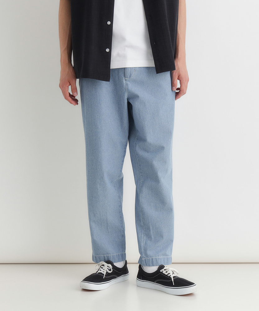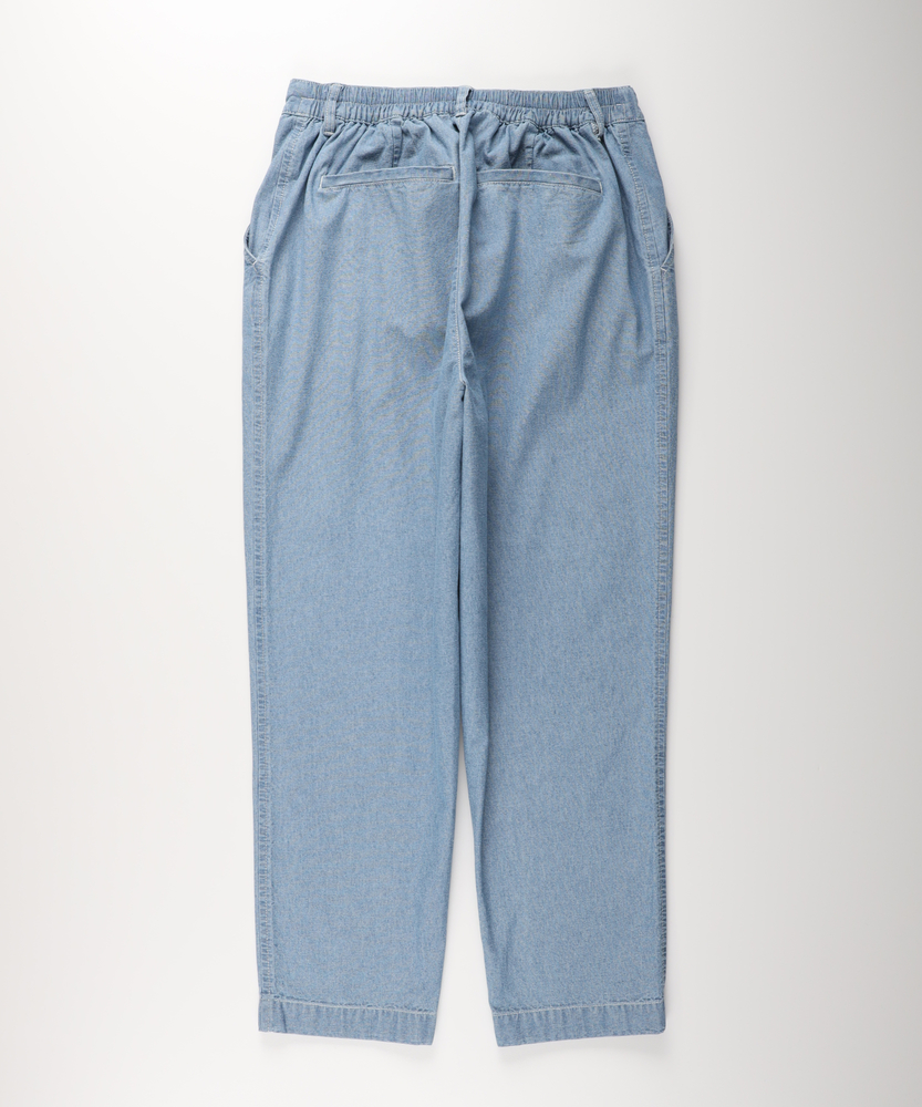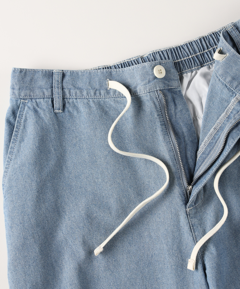 軽やかに穿きこなす、大人のサマーボトム。奥行きのある生地感がこなれた印象へ。リラックスと品格を備えたテーパードパンツ。■Point・豊かな表情のシャンブレー生地特有の霜降り状のムラ感。着るほどに肌に馴染みます。奥行きのある風合いが魅力。・肌に優しいコットン100%ナチュラルで柔らかな質感。通気性が良く快適な穿き心地。汗ばむ季節も爽やかに過ごせます。・絶妙なテーパードシルエットややゆとりのあるサイズ感。裾に向かって細くなるライン。リラックスしつつスッキリ見え。・快適なウエストデザインゴムを配したイージー仕様。お腹周りの窮屈感を軽減。休日のリラックスタイムにも。・アクセントになるディテール爽やかな白いドローコード。配色のステッチが抜け感を。さりげないワークテイスト。・着回しやすいデニムライクな色爽やかな淡色と落ち着いた濃色。幅広いトップスと好相性。大人のカジュアルダウンに最適。【仕様】ややゆとりのある腰回りから裾に向かって細くなる、美しいテーパードシルエットが特徴です。ウエストはゴム仕様に加え、白いドローコードが爽やかなアクセントに。ベルトループも備えており使い勝手も抜群。全体に施された白糸のステッチワークが程よい抜け感を生み、大人の日常に寄り添う洗練されたデザインに仕上がっています。【素材】肌触りの良い綿100%のシャンブレー生地を採用しています。特有の霜降り状のムラ感による、奥行きのある豊かな表情が最大の魅力。柔らかな質感で通気性にも優れ、汗ばむ季節も快適に着用いただけます。着るたびに肌に馴染み、風合いが増していく過程を楽しめる、ワードローブに長く置いておきたくなる素材感です。【スタイリング】シルエットの美しさを活かし、シンプルなTシャツやポロシャツを合わせるだけで、洗練された大人のカジュアルスタイルが完成します。ドローコードをあえて見せるように、トップスを軽くフロントタックインする着こなしもおすすめ。足元はスニーカーからレザーサンダルまで幅広くマッチし、休日のリラックスコーデに重宝します。 【セットアップで着用可能なアイテムはこちら】PL26101300061 シャンブレー半袖シャツ/セットアップ対応