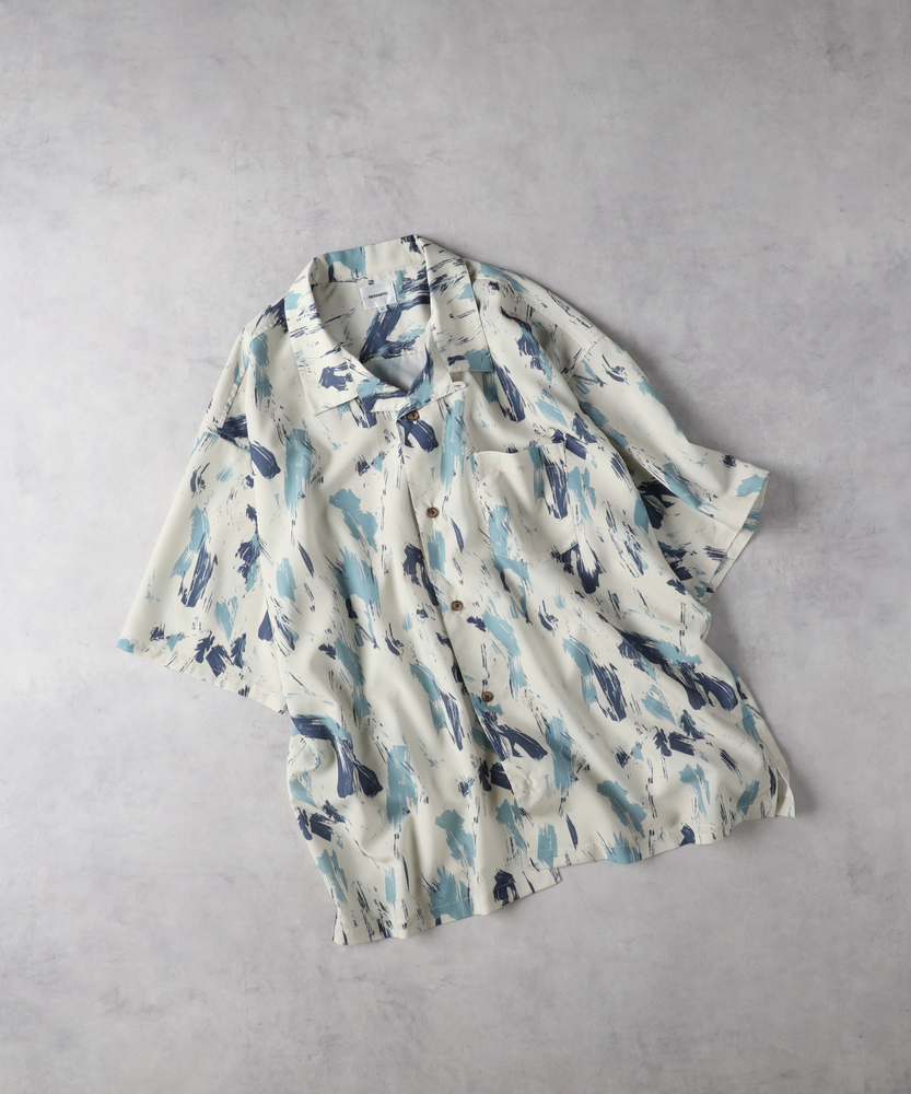 【仕様】古着であるような幾何学柄の総プリントの開襟シャツ。柔らかな色合いとダイナミックな模様が、シンプルなスタイルにも華やかさをプラス。ボタン留めのクリーンなフロントスタイルが、都会的な洗練さを演出します。【素材】軽やかで滑らかな素材は、通気性が良く、快適な着心地を提供します。動きに合わせて流れるようなファブリックは、日常のコーディネートでも特別感を味わえる一枚です。【スタイリング】デニムやリネンパンツと合わせたカジュアルスタイルがオススメ。オーバーサイズでリラックス感を演出し、足元はスニーカーやスライドサンダルで軽やかに仕上げて。日中の散策やリゾートシーンにもぴったりのアイテムです。