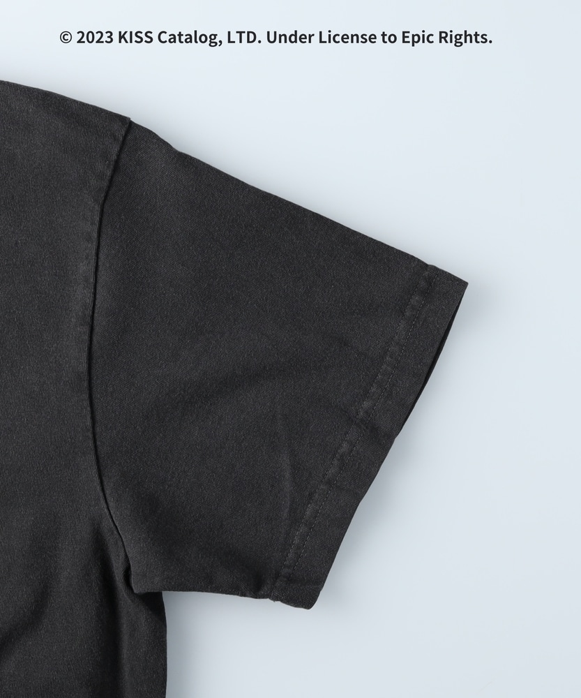 KISSのグラフィックをプリントしたTシャツ。顔料染めをすることで、古着のような風合いに仕上げています。