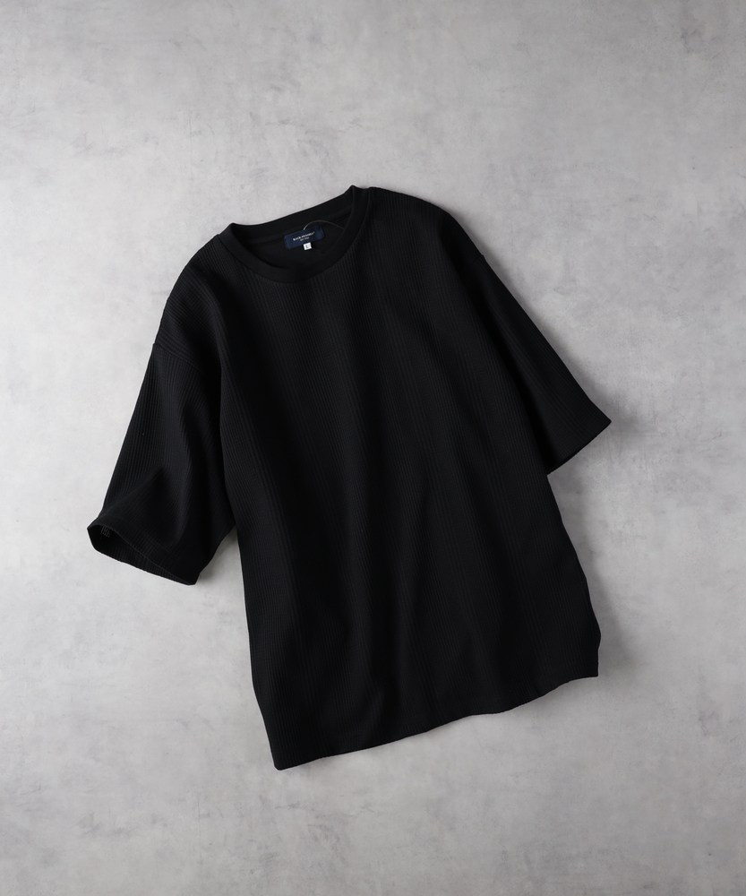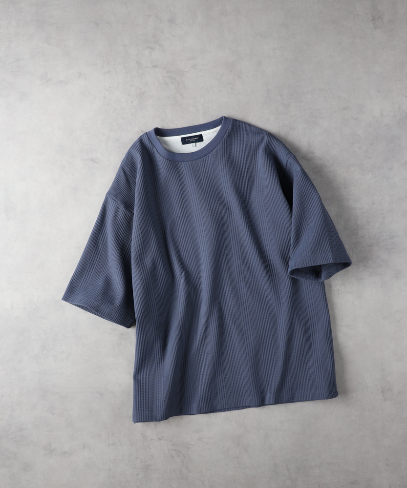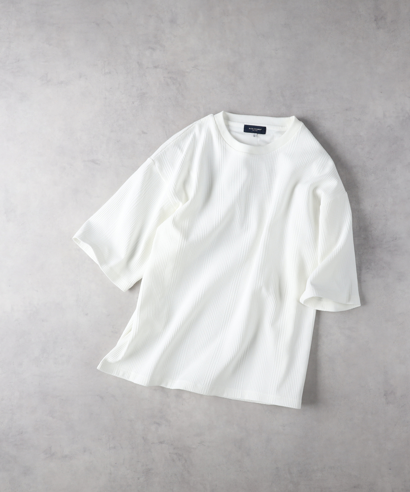 【仕様】クルーネックのワッフル半袖Tシャツは、ゆったりとしたシルエットでリラックスした印象を与えます。独自のワッフル編みが、遊び心のあるテクスチャを演出。シンプルながらも存在感があり、デイリーコーデに活躍する一着です。【素材】 TCワッフル素材を使用し、通気性と快適な着心地を実現。柔らかな肌触りで、春夏シーズンにも最適です。軽やかな印象ながら、しっかりとした生地感がカジュアルスタイルを引き立てます。 【スタイリング】 ワイドパンツやデニムと合わせて、リラックススタイルを楽しむのがオススメ。シンプルなスニーカーやサンダルで、デイリーユースにぴったりなスタイルを完成させましょう。