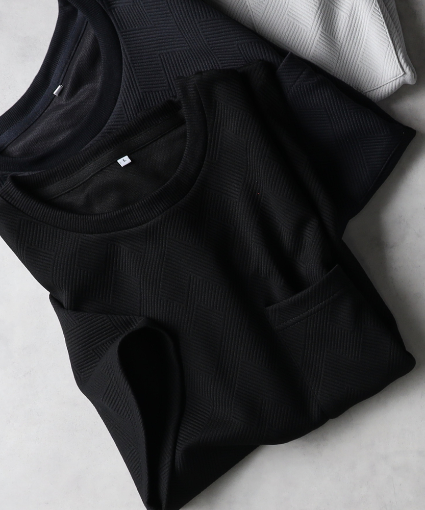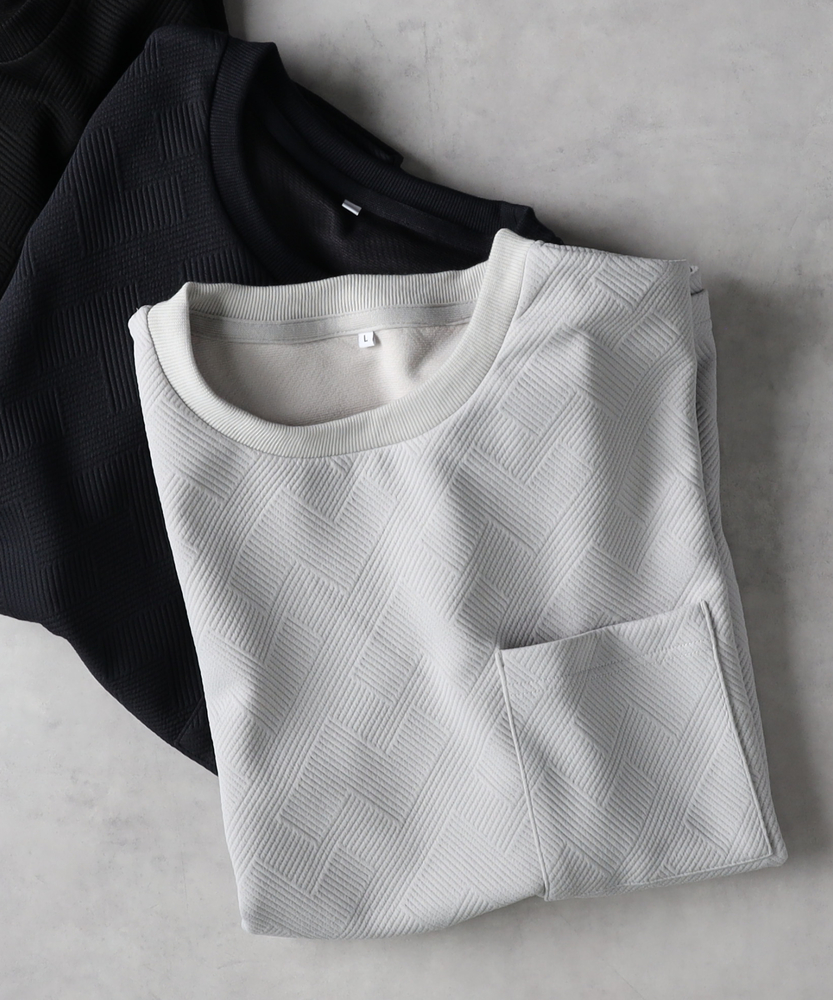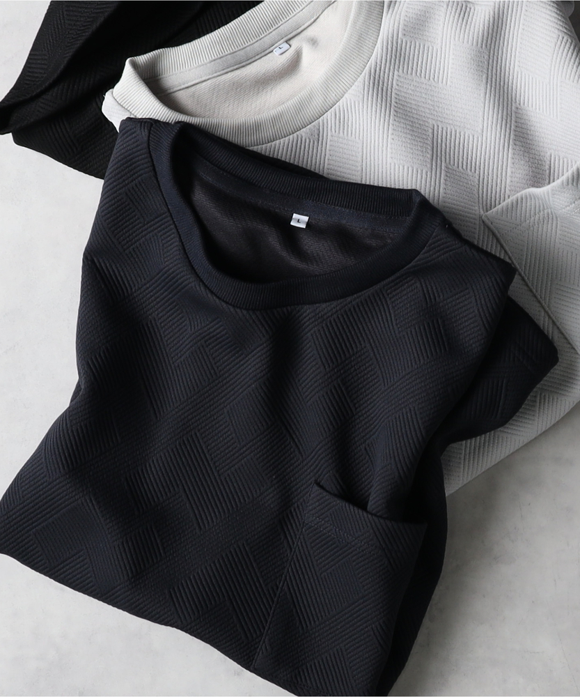 【仕様】幾何学柄の膨れジャガードを使用したTシャツは、程よいゆったり感が心地よいシルエット。シンプルながらも印象的なデザインが、スタイリングにさりげないアクセントを加えます。【素材】 独特なテクスチャーの膨れジャガード素材が魅力。軽やかで通気性に優れ、デイリーユースにぴったりです。肌触りも柔らかく、長時間着用しても快適な着心地を実現しています。 【スタイリング】 ゆったりしたシルエットは、タイトなボトムスやデニムと合わせてバランスよくコーディネート。アクセサリーやシューズで遊び心をプラスしたスタイルが楽しめます。シンプルな中にも、洗練された印象を与える一枚です。