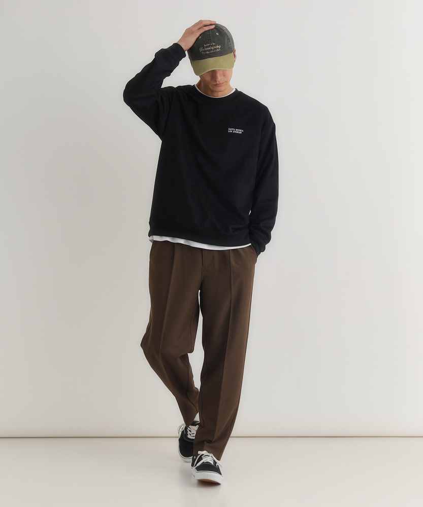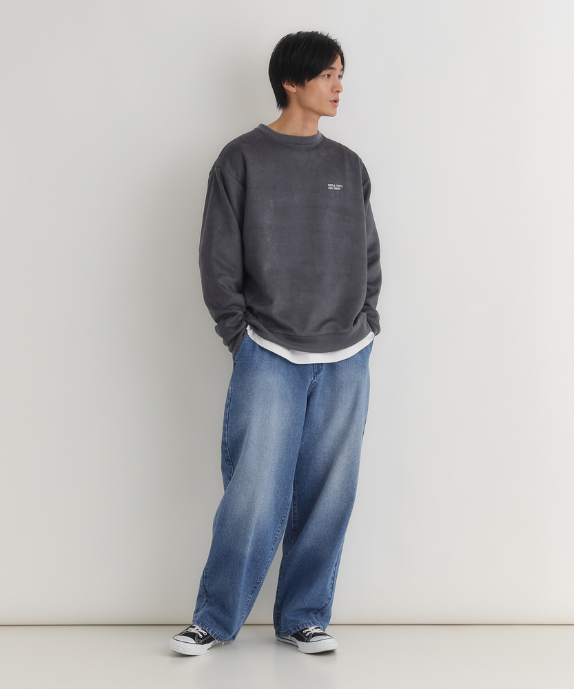 【仕様】ゆったりとしたシルエットで仕上げられたこのトレーナーは、カジュアルなスウェード素材が特徴です。着丈は通常のスウェットよりも長めに設定されており、全体的にリラックスした印象を与えます。シンプルなロゴデザインがさりげなく品の良さをプラスし、カジュアルながらも洗練されたスタイルを実現します。【素材】 柔らかなフェイクスエードを使用しており、肌触りは快適でありながらも、しっかりとした質感が魅力です。この素材は、カジュアルな印象を保ちながらも、品のある微光沢を醸し出すため、デイリー使いから特別なシーンまで幅広く活躍します。 【スタイリング】 シンプルなパンツやデニムと合わせてカジュアルスタイルを楽しむのはもちろん、アウターやシューズを工夫することで、さまざまな印象のコーディネートが可能です。特に、エレガントなアクセサリーやシャープなシューズを合わせることで、リラックスした中にもモダンな印象を与えることができる一枚です。