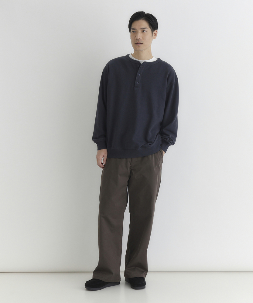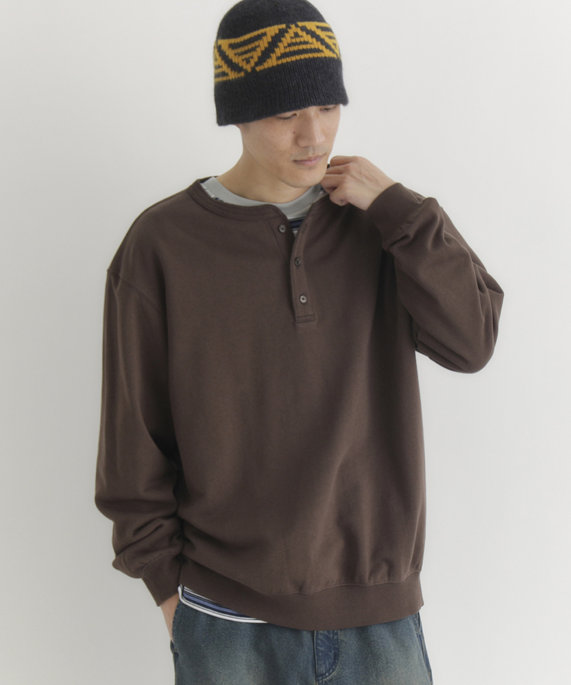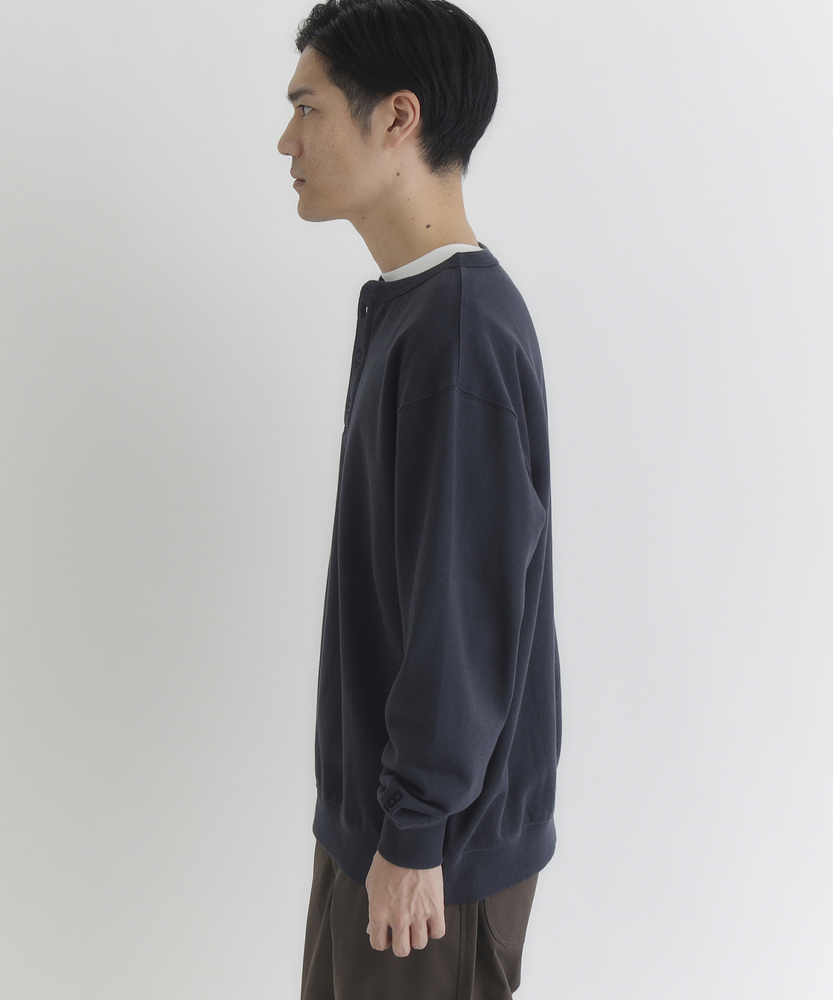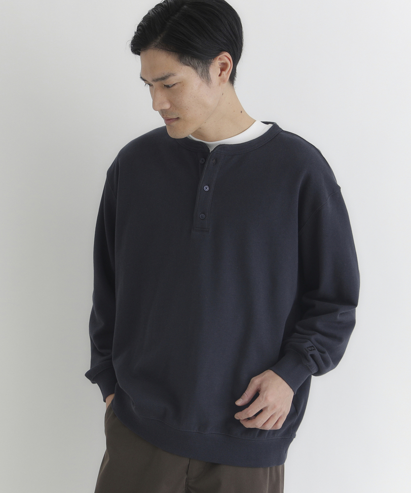【仕様】シンプルでありながら、存在感のあるヘンリーネックプルオーバー。ややゆったりとしたシルエットがカジュアルさを演出し、ボタン付きのネックラインが独自のアクセントとなっています。シンプルなデザインながら、洗練された印象を与えます。【素材】 ヘビーオンスの綿100%裏毛素材を使用し、しっかりとした生地感が特徴。保温性が高く、肌触りも柔らかいので、快適な着心地が持続します。日常使いにぴったりなアイテムです。 【スタイリング】 カジュアルなパンツと合わせて、リラックスしたストリートスタイルを楽しむのがおすすめ。足元はスニーカーやワークブーツを選ぶことで、カジュアルながらも洗練された印象を与えます。