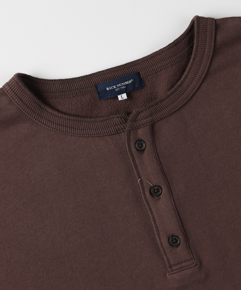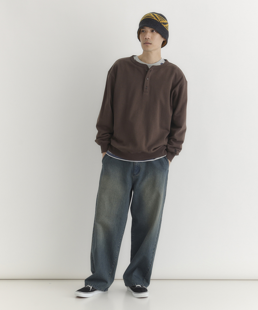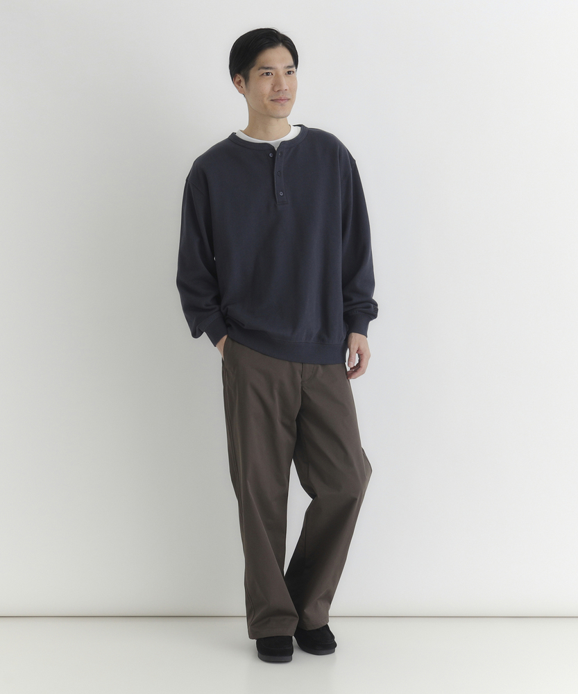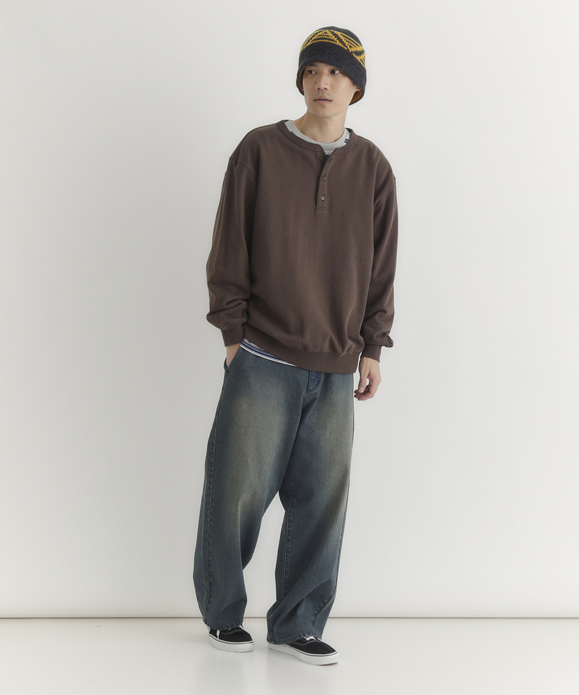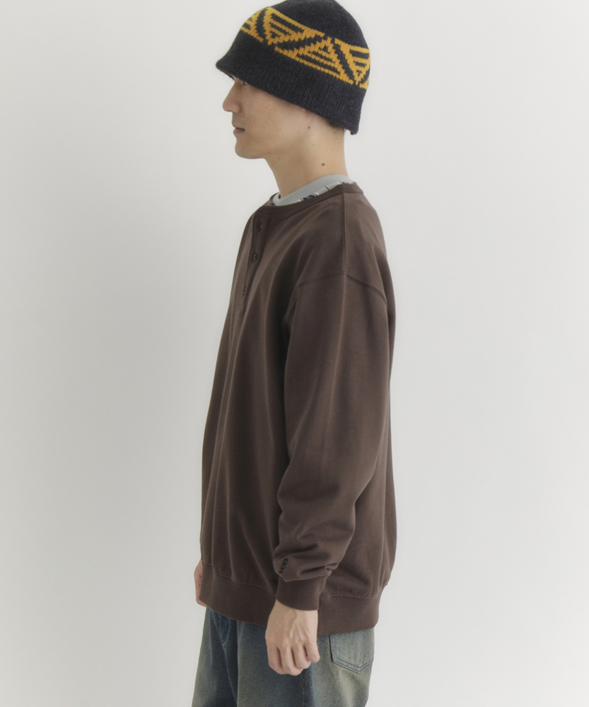 【仕様】シンプルでありながら、存在感のあるヘンリーネックプルオーバー。ややゆったりとしたシルエットがカジュアルさを演出し、ボタン付きのネックラインが独自のアクセントとなっています。シンプルなデザインながら、洗練された印象を与えます。【素材】 ヘビーオンスの綿100%裏毛素材を使用し、しっかりとした生地感が特徴。保温性が高く、肌触りも柔らかいので、快適な着心地が持続します。日常使いにぴったりなアイテムです。 【スタイリング】 カジュアルなパンツと合わせて、リラックスしたストリートスタイルを楽しむのがおすすめ。足元はスニーカーやワークブーツを選ぶことで、カジュアルながらも洗練された印象を与えます。