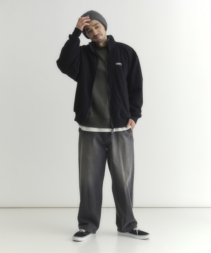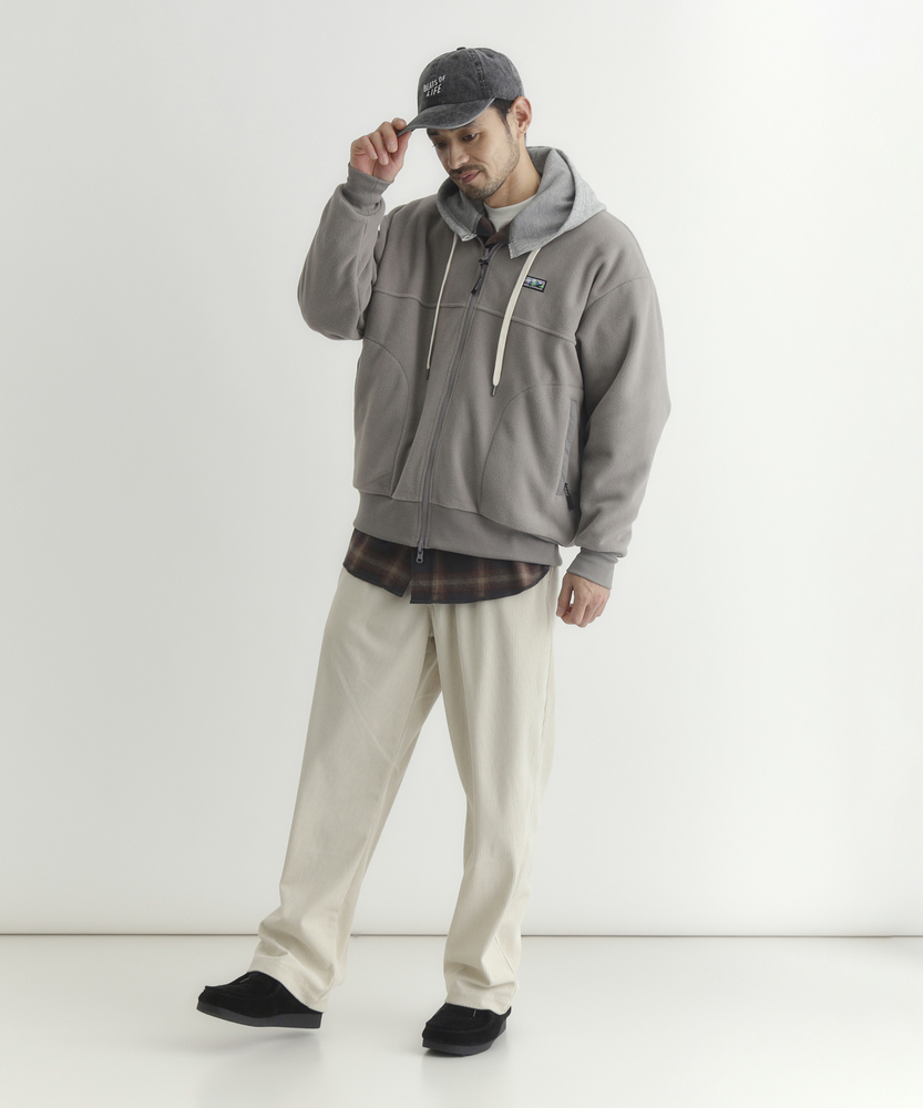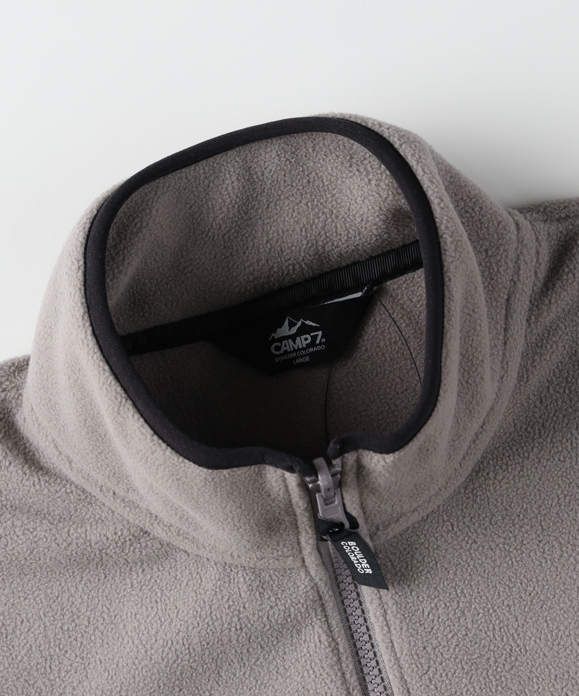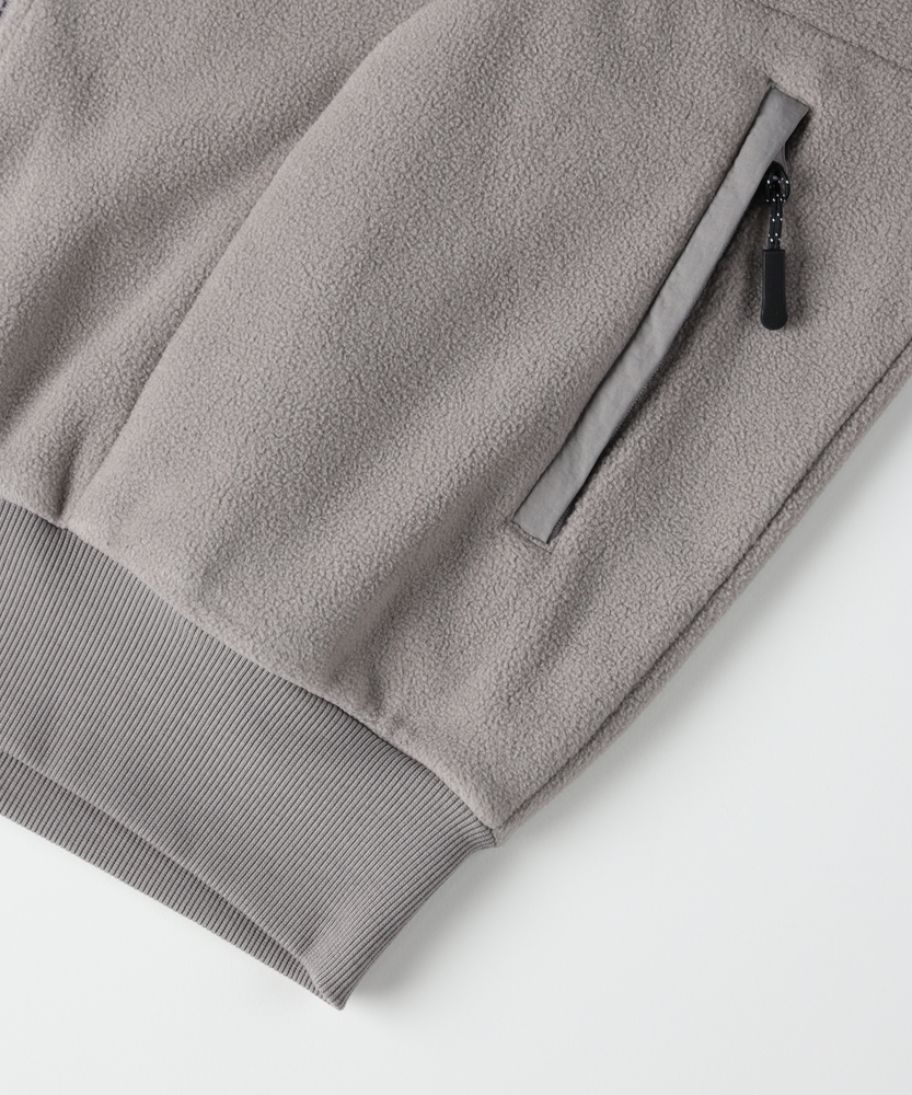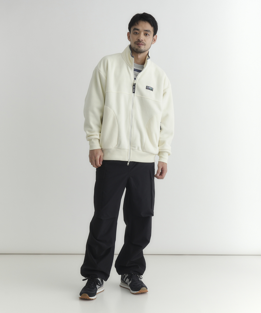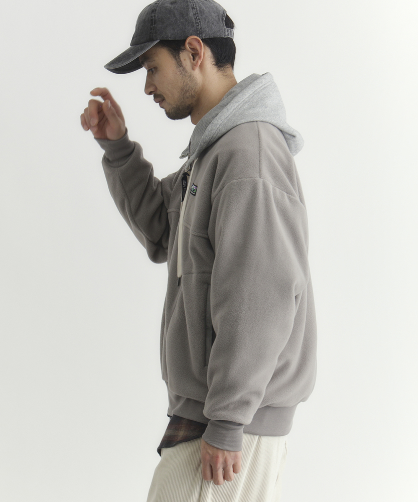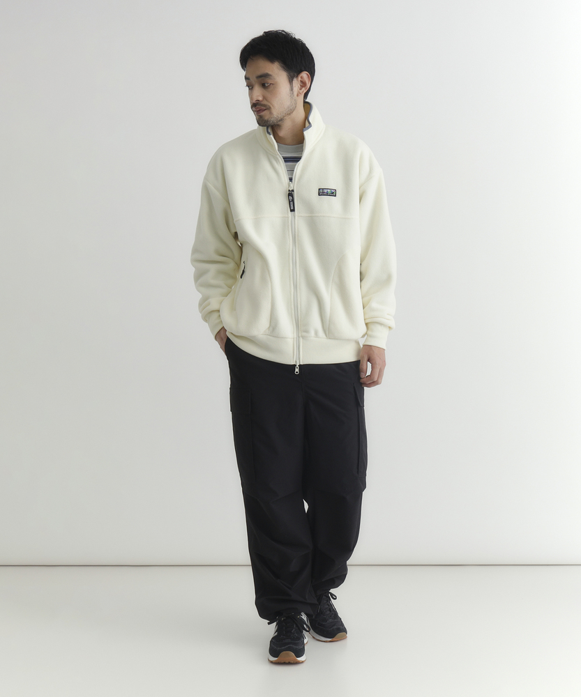 【仕様】スタンドカラーのフルジップにコントラストパイピングと小さなロゴワッペンを配した、ややボックスのリラックスシルエット。ドロップショルダーとラウンドポケットが都会的な抜け感を生み、ツーウェイジップとリブ裾で着丈調整と防寒性を両立します。【素材】 軽く密なマイクロフリースを採用し、見た目よりも軽量で高い保温性を実現。ふんわりとした肌触りでレイヤード時のごわつきが少なく、毛羽立ちを抑えた表面感がクリーンな印象を保ちます。 【スタイリング】 細めのチノやテーパードデニムと合わせ、インに薄手ニットやシャツを仕込めば洗練されたカジュアルに昇華。スニーカーやミニマルなレザーで引き締め、肩の力の抜けた都会的スタイルに。