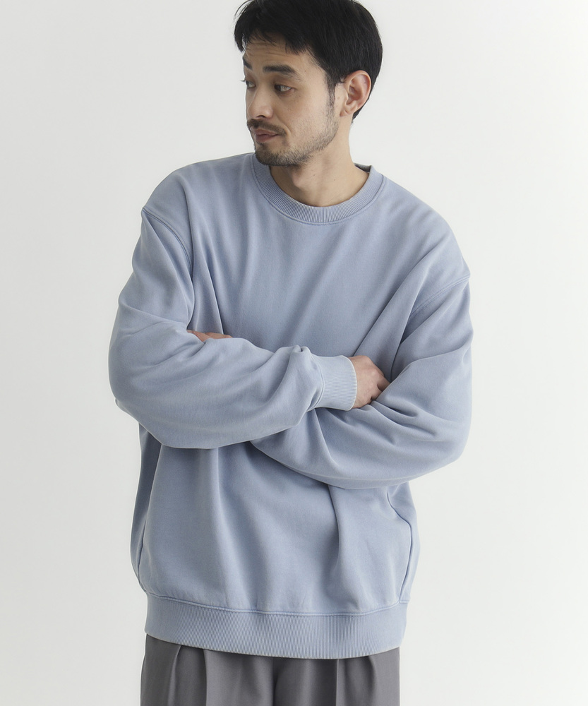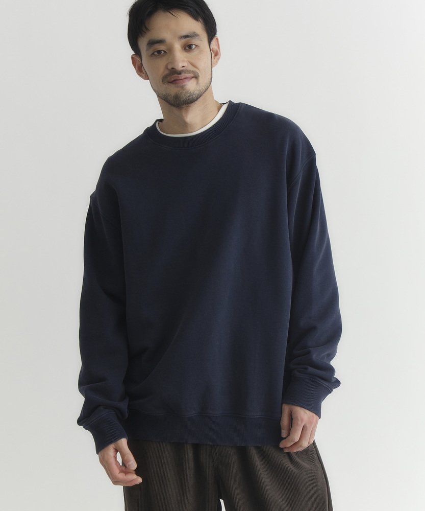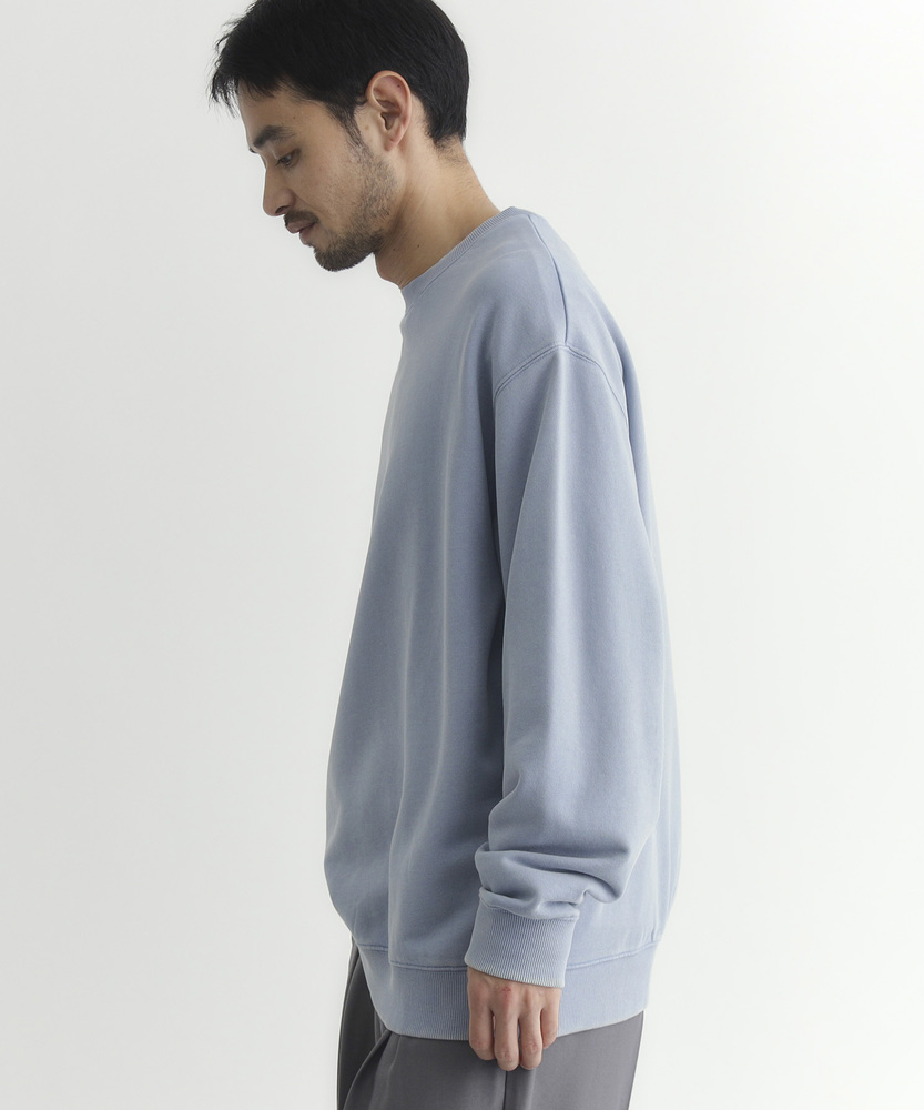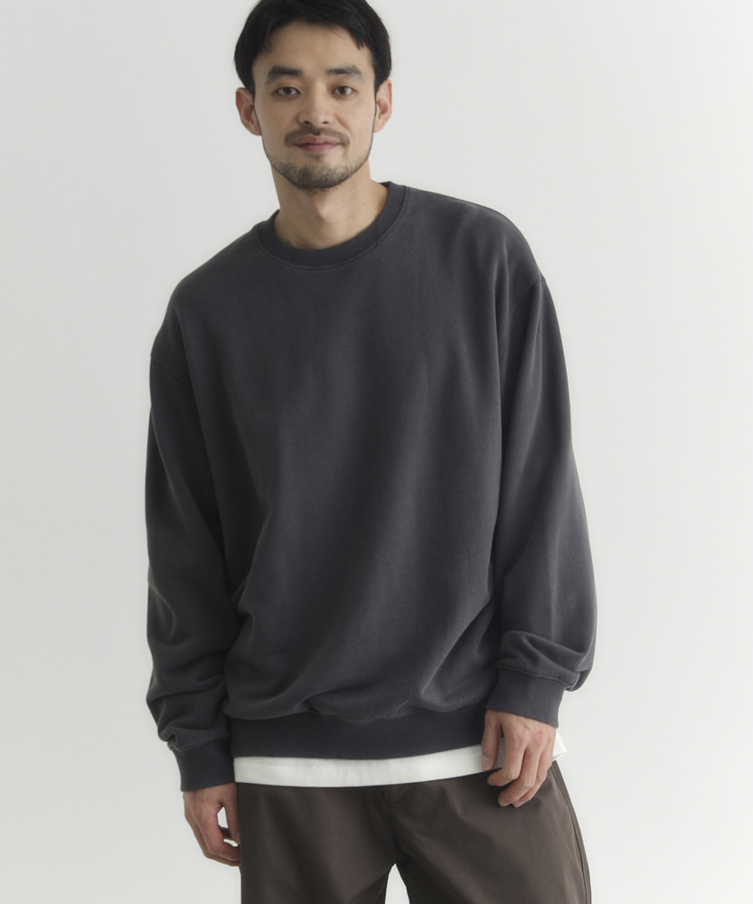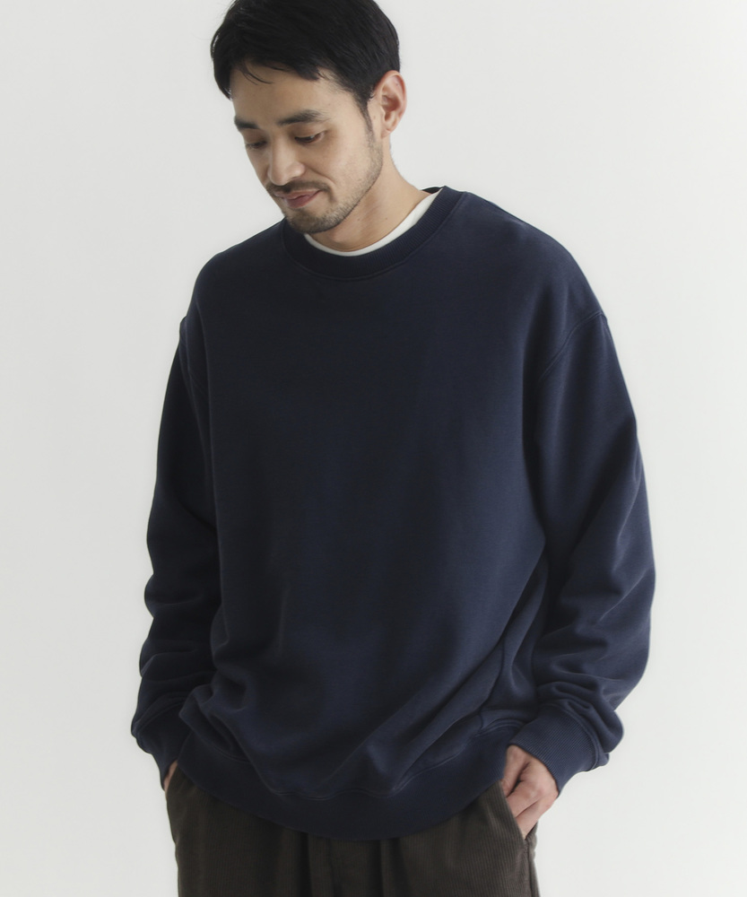【仕様】ドロップショルダーとややボックスシルエットで肩まわりは自然に落ちる設計。リブのネックと裾でさりげなく引き締め、サイドの切り替えが腰まわりに程よい余裕を生み出す、洗練されたカジュアルフォルムです。【素材】 ピグメント加工が生むマットな表情と程よい色ムラが特徴。中肉の裏毛は保温と通気を両立し、洗いを重ねるごとに柔らかく馴染みます。度詰めの生地感で型崩れしにくく、長く着られる作りです。 【スタイリング】 テーパードスラックスでクリーンに、太めデニムでリラックス感を出すのが好相性。軽いコートやブルゾンのインにも収まるので、週末から通勤まで幅広く活躍します。スニーカーでも革靴でも決まる一着。