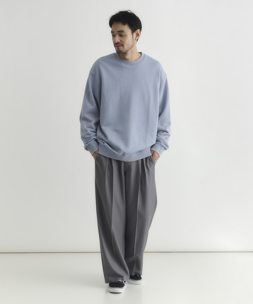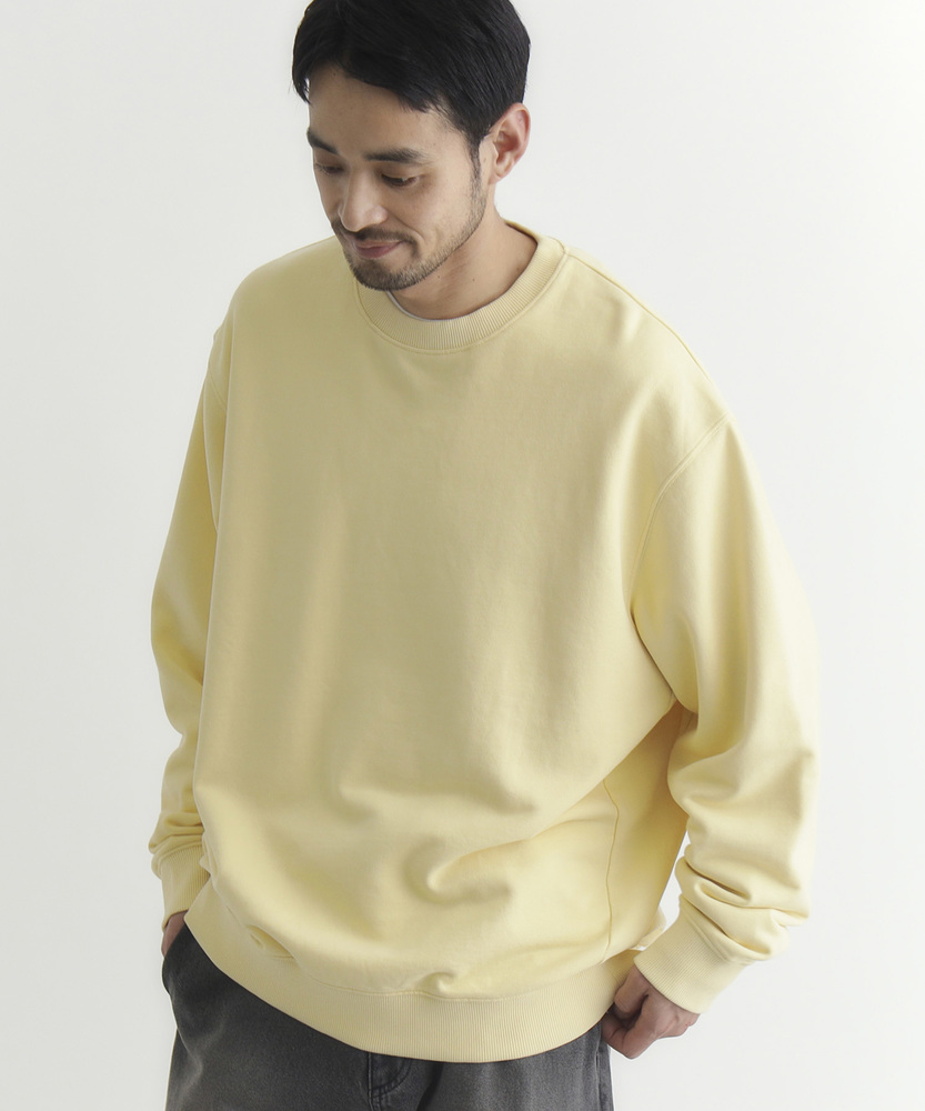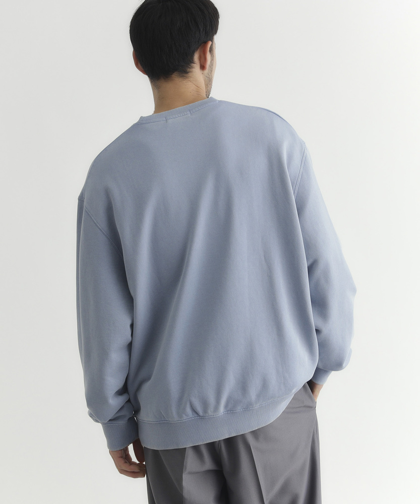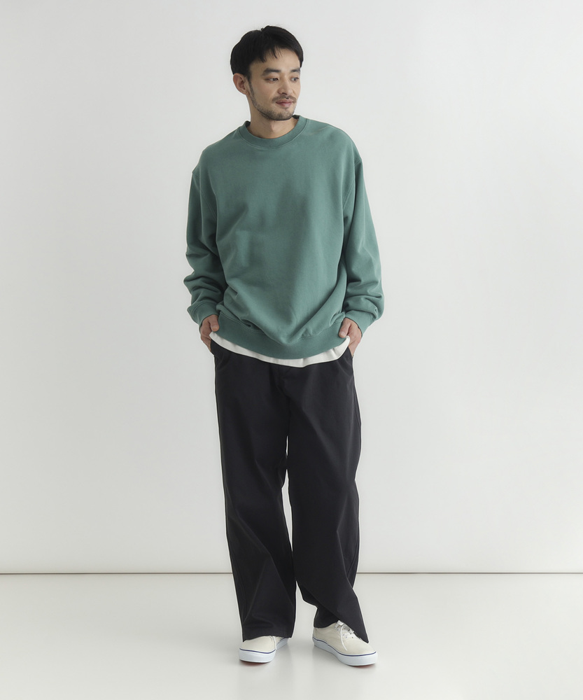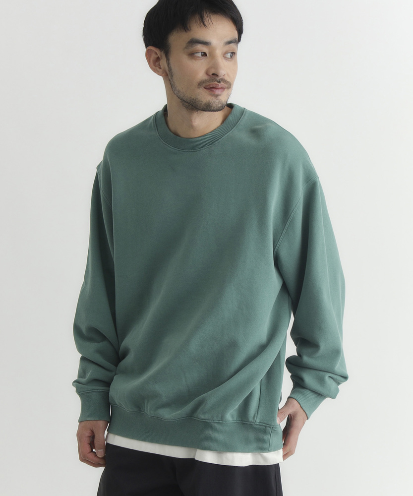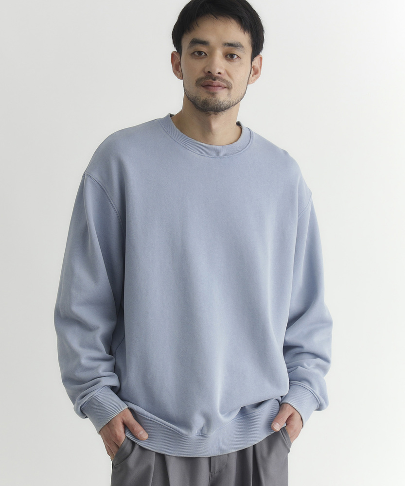 【仕様】ドロップショルダーとややボックスシルエットで肩まわりは自然に落ちる設計。リブのネックと裾でさりげなく引き締め、サイドの切り替えが腰まわりに程よい余裕を生み出す、洗練されたカジュアルフォルムです。【素材】 ピグメント加工が生むマットな表情と程よい色ムラが特徴。中肉の裏毛は保温と通気を両立し、洗いを重ねるごとに柔らかく馴染みます。度詰めの生地感で型崩れしにくく、長く着られる作りです。 【スタイリング】 テーパードスラックスでクリーンに、太めデニムでリラックス感を出すのが好相性。軽いコートやブルゾンのインにも収まるので、週末から通勤まで幅広く活躍します。スニーカーでも革靴でも決まる一着。