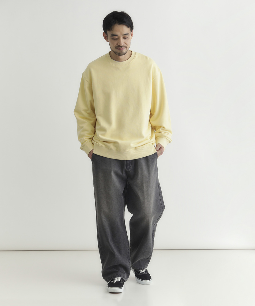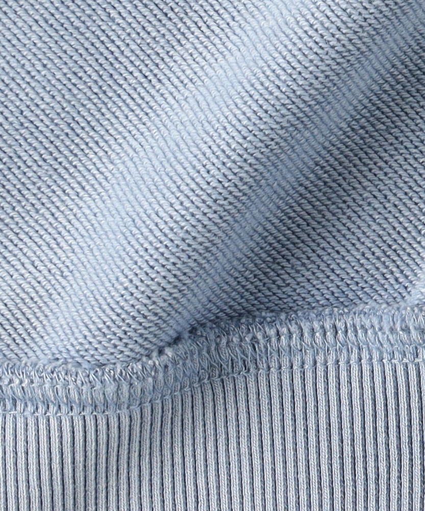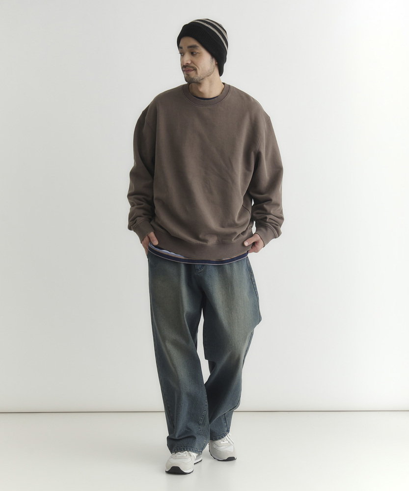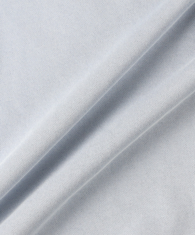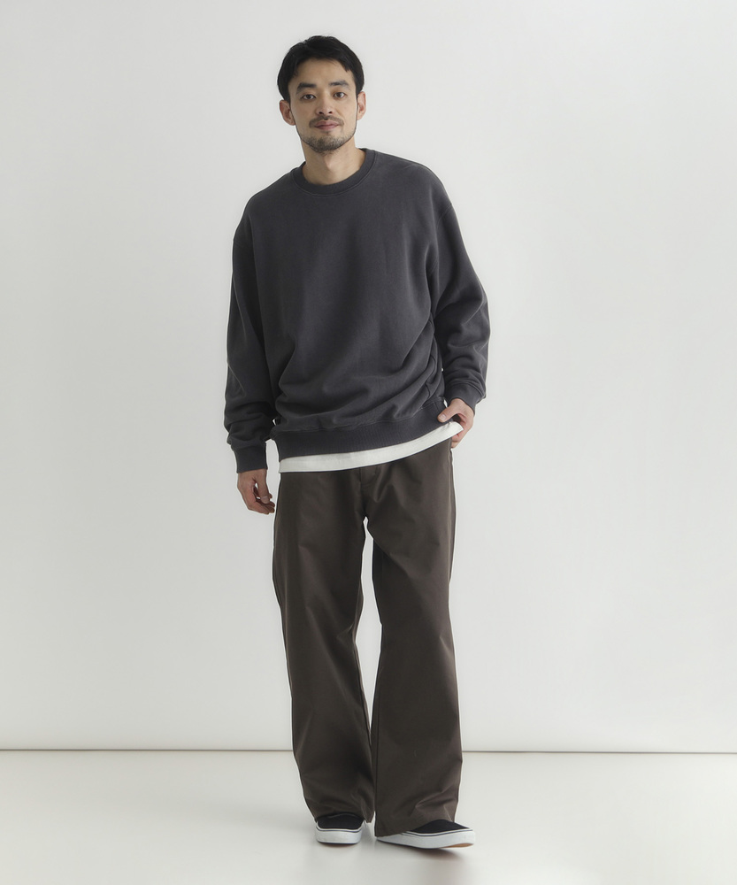 【仕様】ドロップショルダーとややボックスシルエットで肩まわりは自然に落ちる設計。リブのネックと裾でさりげなく引き締め、サイドの切り替えが腰まわりに程よい余裕を生み出す、洗練されたカジュアルフォルムです。【素材】 ピグメント加工が生むマットな表情と程よい色ムラが特徴。中肉の裏毛は保温と通気を両立し、洗いを重ねるごとに柔らかく馴染みます。度詰めの生地感で型崩れしにくく、長く着られる作りです。 【スタイリング】 テーパードスラックスでクリーンに、太めデニムでリラックス感を出すのが好相性。軽いコートやブルゾンのインにも収まるので、週末から通勤まで幅広く活躍します。スニーカーでも革靴でも決まる一着。