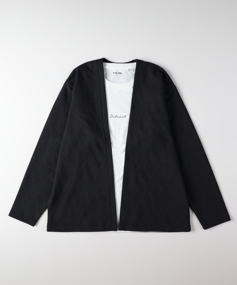 大人のための最適解セット。羽織るだけで、奥行きのある表情を演出。届いたその日から、洗練された休日スタイルが完成します。■Point・迷わず決まる「セットの完成度」計算されたバランスのカーディガンとTシャツ。組み合わせに悩む朝の時間も、これ一つで解決。テクニック要らずで、こなれたレイヤードスタイルが完成します。・主張しすぎない「ロゴデザイン」インナーのTシャツは、繊細な筆記体ロゴを中央に配置。ジャケットや他のアウターのインナーとしても映えるデザイン。子供っぽさを排除した、大人のためのロゴTです。・抜け感を作る「ボタンレス」フロントボタンを排除したトッパータイプのデザイン。さっと羽織るだけで様になり、リラックス感のあるシルエットに。カーディガン特有の野暮ったさを消し、スタイリッシュな印象を与えます。・着回し自在な「セパレート使い」それぞれが主役級のクオリティを持つアイテム。カーディガンはシャツの上に、Tシャツは夏の一枚着に。季節を越えて、ワードローブの核として活躍します。【デザイン】ダイヤ柄のような凹凸を持つジャガードカーディガンは、光の陰影で豊かな表情を見せます。ボタンのないトッパー型を採用することで、縦のラインを強調し、スタイルアップ効果と都会的な抜け感を両立。セットのTシャツは、胸元の華奢なロゴがアクセントになり、シンプルながらも洗練された印象を与えます。【素材】アウターは、シワになりにくく適度な伸縮性のある生地。表面の凹凸が肌への張り付きを抑え、さらりとした着心地です。インナーは吸湿性と速乾性のバランスが良い天竺素材を使用し、素肌に触れても快適な肌触りを実現しました。【着こなしポイント】セットで着用し、細身の黒スキニーやデニムと合わせれば、清潔感のある大人の休日コーデが即完成します。足元はレザースニーカーやローファーで引き締めるとより効果的。カーディガンは春先のライトアウターとして、Tシャツは夏場の主役として、それぞれ単体でも幅広いスタイリングを楽しめます。