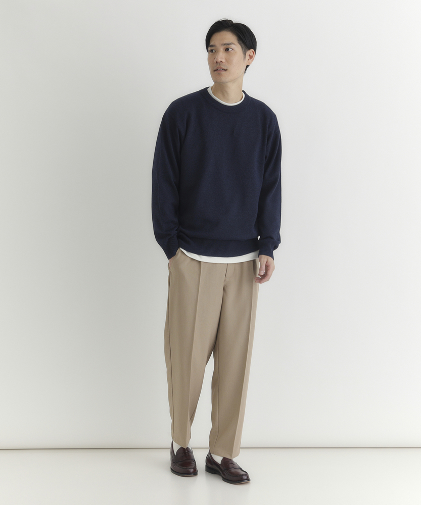 迷ったらコレ!「マシンウォッシャブル」「抗ピリング」機能でお手入れ簡単。程よい厚さで3シーズン着用できるニット。ウールのチクチク感も無く柔らかく軽い着心地なのでニットが苦手な方にもおすすめの一着。少しゆとりのあるベーシックな形で幅広いコーディネートで活躍します。大人の1ランク上のカジュアルスタイルに。■Point・ニットのチクチクが気になる方も安心の着心地。・ご家庭でのお手入れが簡単。・少しとりのあるシルエットで大人の方も着て頂きやすく。・ベーシックな表情のニットはどんなコーデにも合うマストアイテム。【仕様】クルーネックの潔いネックラインと程よくゆったりしたドロップショルダー。装飾を削ぎ落したミニマルなフォルムにリブの引き締めが洗練された均衡を生み、オンオフ問わず手持ちの軸になり、レイヤードのベースとしても優秀です。【素材】 ポリナイロンの編み地は微光沢と滑らかなタッチでクリーンな表情。軽さと保温性のバランスに優れ、透けや型崩れ、毛玉が抑えられるためデイリーに頼れる一枚に仕上がっています。 【スタイリング】 ややゆったりした身幅はテーパードパンツで引き締めると都会的。シャツを重ねて襟を覗かせれば清潔感あるオフィスカジュアルに。足元はレザーまたはクリーンスニーカーで整え、小物は細身のベルトや腕時計で締めると完成度が高まります。