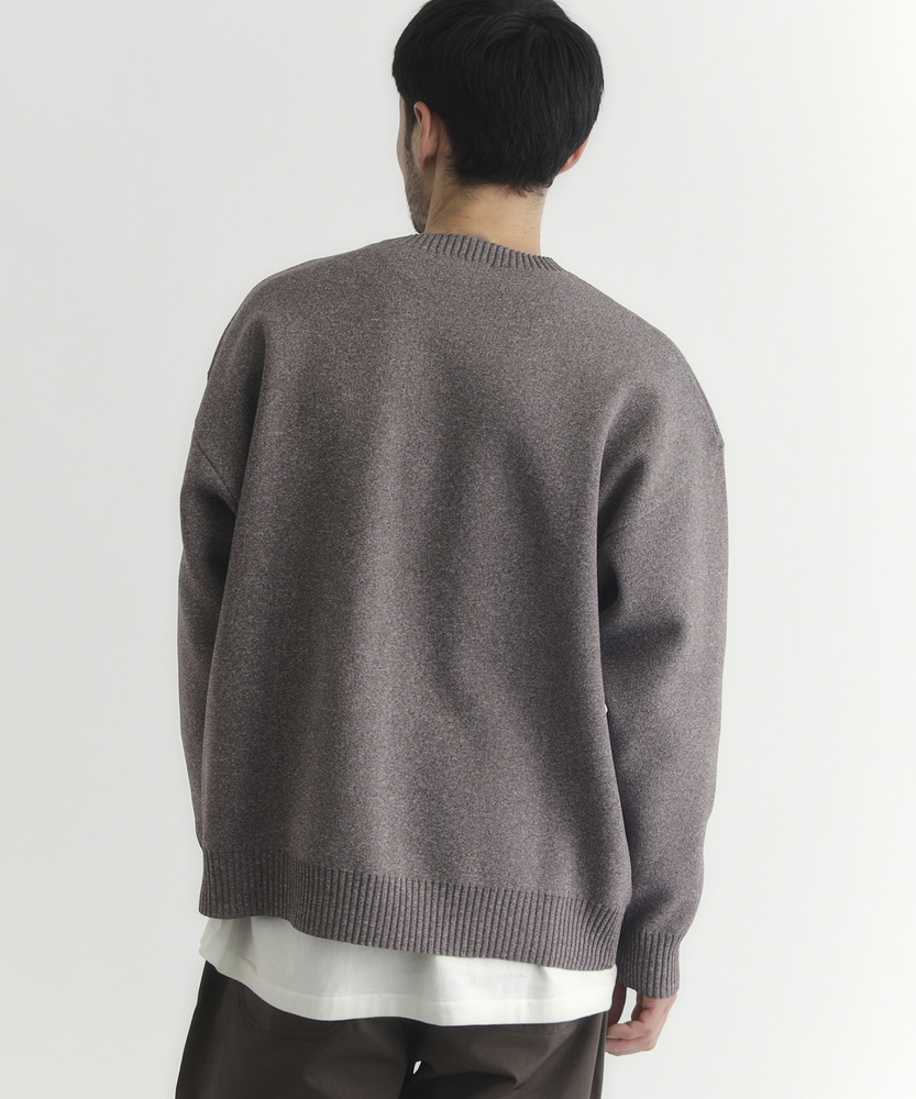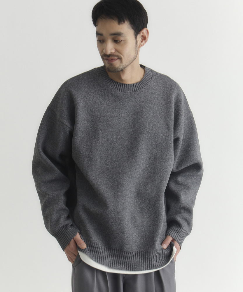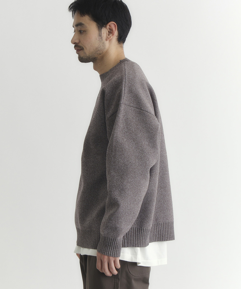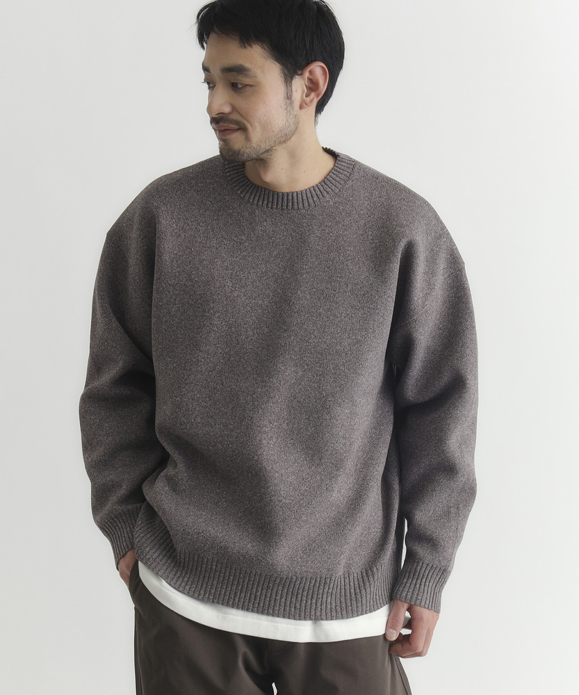 【仕様】ゆったりとしたボックスシルエットのクルーネック。ドロップショルダーと短めの着丈で身幅に余裕を持たせ、リブで端正に仕上げた都会的な一枚です。メランジの控えめな表情が洗練された抜け感を生みます。【素材】 柄のように見えるMIX糸を用いた特殊な編地と軽量ポリエステルの組み合わせで、立体感のある表情と高い復元性を実現。軽やかで日常使いしやすく、マシンウォッシャブルでお手入れも簡単。 【スタイリング】 短め丈を生かしてハイウエストのトラウザーやテーパードパンツと合わせ、モダンな比率に。オーバーコートやシャツとのレイヤードもすっきり決まり、スニーカーやレザーシューズで表情を変えて。