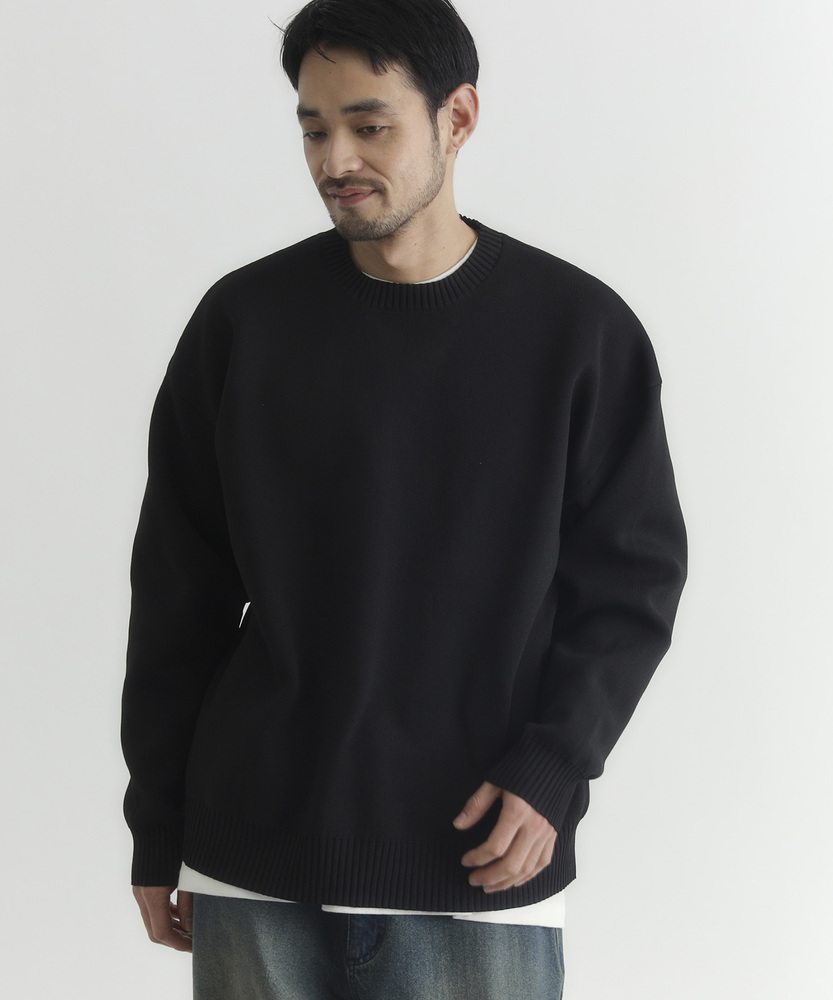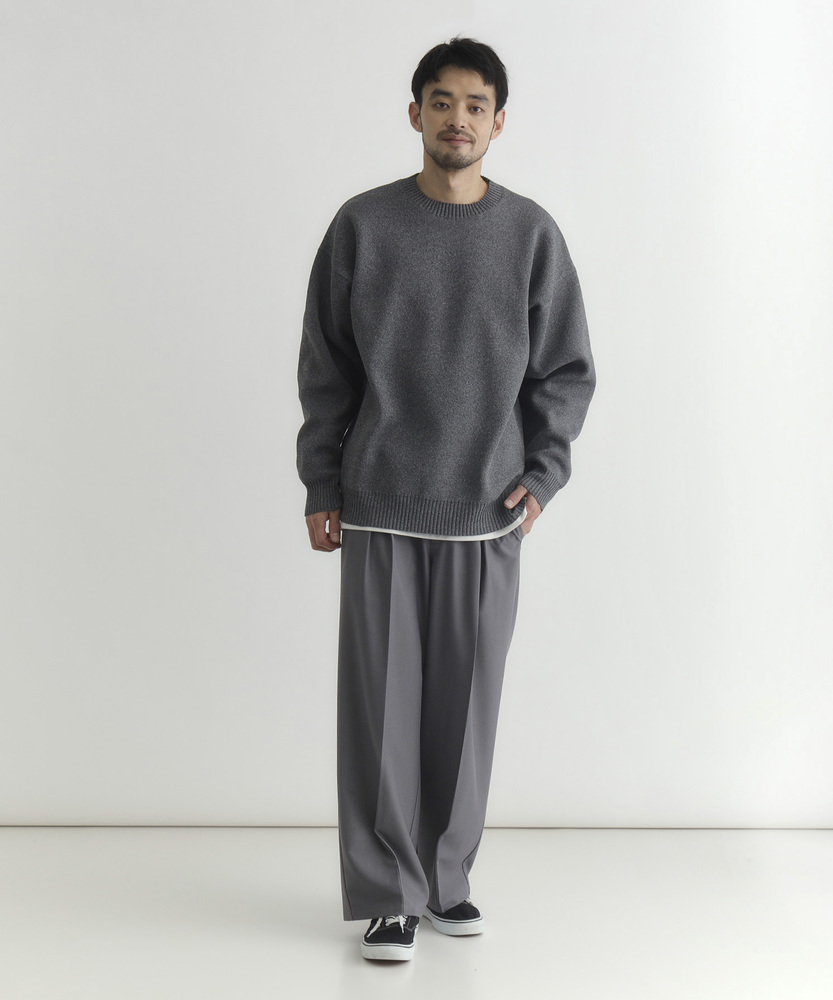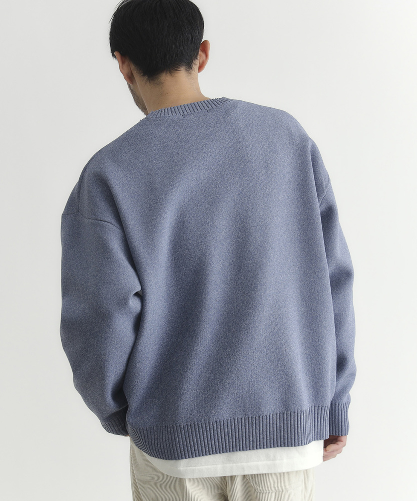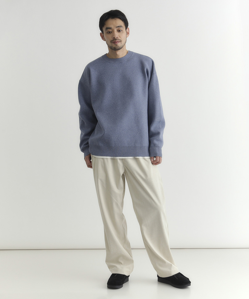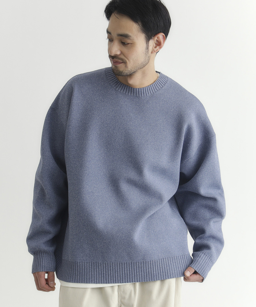 【仕様】ゆったりとしたボックスシルエットのクルーネック。ドロップショルダーと短めの着丈で身幅に余裕を持たせ、リブで端正に仕上げた都会的な一枚です。メランジの控えめな表情が洗練された抜け感を生みます。【素材】 柄のように見えるMIX糸を用いた特殊な編地と軽量ポリエステルの組み合わせで、立体感のある表情と高い復元性を実現。軽やかで日常使いしやすく、マシンウォッシャブルでお手入れも簡単。 【スタイリング】 短め丈を生かしてハイウエストのトラウザーやテーパードパンツと合わせ、モダンな比率に。オーバーコートやシャツとのレイヤードもすっきり決まり、スニーカーやレザーシューズで表情を変えて。