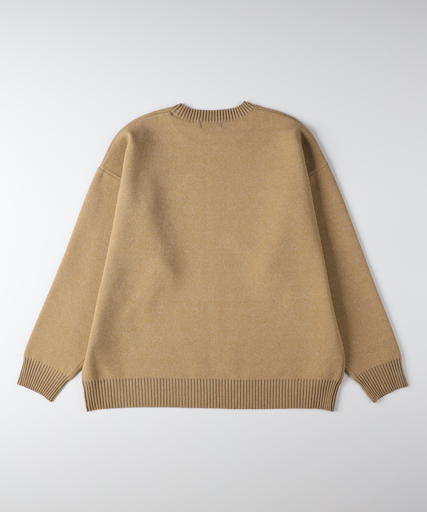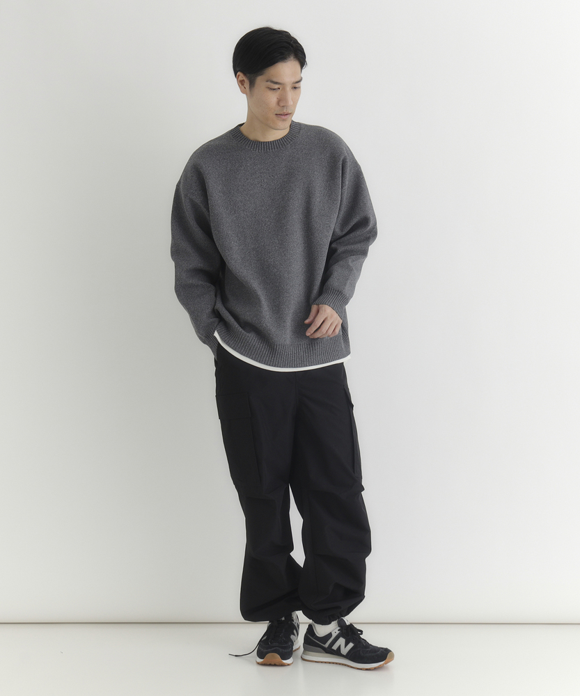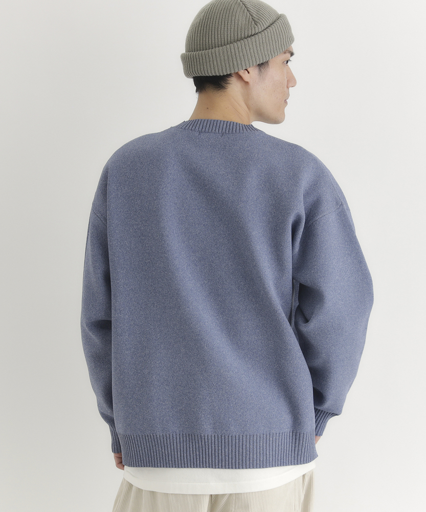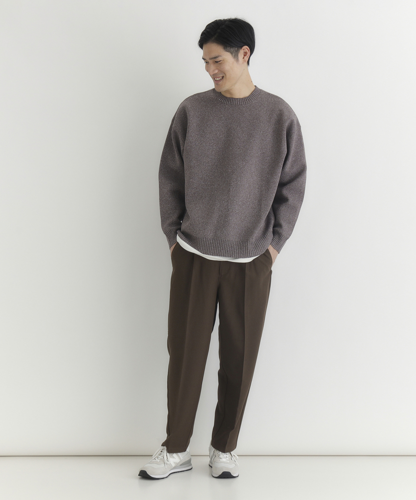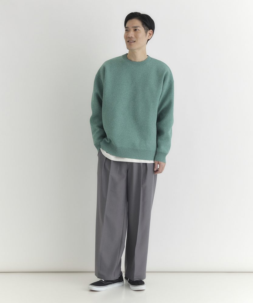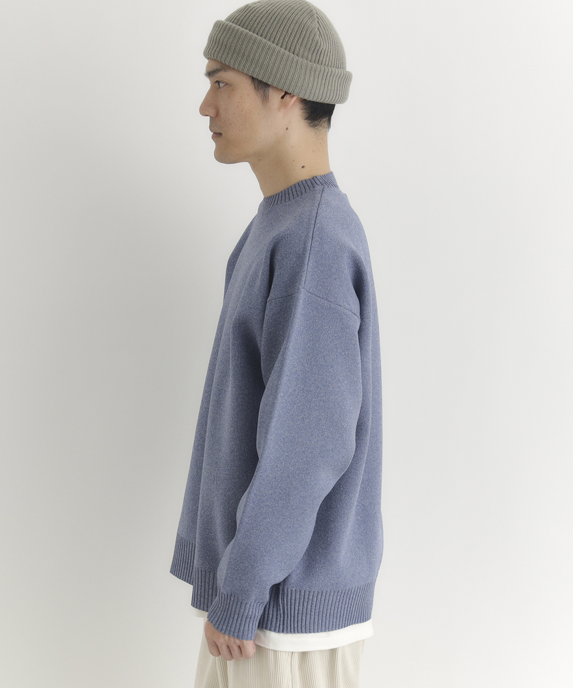 【仕様】ゆったりとしたボックスシルエットのクルーネック。ドロップショルダーと短めの着丈で身幅に余裕を持たせ、リブで端正に仕上げた都会的な一枚です。メランジの控えめな表情が洗練された抜け感を生みます。【素材】 柄のように見えるMIX糸を用いた特殊な編地と軽量ポリエステルの組み合わせで、立体感のある表情と高い復元性を実現。軽やかで日常使いしやすく、マシンウォッシャブルでお手入れも簡単。 【スタイリング】 短め丈を生かしてハイウエストのトラウザーやテーパードパンツと合わせ、モダンな比率に。オーバーコートやシャツとのレイヤードもすっきり決まり、スニーカーやレザーシューズで表情を変えて。