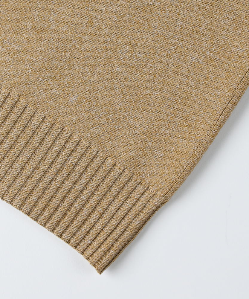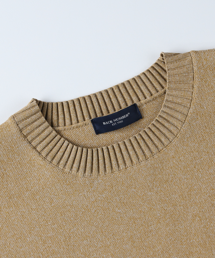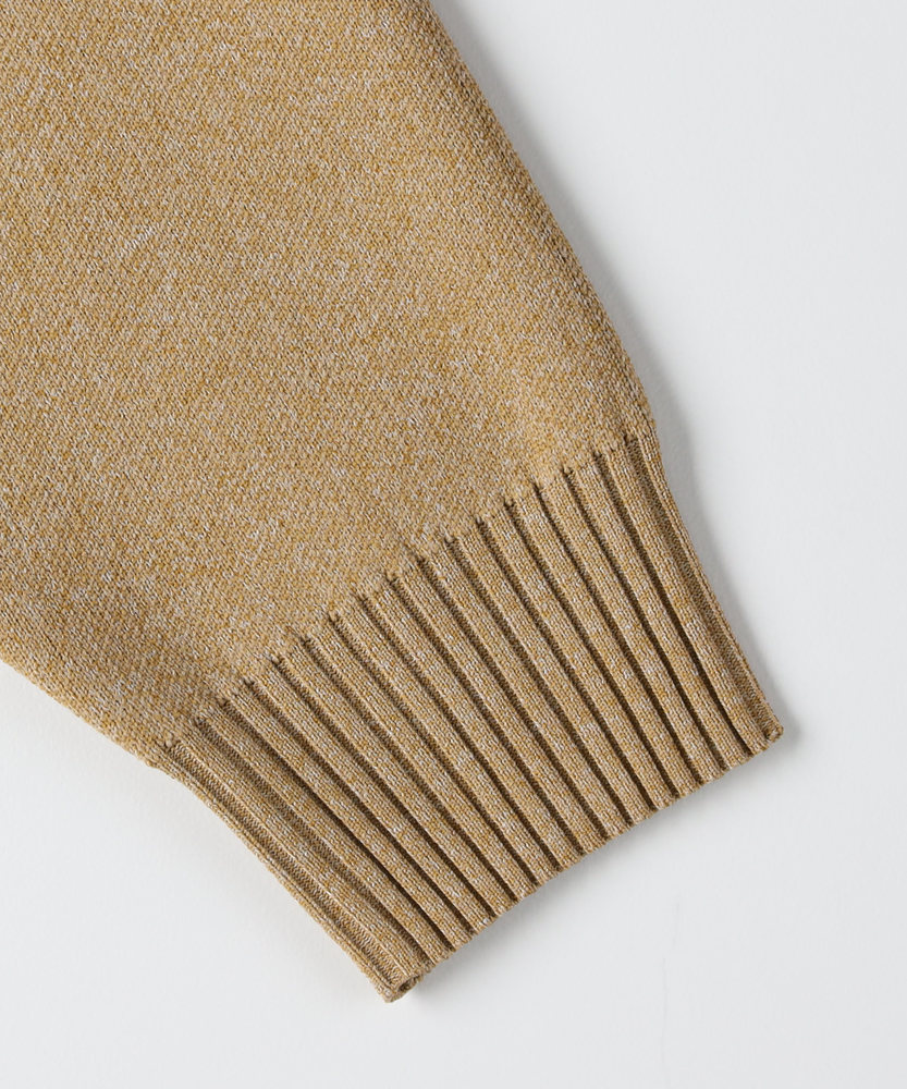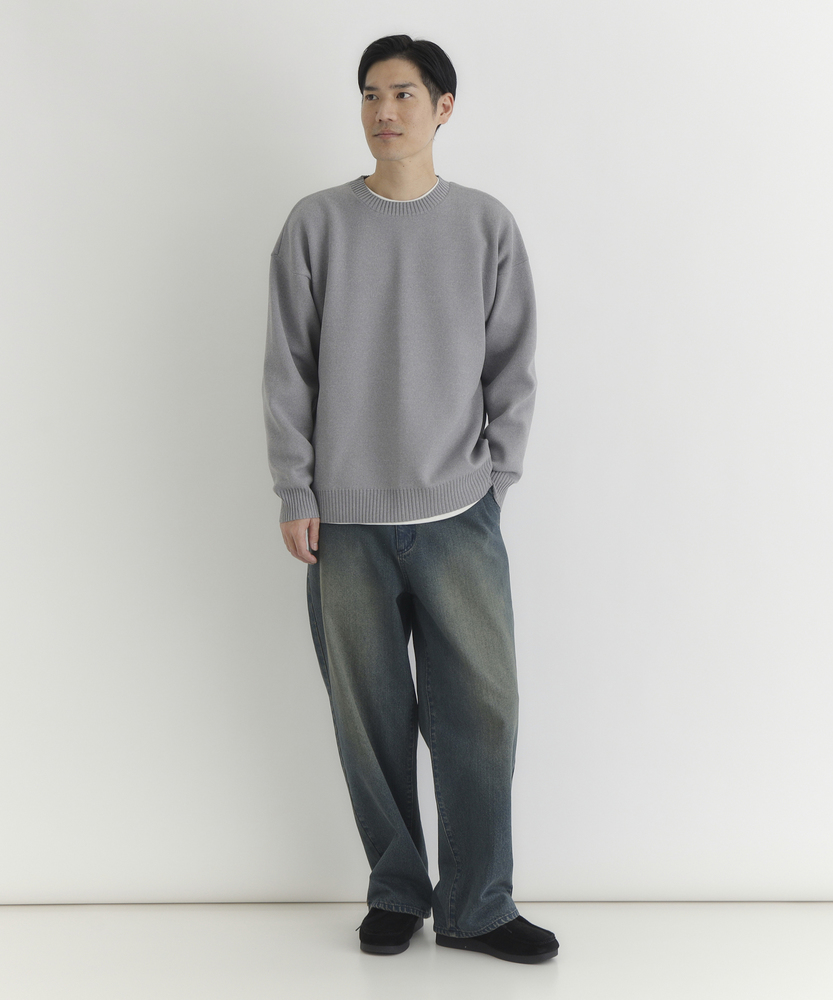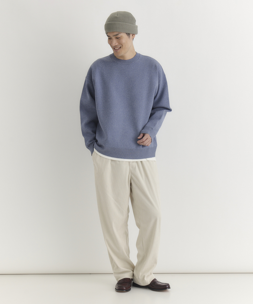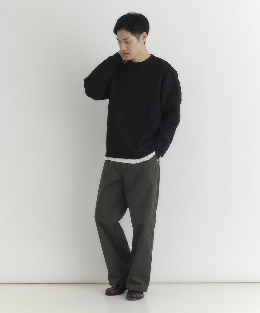 【仕様】ゆったりとしたボックスシルエットのクルーネック。ドロップショルダーと短めの着丈で身幅に余裕を持たせ、リブで端正に仕上げた都会的な一枚です。メランジの控えめな表情が洗練された抜け感を生みます。【素材】 柄のように見えるMIX糸を用いた特殊な編地と軽量ポリエステルの組み合わせで、立体感のある表情と高い復元性を実現。軽やかで日常使いしやすく、マシンウォッシャブルでお手入れも簡単。 【スタイリング】 短め丈を生かしてハイウエストのトラウザーやテーパードパンツと合わせ、モダンな比率に。オーバーコートやシャツとのレイヤードもすっきり決まり、スニーカーやレザーシューズで表情を変えて。