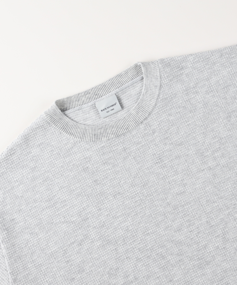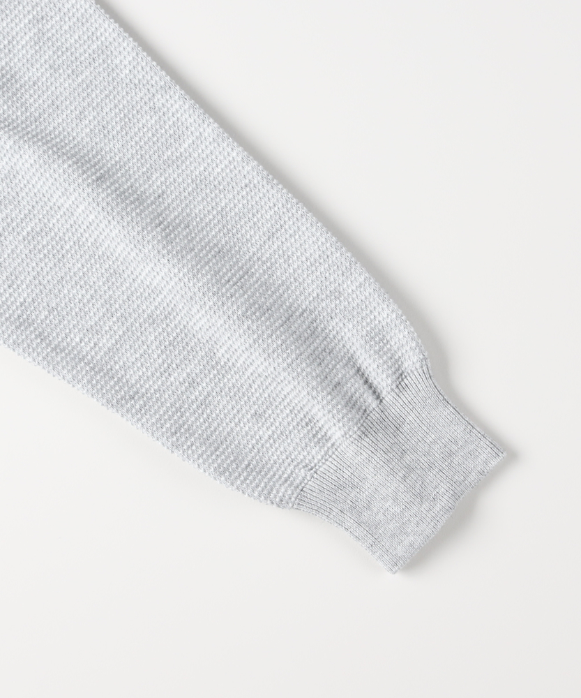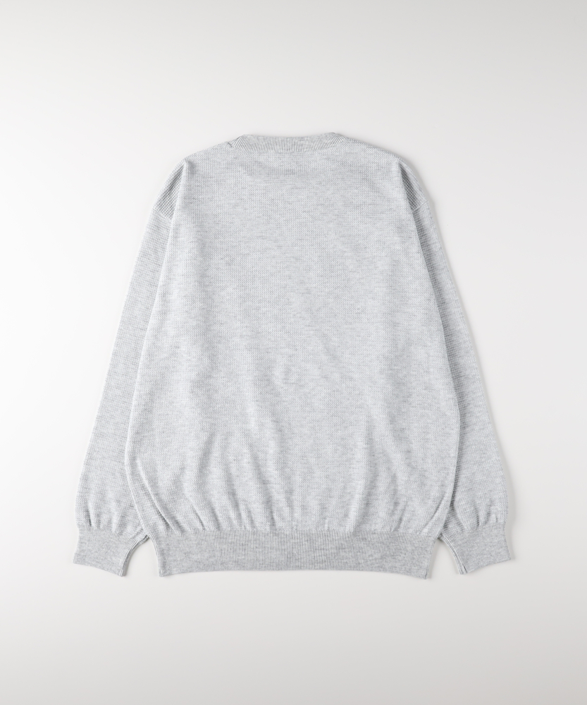 【仕様】クルーネックのミニマルな顔立ちにワッフル編みの表情を合わせた、ややドロップショルダーのリラックスシルエット。リブで袖口と裾を引き締め、単体でも重ね着でも都会的に映える一枚です。【素材】 凹凸あるワッフル組織が空気を溜めて程よい保温性と通気性を両立。ほど良い肉感で型崩れしにくく、肌離れが良いため長時間の着用でも快適。日本の編立技術による目面の美しさも魅力です。 【スタイリング】 シャツを重ねて襟を覗かせるクリーンなレイヤードや、テーパードパンツで洗練された均衡を作るのがおすすめ。ジャケットのインにも収まりがよく、スニーカーで崩すと程良いこなれ感が出ます。