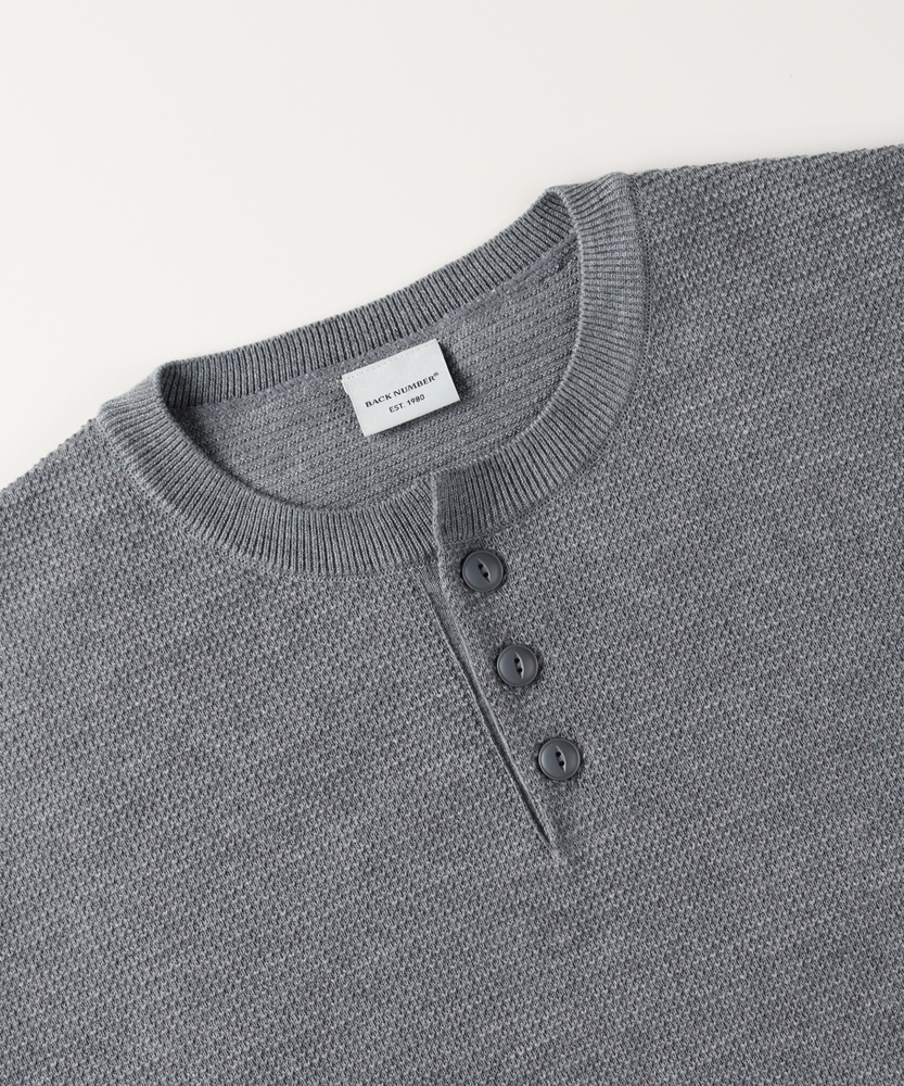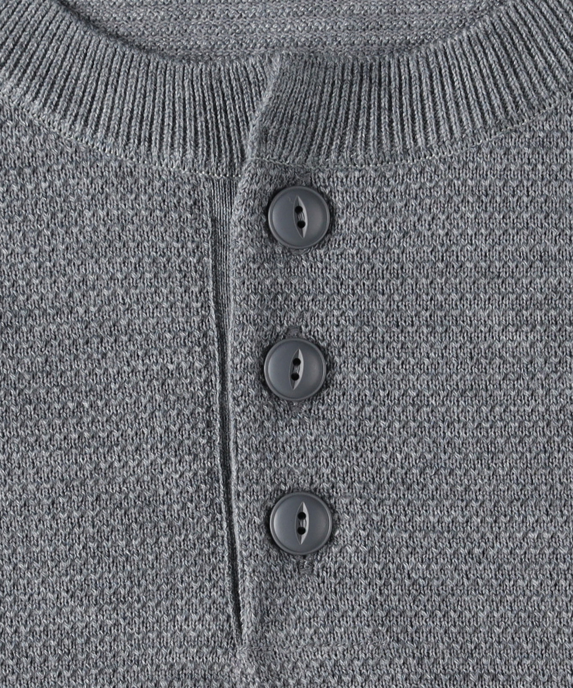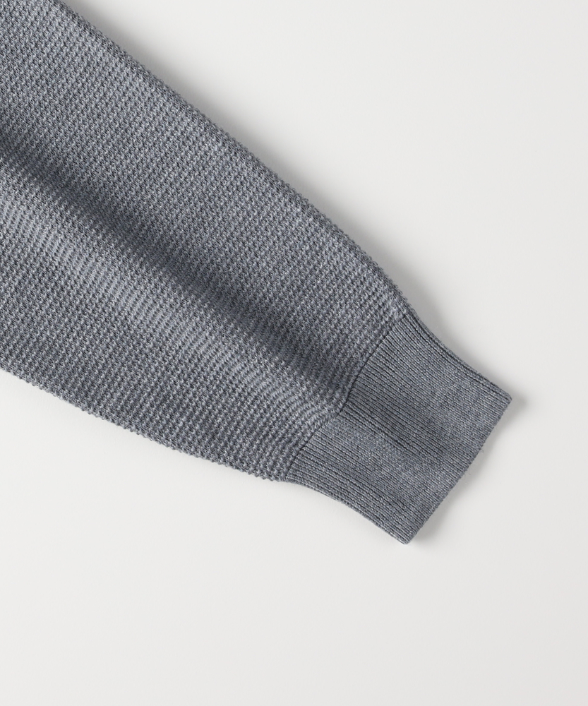【仕様】ヘンリーネックの前立てに配した三つボタンとワッフルの立体感が特徴。やや落ちる肩、ゆとりある身幅とリブで引き締めた裾が、洗練されたリラックスシルエットを実現します。一枚での表情作りはもちろん、コートやジャケットのインにも収まるモダンな寸法設計。【素材】 日本で編み立てたワッフルニットは空気を含む軽さと保温性を両立し、通気性に優れて長時間の着用も快適。型崩れしにくい復元性と程よい表面の陰影が、ミニマルな着こなしに深みを与え、日常のケアで長く美しい風合いを保てます。 【スタイリング】 襟元のボタンを一つ外してシャツやTシャツとレイヤード、テーパードパンツやチノで都会的な週末〜ビジネスカジュアルに。スニーカーで軽く、レザーシューズで引き締めるなど足元で印象を変えやすく、袖を軽くたくし上げるとほどよい抜け感が生まれます。