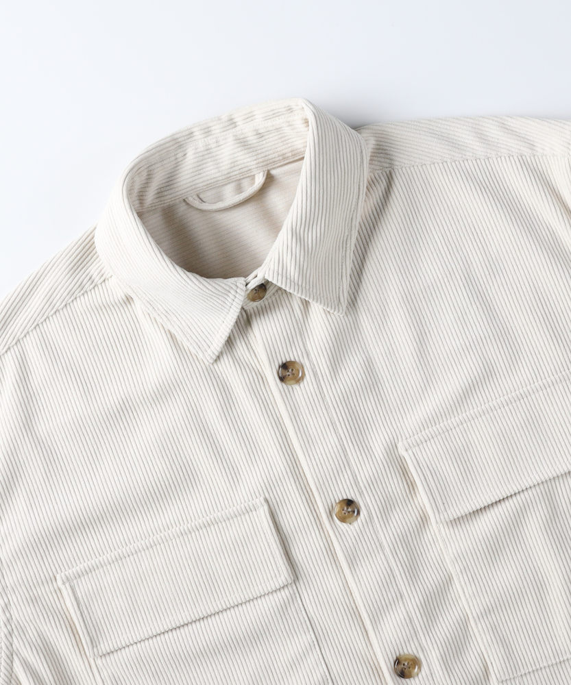 【仕様】CPOデザインのシャツジャケットは、胸ポケットを配した実用的なスタイルが魅力。少しゆったりめのシルエットがリラックス感を演出し、カジュアルなコーディネートにぴったりです。シャツとしてもジャケットとしても使えるアイテムです。【素材】 8Wカットコーデュロイを使用し、ソフトで温かみのある風合いが特徴です。この素材は軽やかさと耐久性を兼ね備え、肌触りの良さも抜群。秋冬のコーディネートに最適な一枚です。 【スタイリング】 シンプルなTシャツやタートルネックと合わせることで、リラックスしたスタイルが完成。足元にはブーツを選ぶと、カジュアルながらも洗練された印象に。シンプルなパンツと合わせても、スタイリッシュに着こなせます。 【セットアップで着用可能なアイテムはこちら】RF25201200079 カットコールイージーパンツ/セットアップ対応