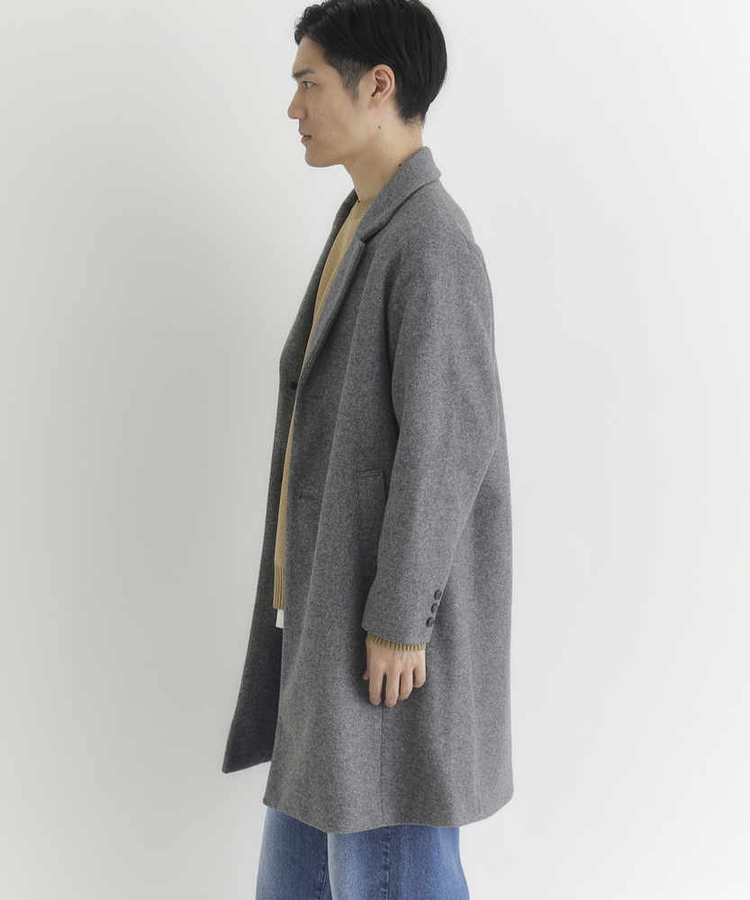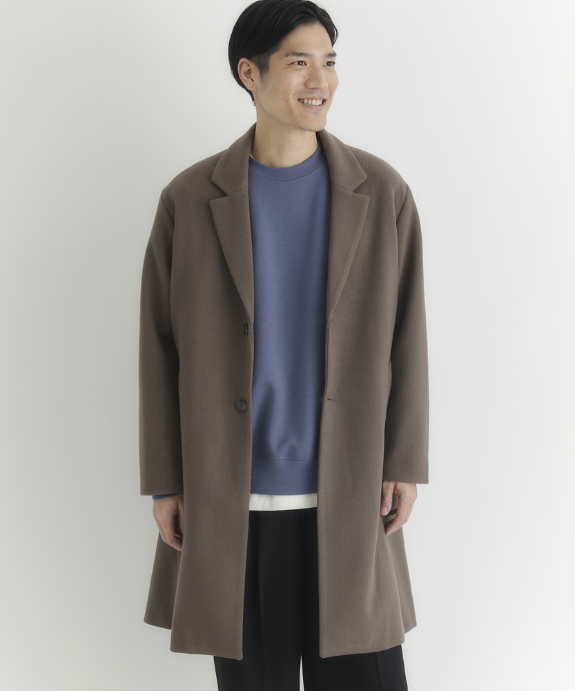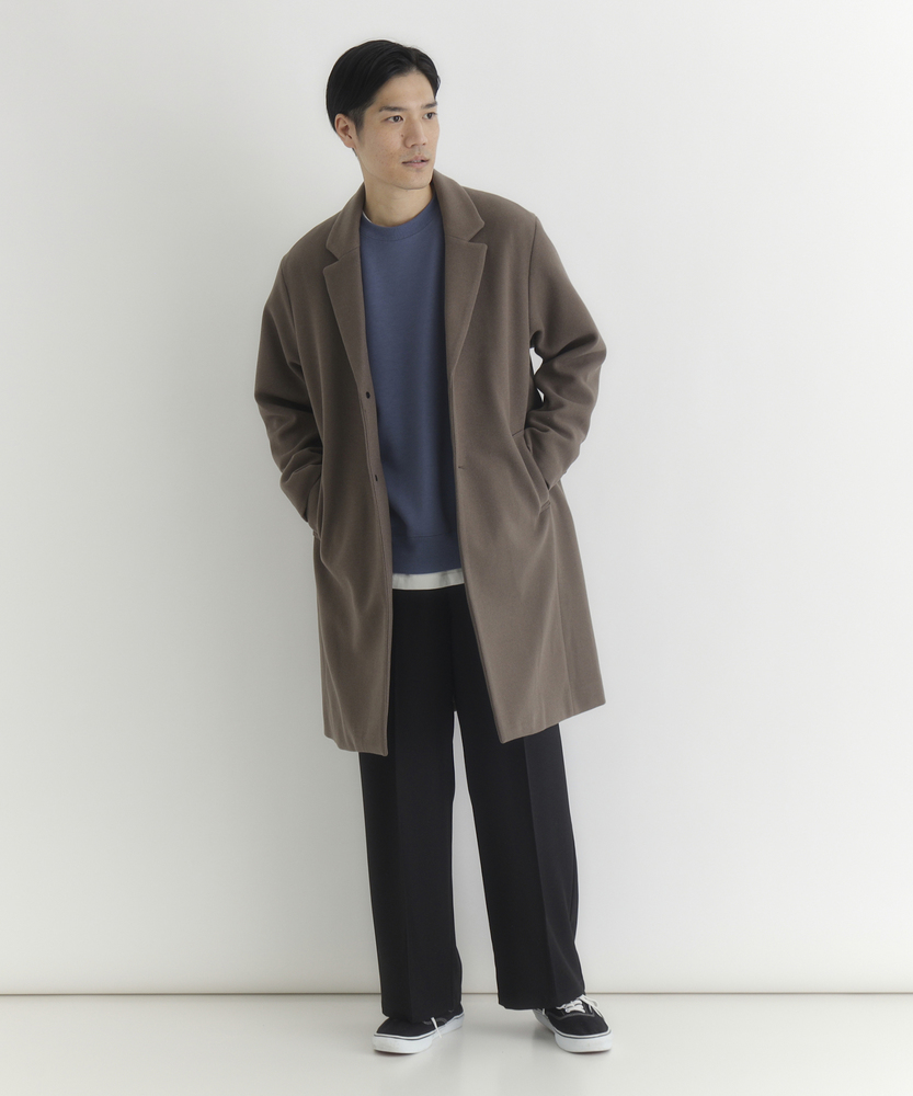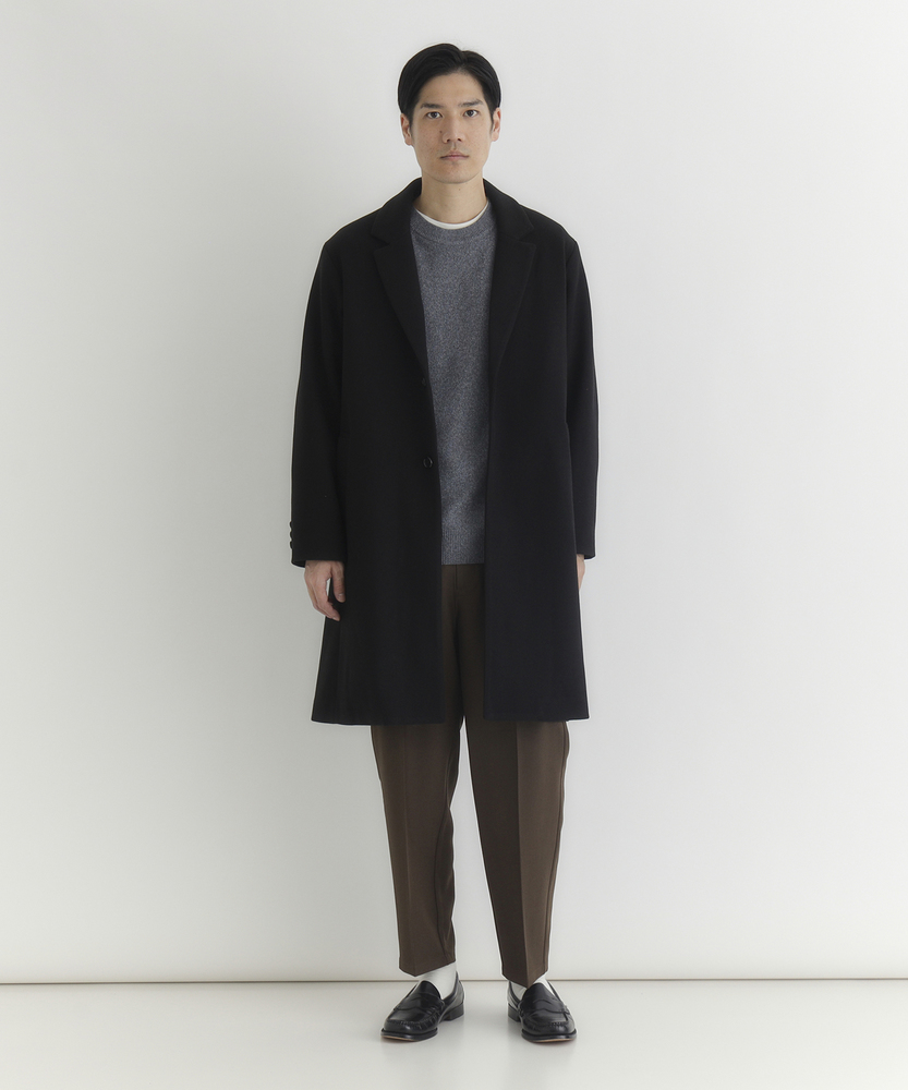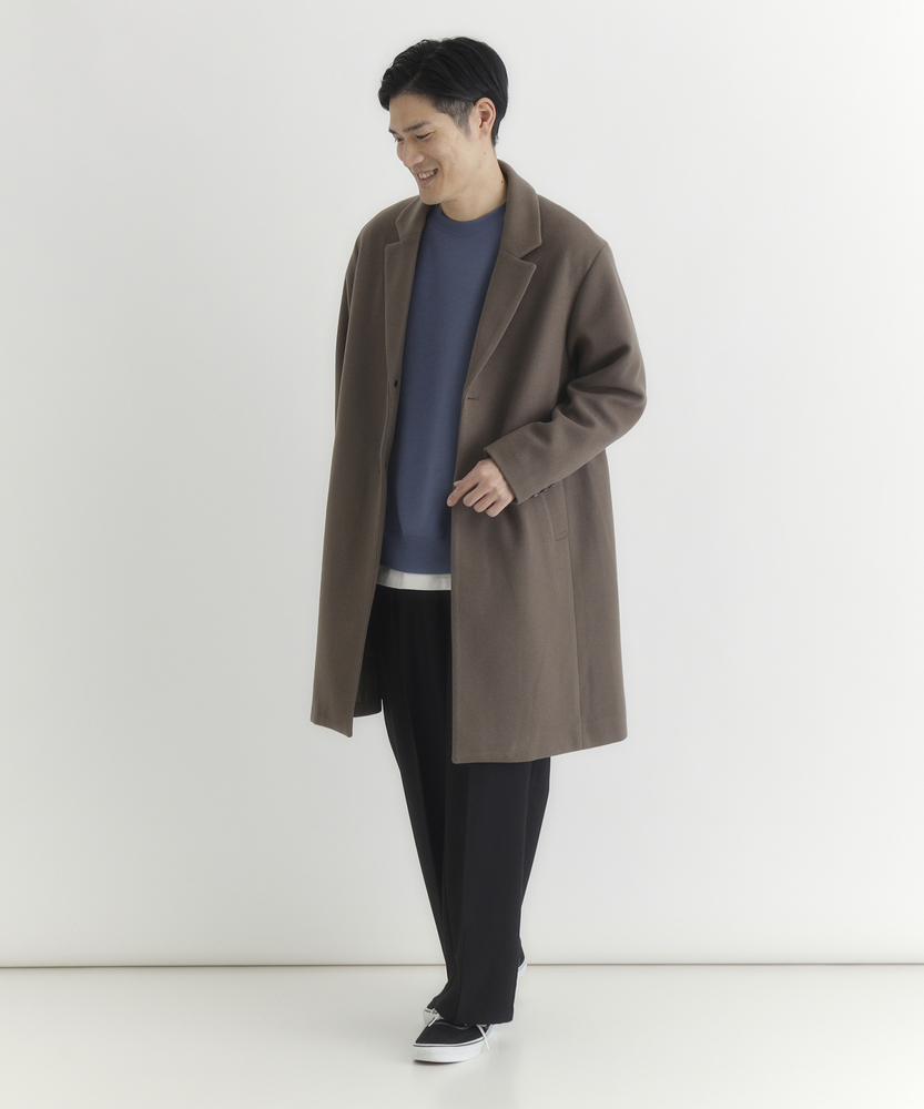 【仕様】シンプルかつ洗練されたライトメルトンチェスターコート。ゆったりとしたリラックスシルエットが特長で、スタイリッシュさと快適さを両立しています。シングルボタンのデザインは、スマートな印象を与え、さまざまなシーンに活躍します。【素材】 ニットメルトンを使用し、軽量でソフトな肌触りが魅力。暖かさを保ちながら、着心地も抜群です。通勤や街歩きなど、日常のシーンで活躍できる高機能な素材が特徴です。 【スタイリング】 シンプルなTシャツやタートルネックと合わせることで、暖かさを保ちながらもスタイリッシュなコーディネートを楽しめます。デニムやスラックスとの相性も良く、カジュアルからビジネスシーンまで幅広く使えるアイテムです。