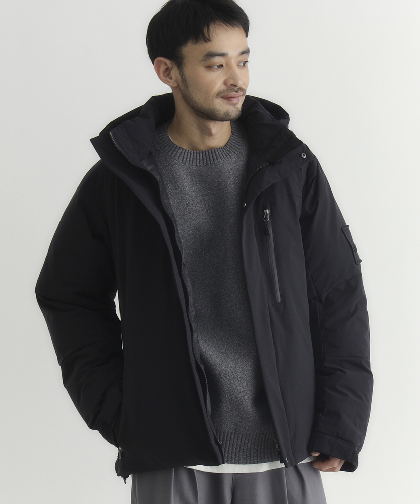 耐久撥水素材である帝人の「DROPTECH®」を使用しておりお手入れが楽。ダウンと中綿の良い部分を最大限活かしたハイブリッドなアウター。ダウンの特徴である軽さ&高い保温性。中綿の扱いやすさ。それぞれの良い部分を活かし、日常使いし易いアウターに仕上げました。■Point・「DROPTECH®」耐久撥水→30回洗濯しても水を弾く力が持続。(JIS L1092スプレー法)・保温→寒い日もあたたかい。・防風性→風を通しにくく、冷たい風も安心。【仕様】暖かさと洗練されたデザインを兼ね備えたダウンミックス防風ジャケット。レギュラーシルエットは、着る方を選ばずにリラックスしたスタイルを提供します。フロントのダブルフラップとワッペンが、シンプルながらも特徴的なアクセントとなっています。フードは取り外し可能で、シーンに応じた着こなしが楽しめます。【素材】表地はポリエステル100%を使用し、耐久性に優れつつも柔らかな心地よさを実現。ダウンをミックスすることで、保温性を高めています。耐久撥水加工が施されているため、急な雨や雪からもしっかりと守ってくれます。 【スタイリング】デイリーユースに最適で、カジュアルなスタイルからアウトドアまで幅広く対応。ニットやスウェットと合わせることで、アクティブな印象に仕上がります。※表示している限定販売期間経過後も、継続してまたは数日中に限定価格販売を行う可能性があります。また、価格についても値下げする場合があります。予めご了承ください。