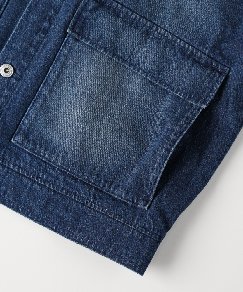【仕様】シンプルでありながら洗練された印象を与えるデニムフルジップブルゾン。2つの大きなフロントポケットが特徴で、実用性とデザイン性を兼ね備えています。程よいルーズシルエットが、リラックスした雰囲気を演出します。【素材】 デニム素材を採用し、丈夫さと柔らかさを両立。着心地が良く、季節を問わず活躍するアイテムです。時間と共に風合いが増し、着るたびに自分だけのスタイルを楽しめます。 【スタイリング】 テクスチャーの異なるインナーと合わせることで、コントラストが生まれ、さらなるスタイリングが可能に。ハーフパンツやスリムフィットのパンツと合わせてカジュアルダウンし、リラックスしたスタイルを楽しんでください。シンプルなTシャツを合わせて、デイリールックに最適です。