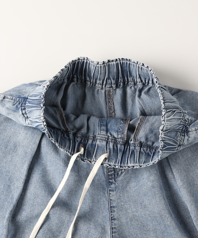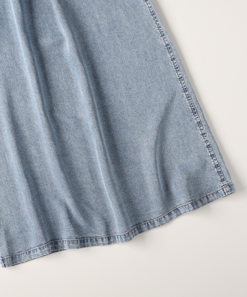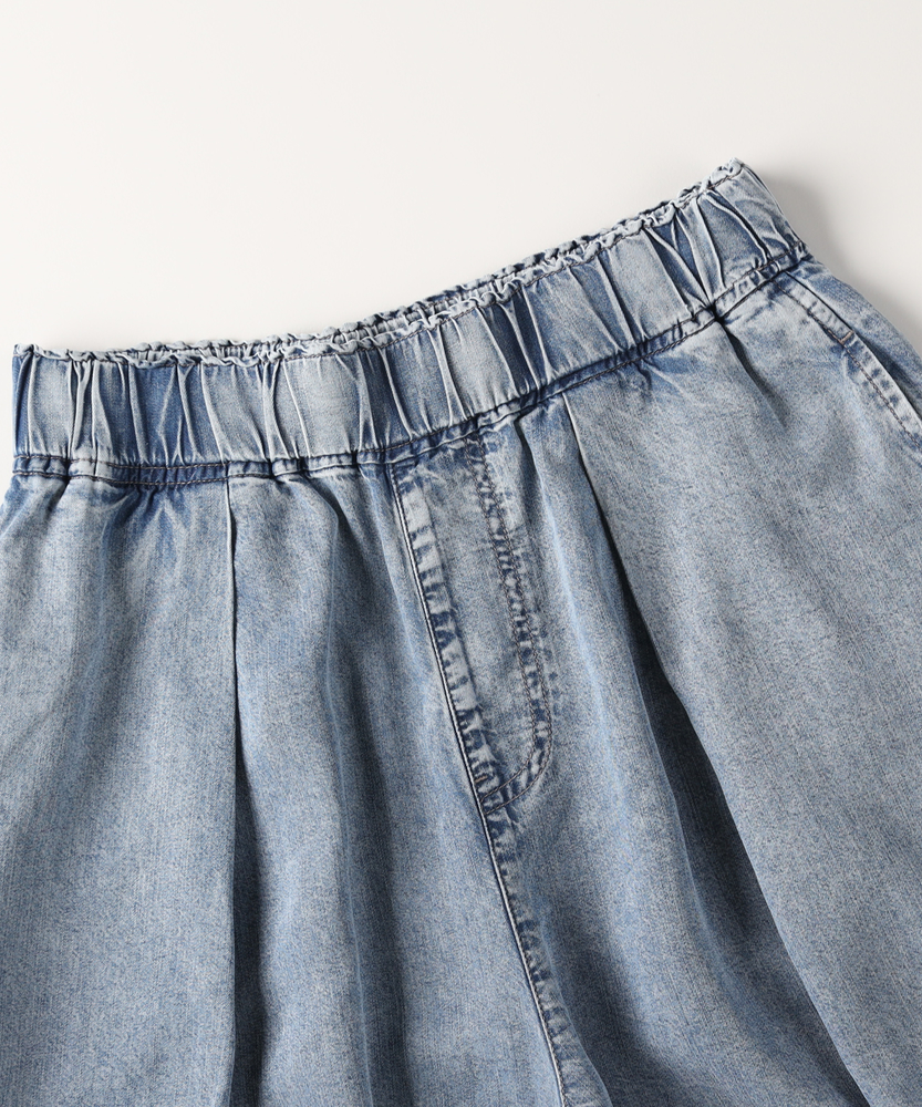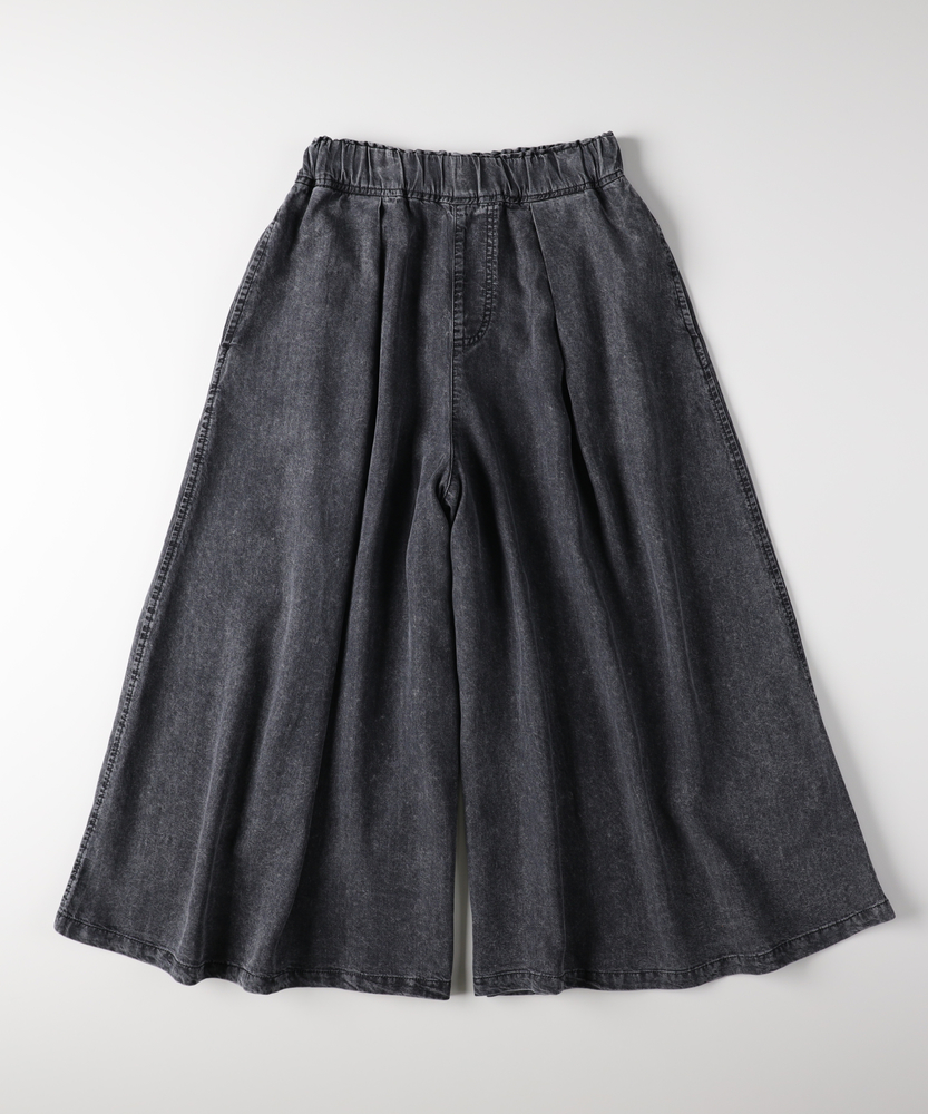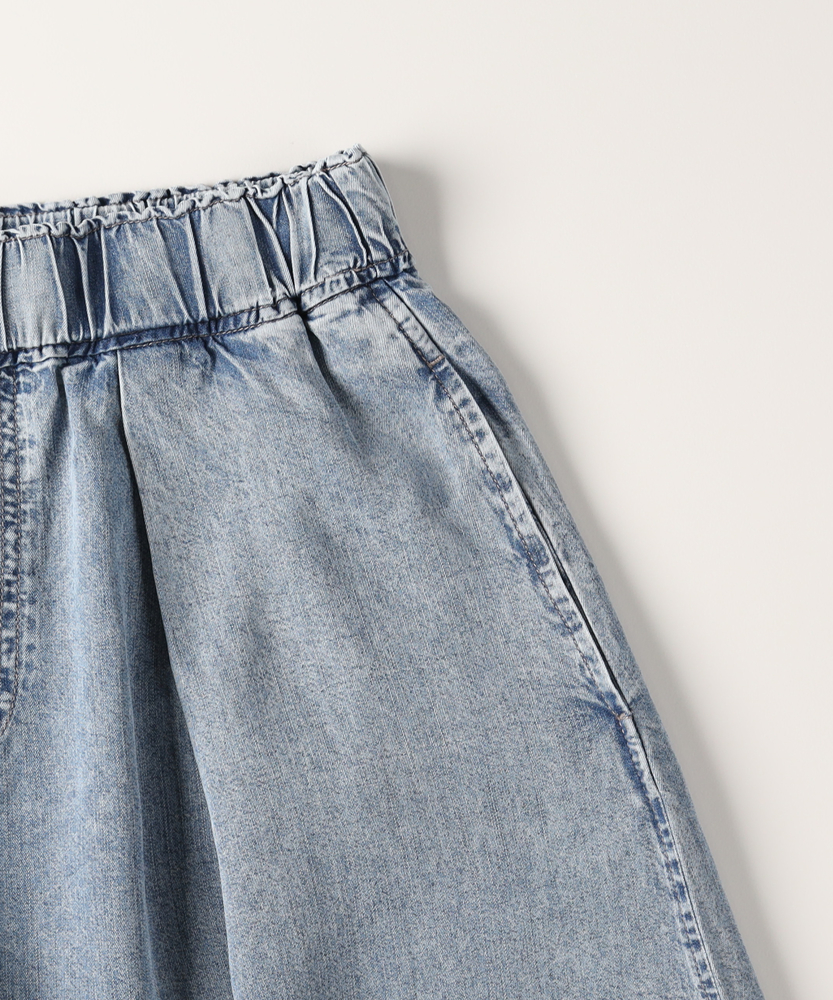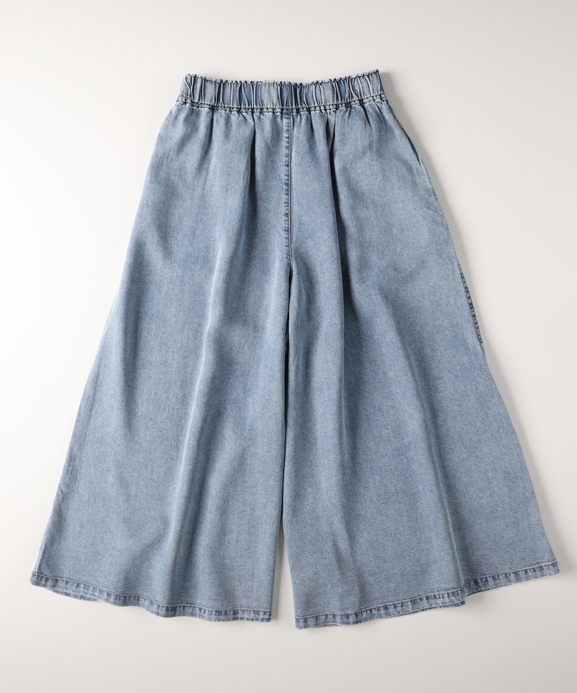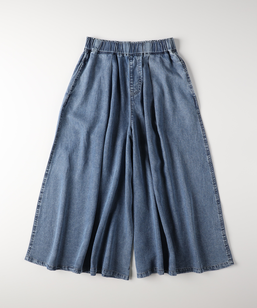 触れるたびに涼やか。夏のお出かけを快適にするデニムガウチョ。スカート見えするたっぷりフレア。気になる下半身をすっきりカバー。楽ちんウエストゴム仕様。毎日穿きたくなる大人の日常着。■Point・ひんやりと快適な穿き心地暑い季節も心地よく。触れると涼やかな肌触り。汗ばむ日々の強い味方に。・体型を拾わないシルエット裾に向かって広がるAライン。脚のラインをすっぽり隠す。安心感のある穿き心地です。・スカート見えするエレガントさフロントのタックが立体的。たっぷりとした生地の分量。女性らしい揺れ感を演出します。・ストレスフリーな総ゴム仕様ウエストは締め付け感ゼロ。すぽっと穿けて着脱も簡単。長時間の移動も楽ちんです。・便利なサイドポケット付きスマホや小物がサッと入る。日常使いに嬉しいディティール。実用性もしっかり備えました。・こなれ感漂うウォッシュ加工ヴィンテージライクな色落ち。大人のカジュアルに馴染む。気負わずデイリーに活躍します。【仕様】たっぷりと生地を使用した、スカート見えするフレアシルエットのガウチョパンツです。フロントのタックが立体感を生み出し、腰回りをすっきりと見せながらレッグラインをカバーします。ウエストはストレスフリーな総ゴム仕様。便利なサイドポケットも備え、日常の使い勝手を考慮した大人に嬉しいデザインです。【素材】暑い季節でも涼やかに着用できる、ひんやりとした肌触りを備えたデニム生地を採用しています。厚すぎず柔らかな風合いで、歩くたびに美しいドレープを描きます。丁寧に施されたウォッシュ加工がこなれ感を引き出し、大人のカジュアルスタイルに自然に馴染む、デイリーユースにぴったりな質感に仕上がっています。【スタイリング】ボリュームのあるボトムスなので、コンパクトなトップスを合わせると全身のバランスが良くまとまります。足元はフラットサンダルやスニーカーで抜け感を出せば、気取らない休日スタイルが完成。ブラウスをタックインしてきれいめに着こなすのもおすすめです。幅広いアイテムと相性が良く、毎日のコーディネートで重宝します。