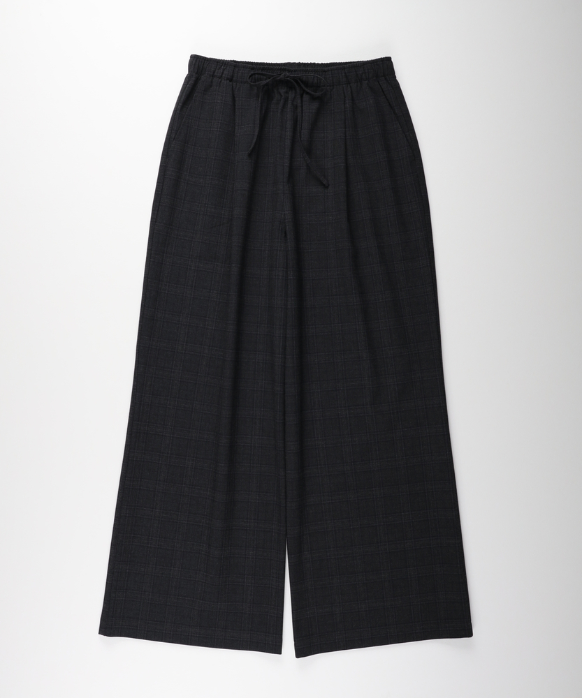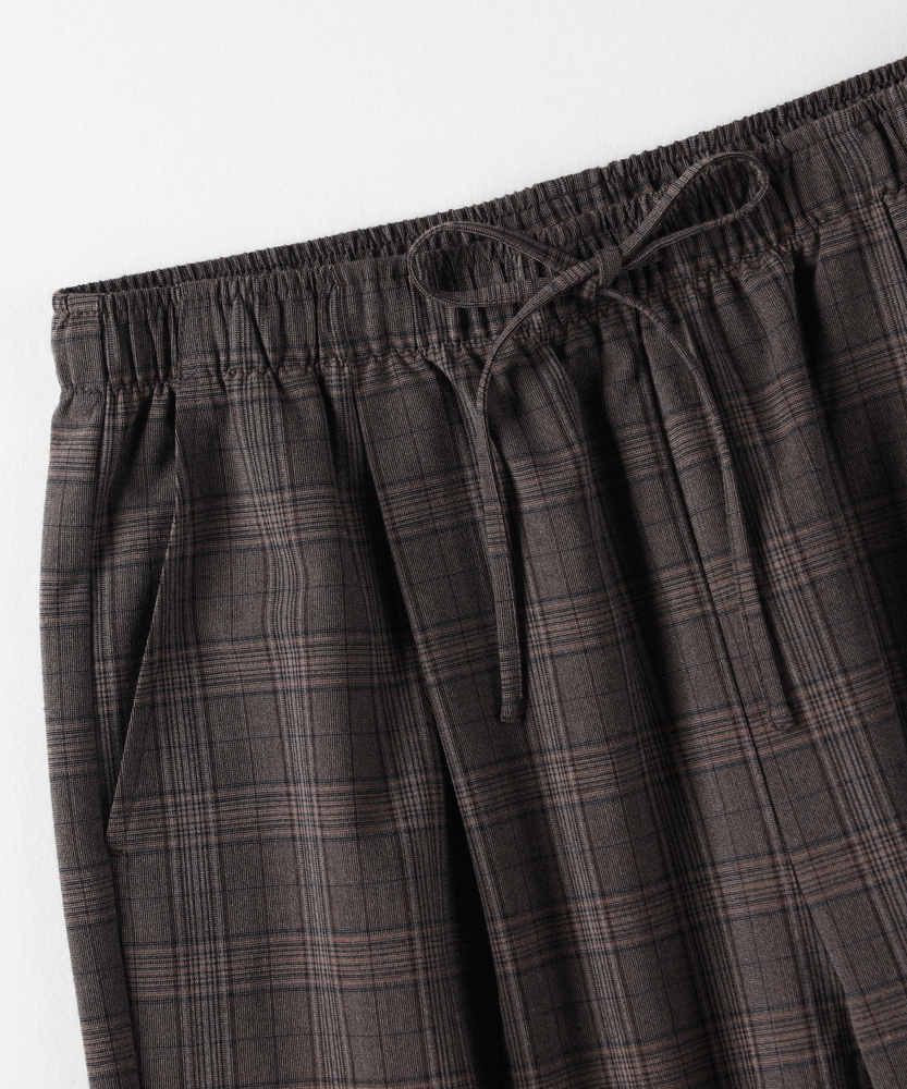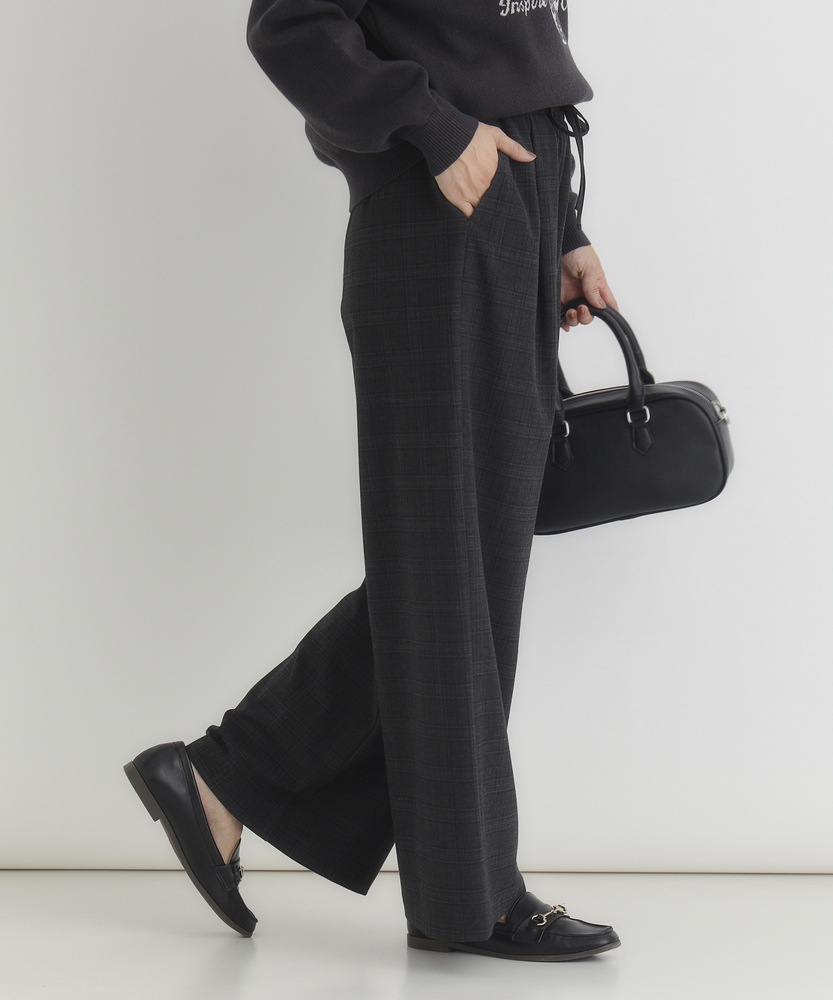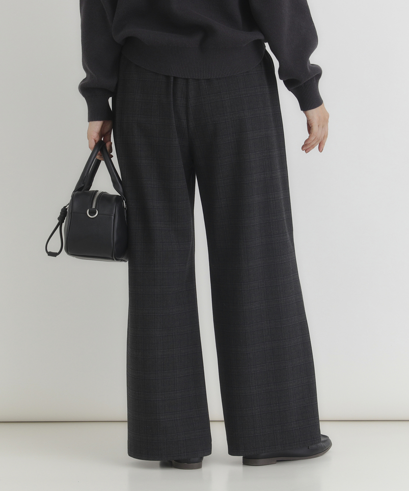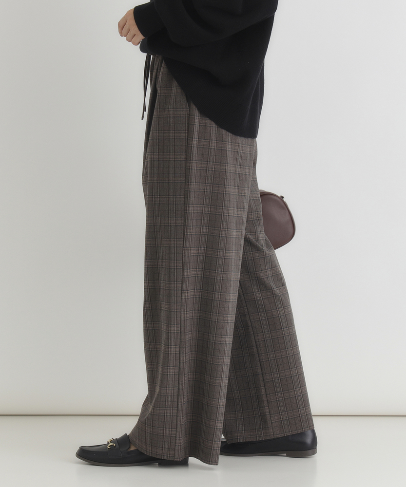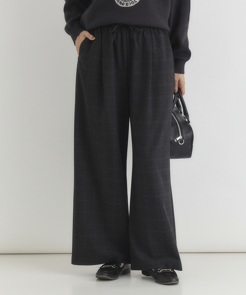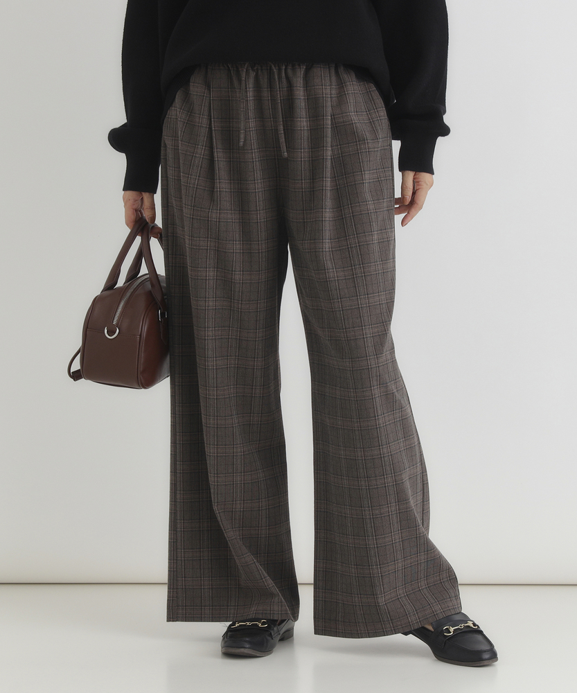 「楽」して「ちゃんと見え」が一番使える! おしゃれも動きやすさも◎■Point・トレンドのワイドシルエットで気になる体型も絶妙にカバー。ストンと落ちる生地感で体のラインを拾いにくいのも安心です。・ウエストゴムで楽ちんな穿き心地。・伸縮性があり快適な穿き心地。・忙しい毎日からお出かけまで幅広いシーンで使える強い味方。・控えめなチェック柄で、柄物が苦手な方にも取り入れて頂きやすい仕様に。・キレイめ見えする素材でデイリー使い~少しキチンとしたいシーンまで幅広く対応。【仕様】リラックスしたシルエットのTRチェックイージーパンツは、カジュアルながらも洗練された印象を与えます。ウエストはイージー仕様で、調整可能な紐が付いており、快適なフィット感を実現。チェック柄がスタイリングにアクセントを加えます。【素材】 軽やかなTR素材を使用しており、通気性が良く、快適な着心地を提供します。しっかりとした生地感があり、日常使いにも最適。チェック柄がシンプルなコーディネートに深みを与えます。 【スタイリング】 シンプルなTシャツやタンクトップと合わせることで、リラックスしたカジュアルスタイルが完成。スニーカーやサンダルと組み合わせれば、アクティブな日常にもぴったりです。アクセサリーで個性をプラスして、スタイリッシュに仕上げましょう。