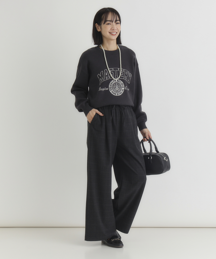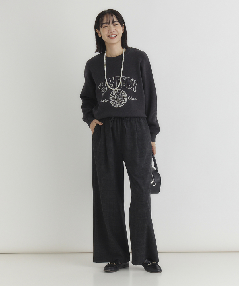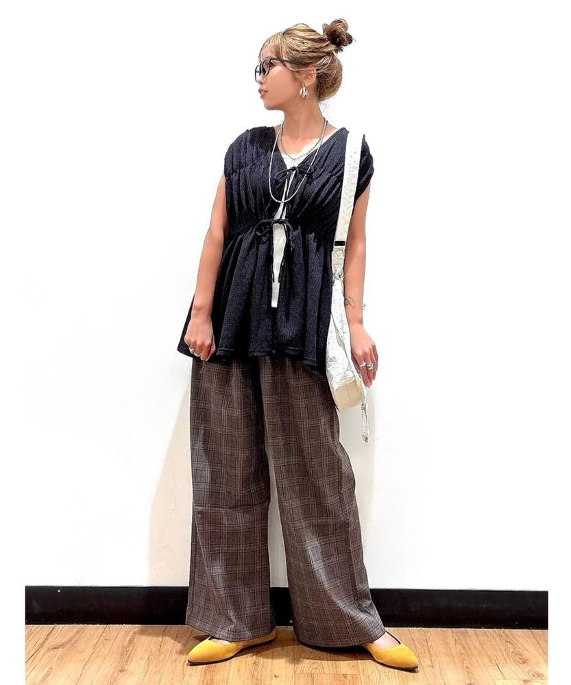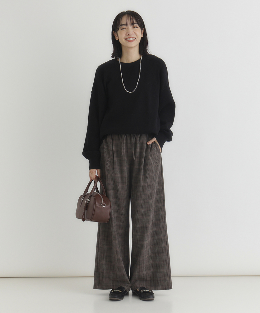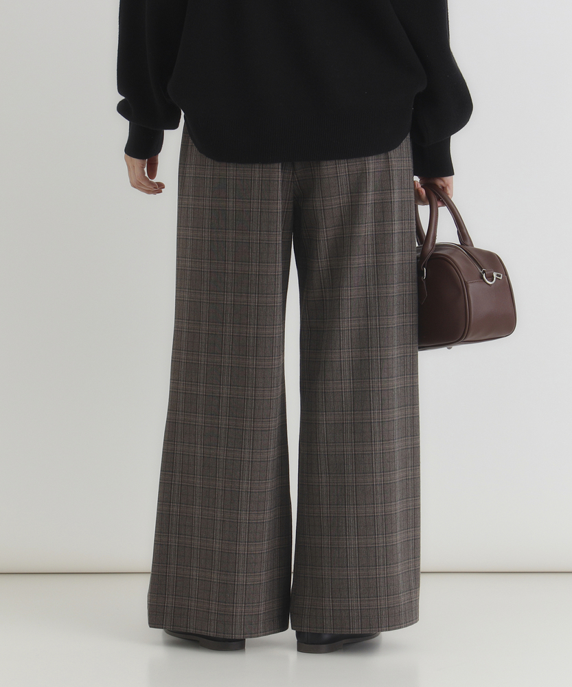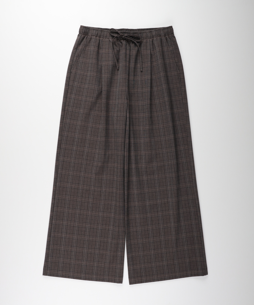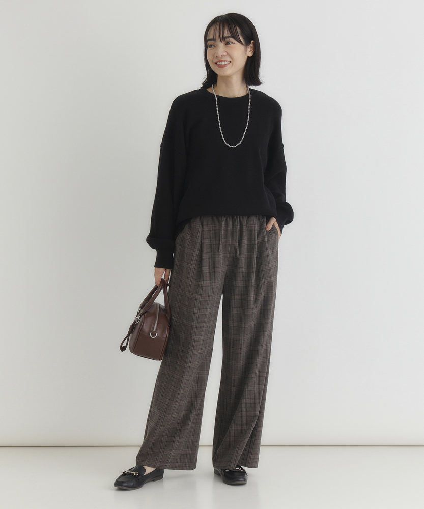 「楽」して「ちゃんと見え」が一番使える! おしゃれも動きやすさも◎■Point・トレンドのワイドシルエットで気になる体型も絶妙にカバー。ストンと落ちる生地感で体のラインを拾いにくいのも安心です。・ウエストゴムで楽ちんな穿き心地。・伸縮性があり快適な穿き心地。・忙しい毎日からお出かけまで幅広いシーンで使える強い味方。・控えめなチェック柄で、柄物が苦手な方にも取り入れて頂きやすい仕様に。・キレイめ見えする素材でデイリー使い~少しキチンとしたいシーンまで幅広く対応。【仕様】リラックスしたシルエットのTRチェックイージーパンツは、カジュアルながらも洗練された印象を与えます。ウエストはイージー仕様で、調整可能な紐が付いており、快適なフィット感を実現。チェック柄がスタイリングにアクセントを加えます。【素材】 軽やかなTR素材を使用しており、通気性が良く、快適な着心地を提供します。しっかりとした生地感があり、日常使いにも最適。チェック柄がシンプルなコーディネートに深みを与えます。 【スタイリング】 シンプルなTシャツやタンクトップと合わせることで、リラックスしたカジュアルスタイルが完成。スニーカーやサンダルと組み合わせれば、アクティブな日常にもぴったりです。アクセサリーで個性をプラスして、スタイリッシュに仕上げましょう。