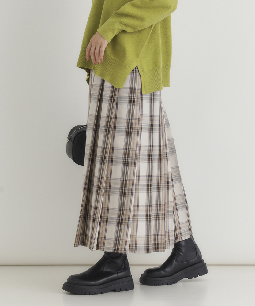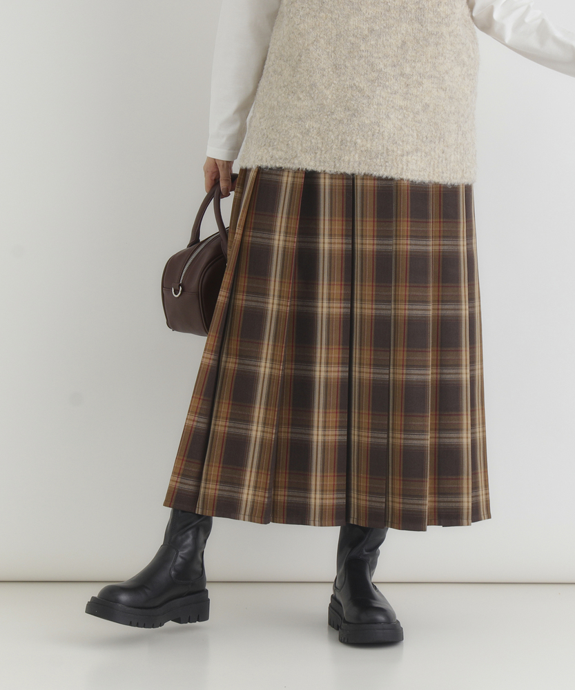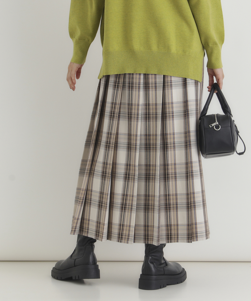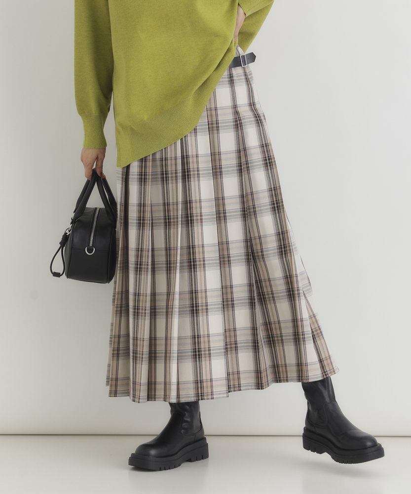 【仕様】クラシックなチェック柄が魅力のプリーツスカート。流れるようなシルエットが女性らしさを引き立て、ウエストのベルトディテールがアクセントに。シンプルなトップスと合わせることで、洗練されたスタイルを演出します。【素材】 軽やかな素材感が特徴で、動くたびに美しいドレープを生み出します。通気性に優れ、快適な着心地を実現。日常使いにも最適で、長時間の着用でもストレスを感じさせません。【スタイリング】 シンプルなニットやシャツと合わせて、カジュアルなデイリースタイルに。足元にはスニーカーやブーツを選ぶことで、リラックスした雰囲気を演出。季節感を取り入れたコーディネートが楽しめます。
