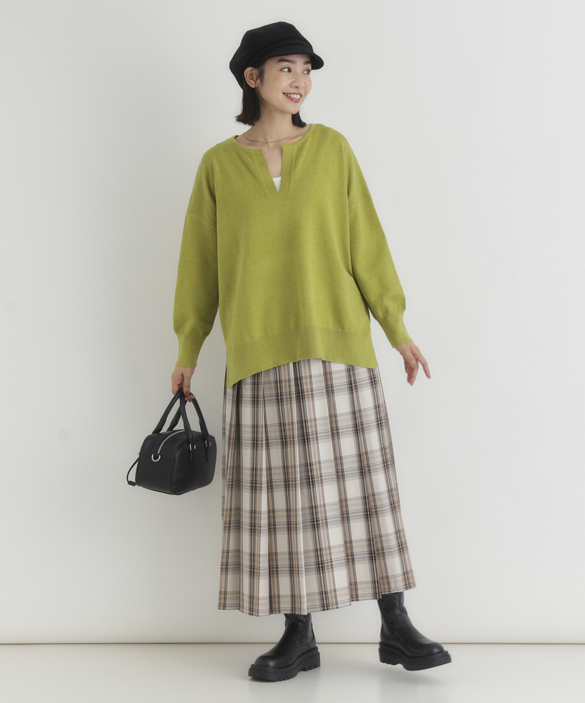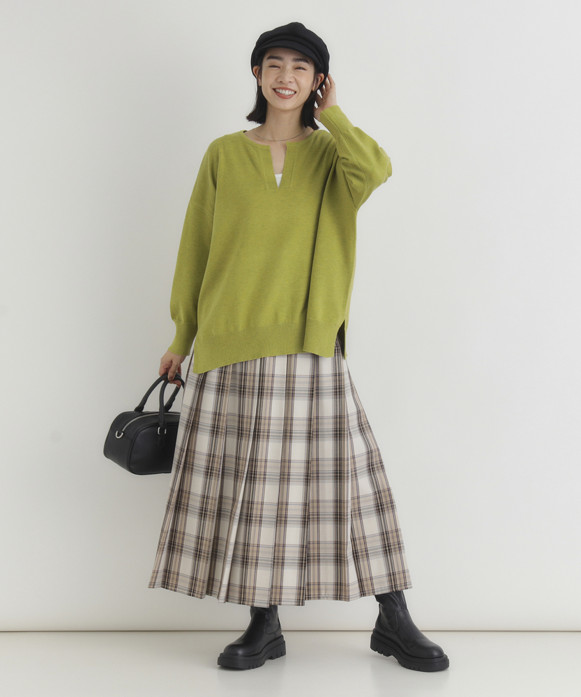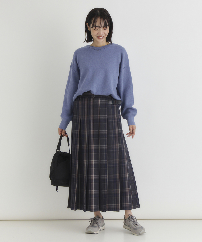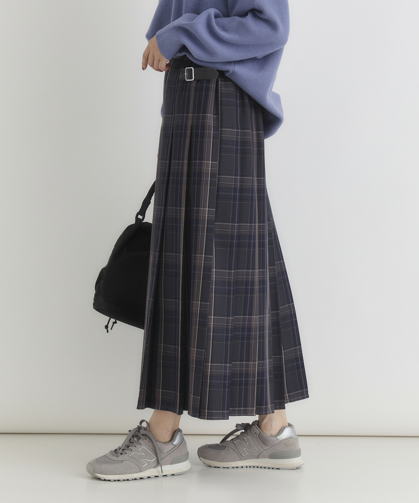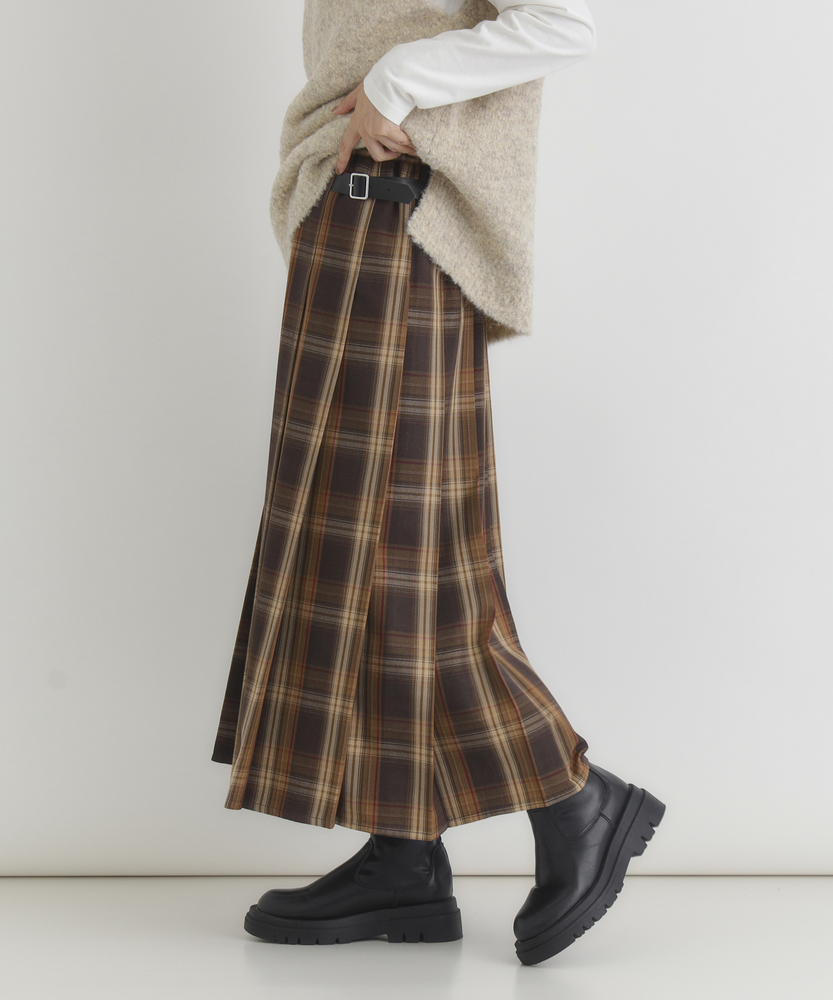 【仕様】クラシックなチェック柄が魅力のプリーツスカート。流れるようなシルエットが女性らしさを引き立て、ウエストのベルトディテールがアクセントに。シンプルなトップスと合わせることで、洗練されたスタイルを演出します。【素材】 軽やかな素材感が特徴で、動くたびに美しいドレープを生み出します。通気性に優れ、快適な着心地を実現。日常使いにも最適で、長時間の着用でもストレスを感じさせません。【スタイリング】 シンプルなニットやシャツと合わせて、カジュアルなデイリースタイルに。足元にはスニーカーやブーツを選ぶことで、リラックスした雰囲気を演出。季節感を取り入れたコーディネートが楽しめます。