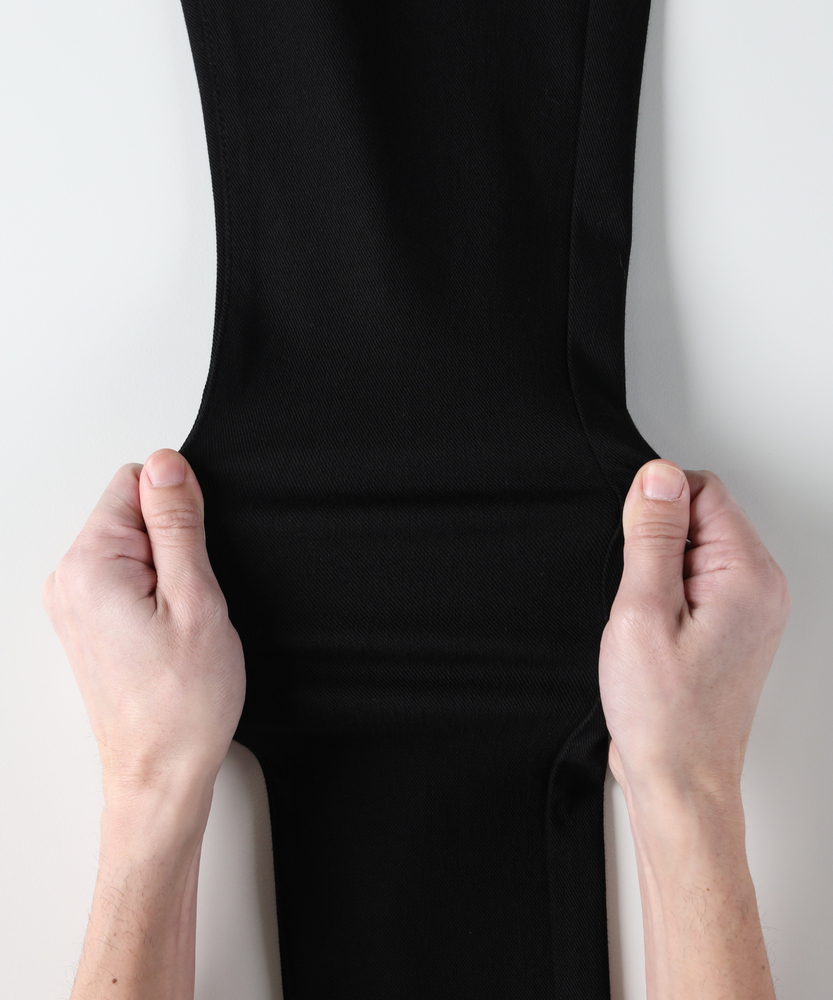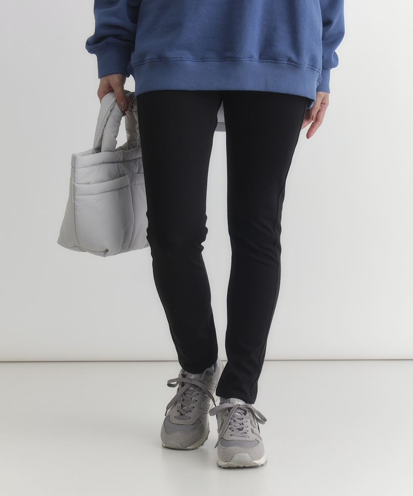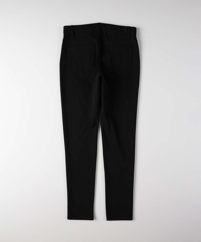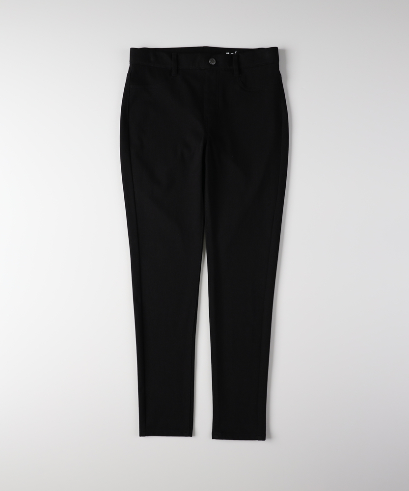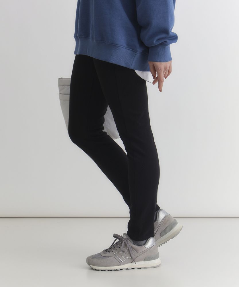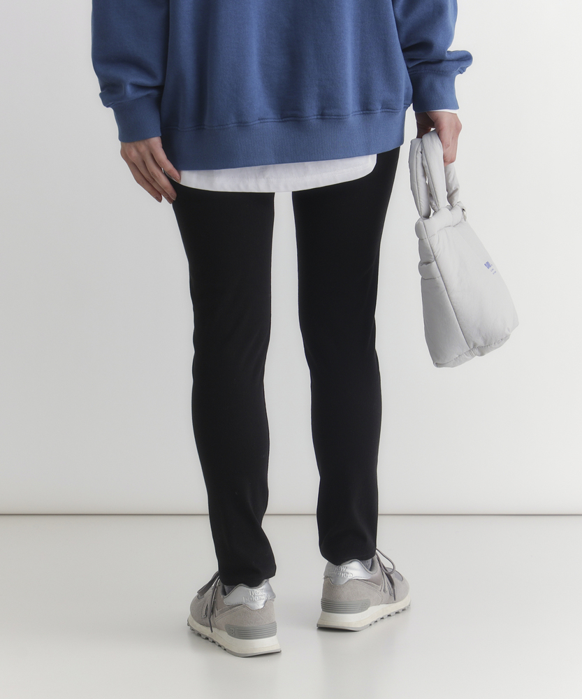 【仕様】脚に沿うスキニーシルエットにセンターステッチで縦ラインを強調。フロントはすっきり、バックはポケット付きでヒップラインを自然に整え、後ろウエストのギャザーが着脱とフィット感を高めます。さりげないウォッシュ加工で立体感も演出します。【素材】 しなやかなストレッチ性でレギンスのように体に馴染み、程よい厚みとハリで美しいラインをキープ。透けにくくお手入れしやすいためデイリー使いに安心感があり、微妙な色味の表情が上品な立体感を生みます。 【スタイリング】 トップはシャツや長めニットで程よくゆとりを持たせるとバランス◎。ヒールで洗練、スニーカーで抜け感のある着こなしに。ウエストを覗かせる着方やゴールド小物で女性らしさを添えると都会的に決まります。