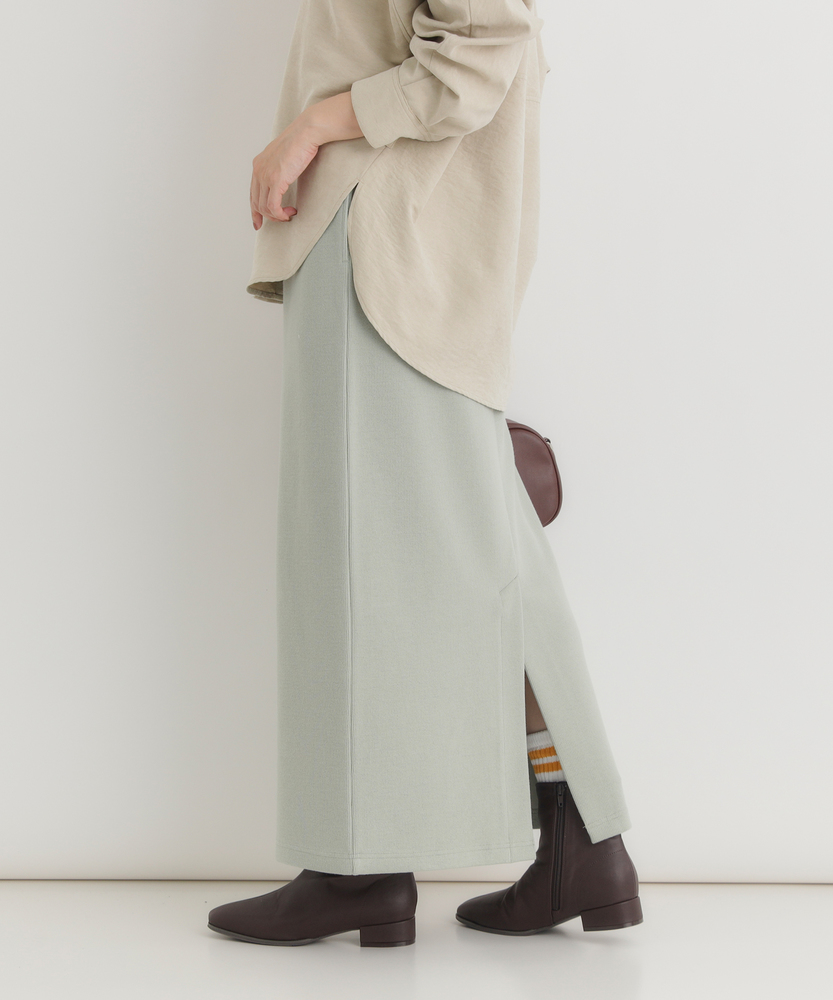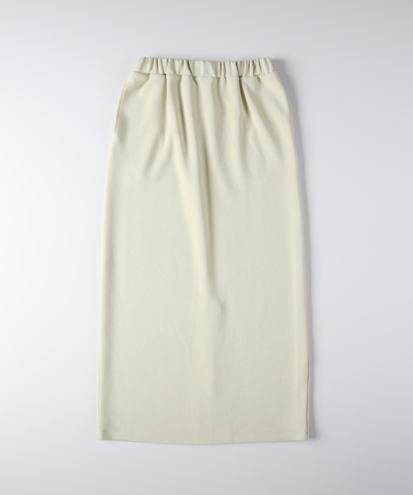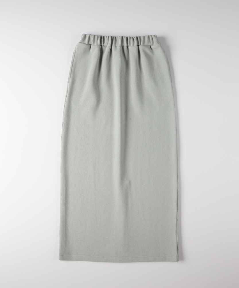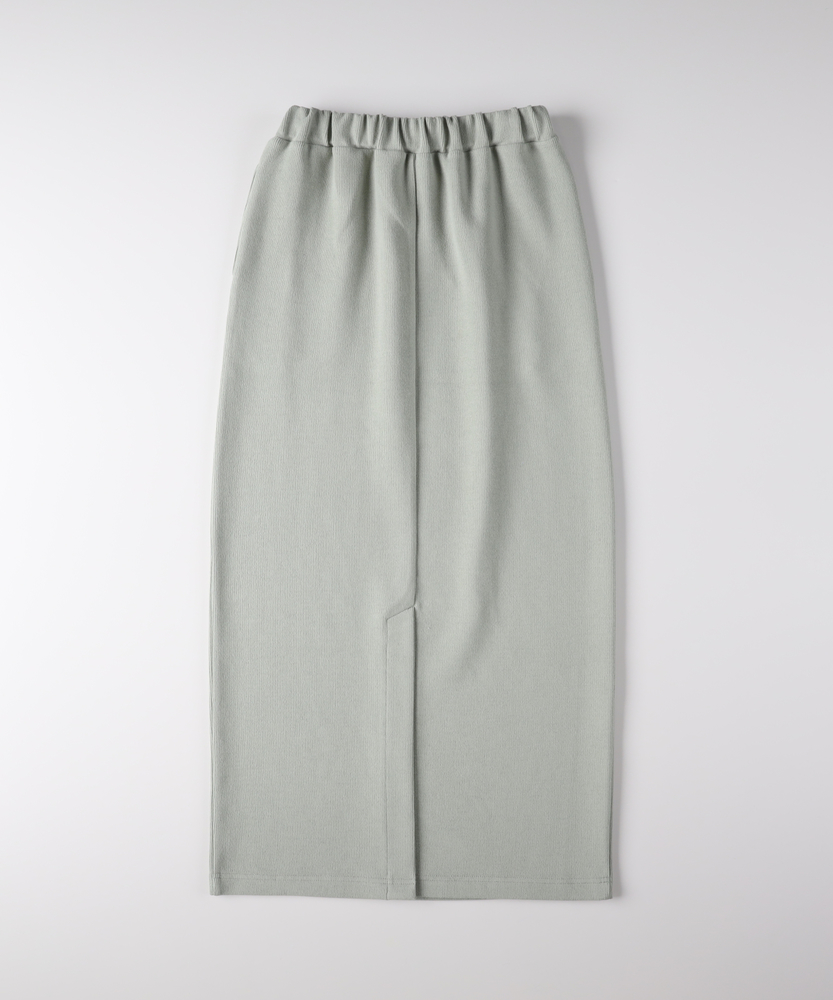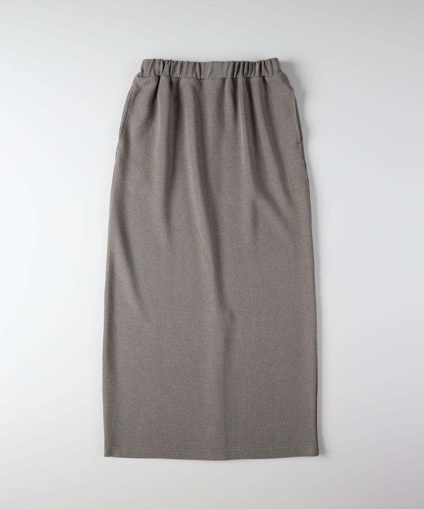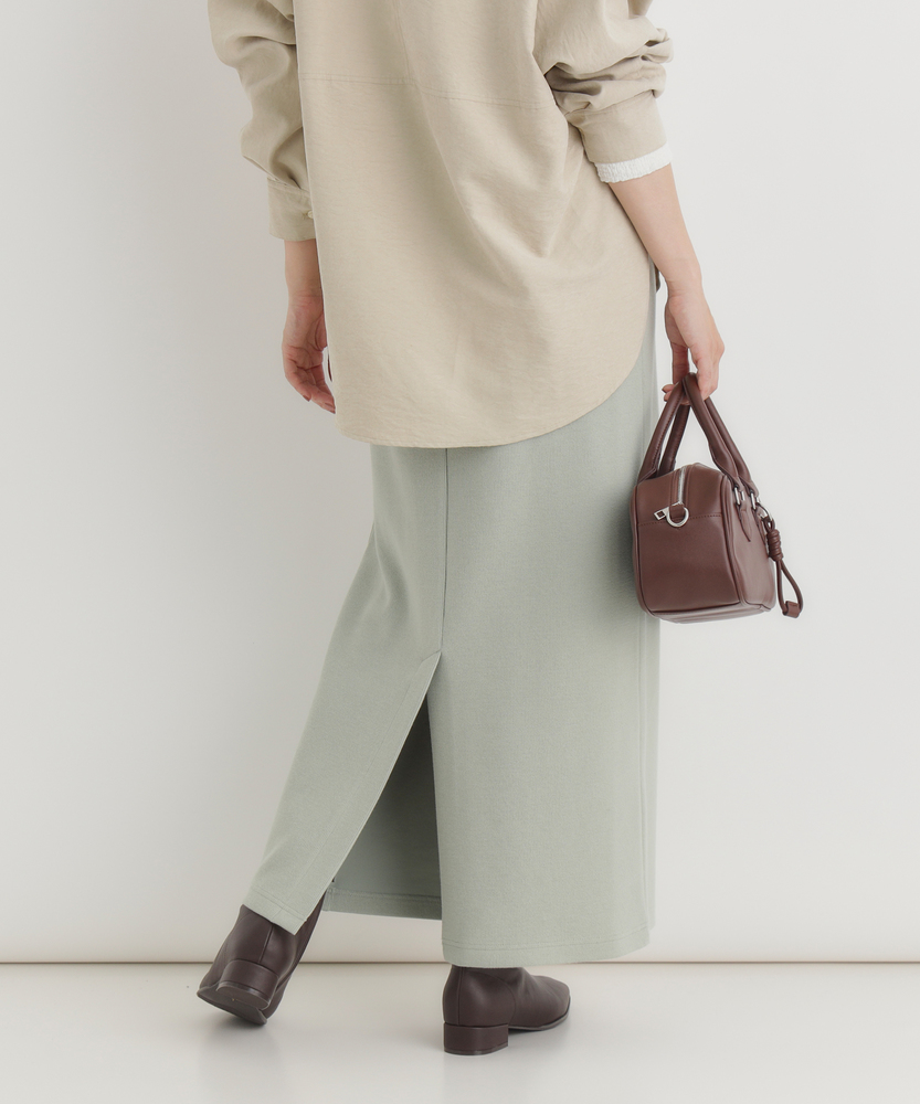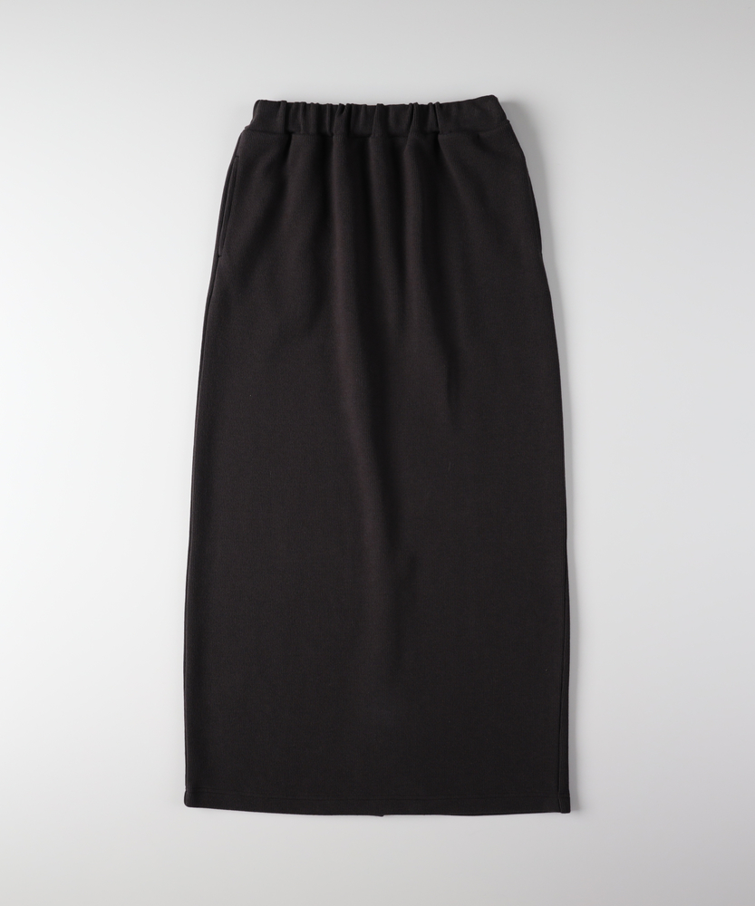 【仕様】ウエストのギャザー入りゴムで腰まわりを包み込み、無駄のないタイトなIラインを実現。膝下着丈に配したセンターベントで歩行の可動域を確保し、裾まわりをすっきり見せるクリーンな仕立てが都会的な横顔を作ります。【素材】 サカリバ組織のニットが程よい肉感と伸縮性を両立し、身体に沿う美しい落ち感を実現。微細な凹凸が肌離れを生み、シワになりにくく家庭でのケアも簡単なためデイリーに重宝します。 【スタイリング】 タイトシルエットを活かしトップスはコンパクトにまとめるのが上品。フォルムシャツをタックインしてウエストマーク、またはオーバーサイズニット×ローファーで力の抜けた都会的スタイルに。小物はゴールドで品よく。