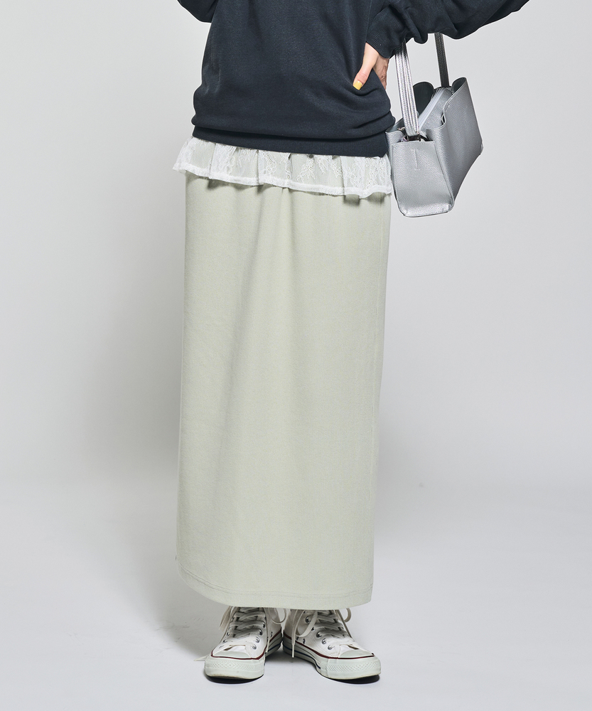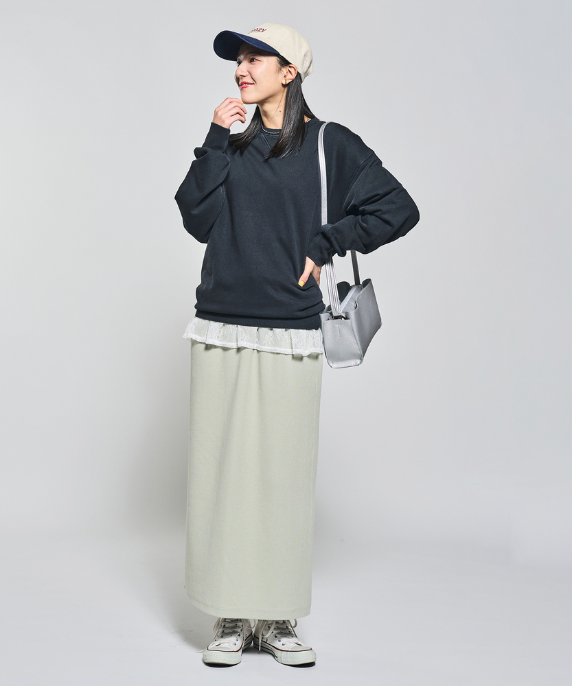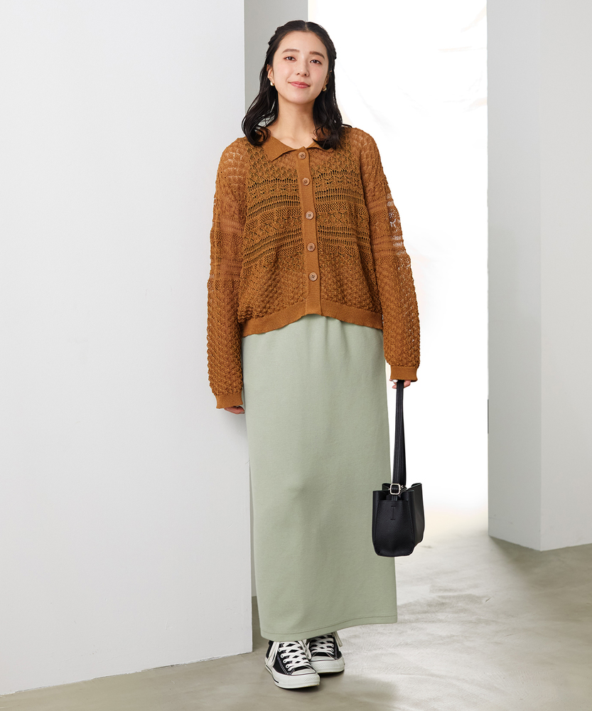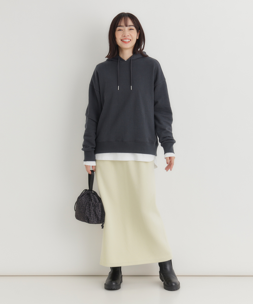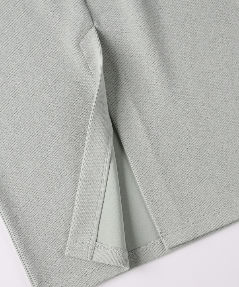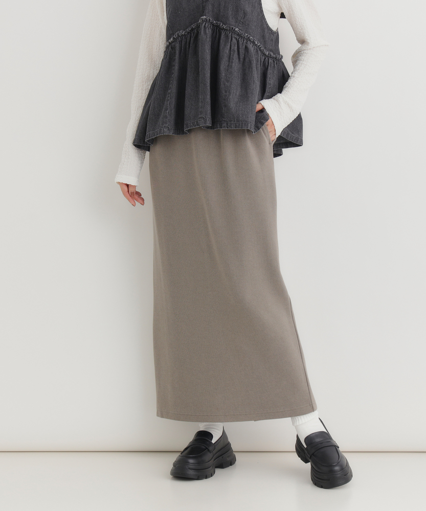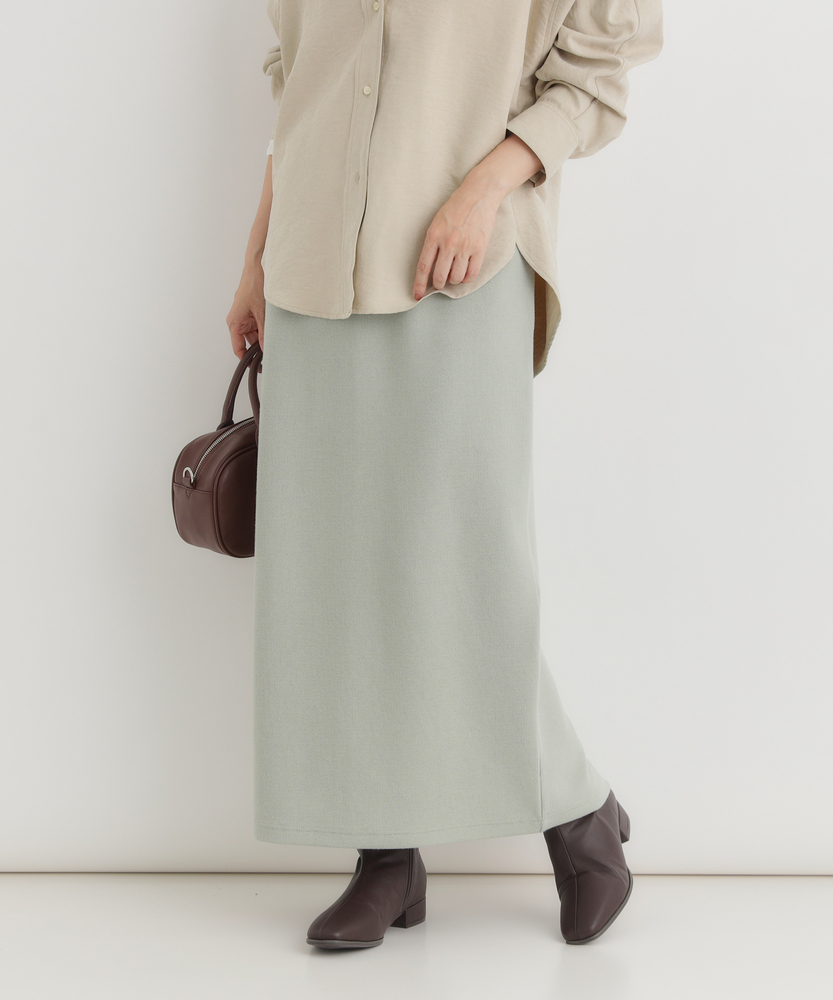 【仕様】ウエストのギャザー入りゴムで腰まわりを包み込み、無駄のないタイトなIラインを実現。膝下着丈に配したセンターベントで歩行の可動域を確保し、裾まわりをすっきり見せるクリーンな仕立てが都会的な横顔を作ります。【素材】 サカリバ組織のニットが程よい肉感と伸縮性を両立し、身体に沿う美しい落ち感を実現。微細な凹凸が肌離れを生み、シワになりにくく家庭でのケアも簡単なためデイリーに重宝します。 【スタイリング】 タイトシルエットを活かしトップスはコンパクトにまとめるのが上品。フォルムシャツをタックインしてウエストマーク、またはオーバーサイズニット×ローファーで力の抜けた都会的スタイルに。小物はゴールドで品よく。