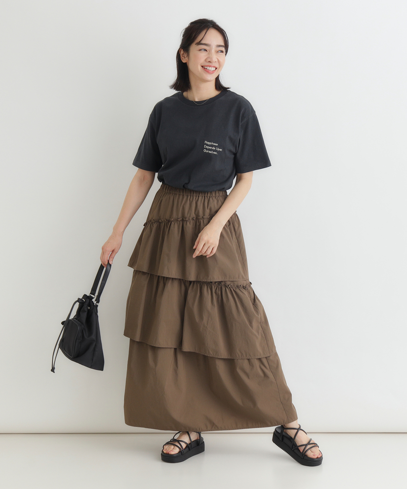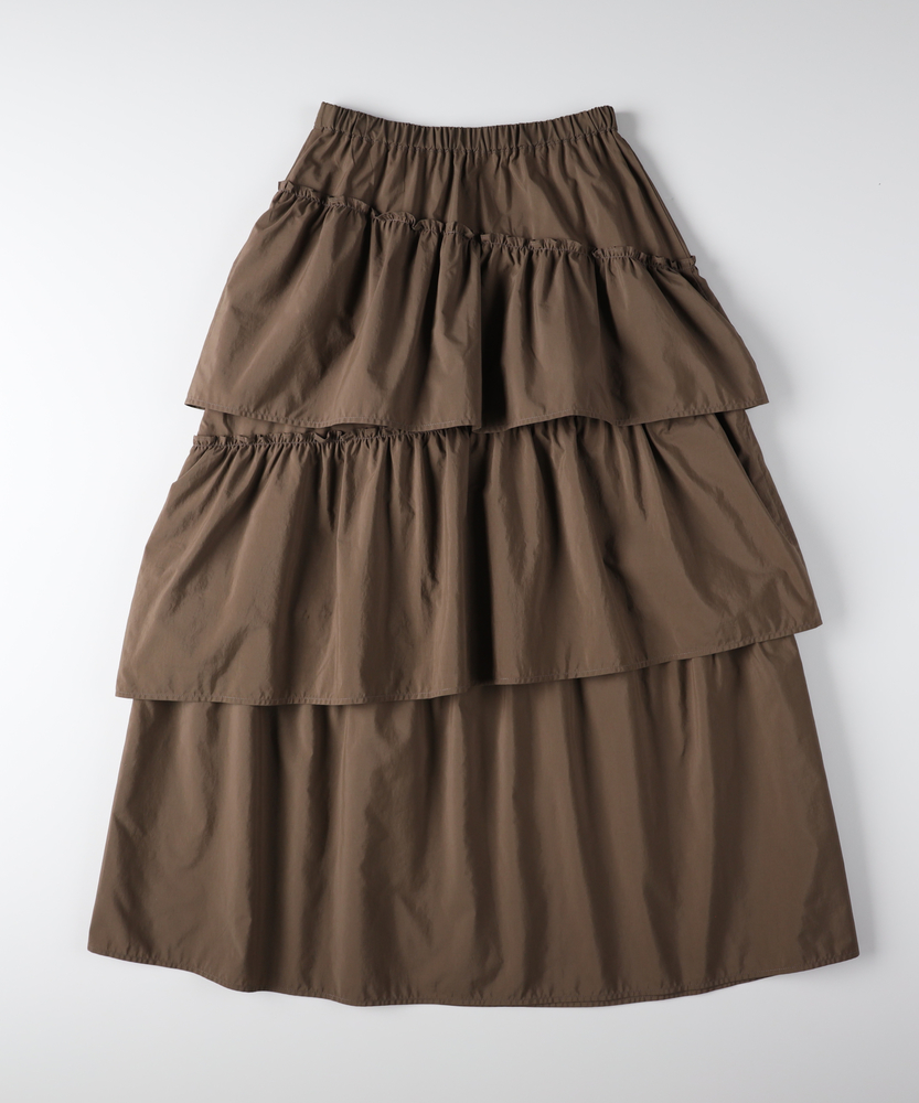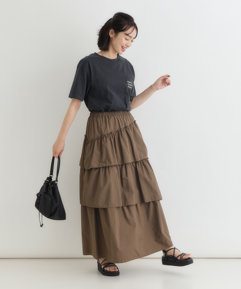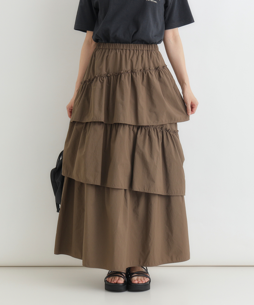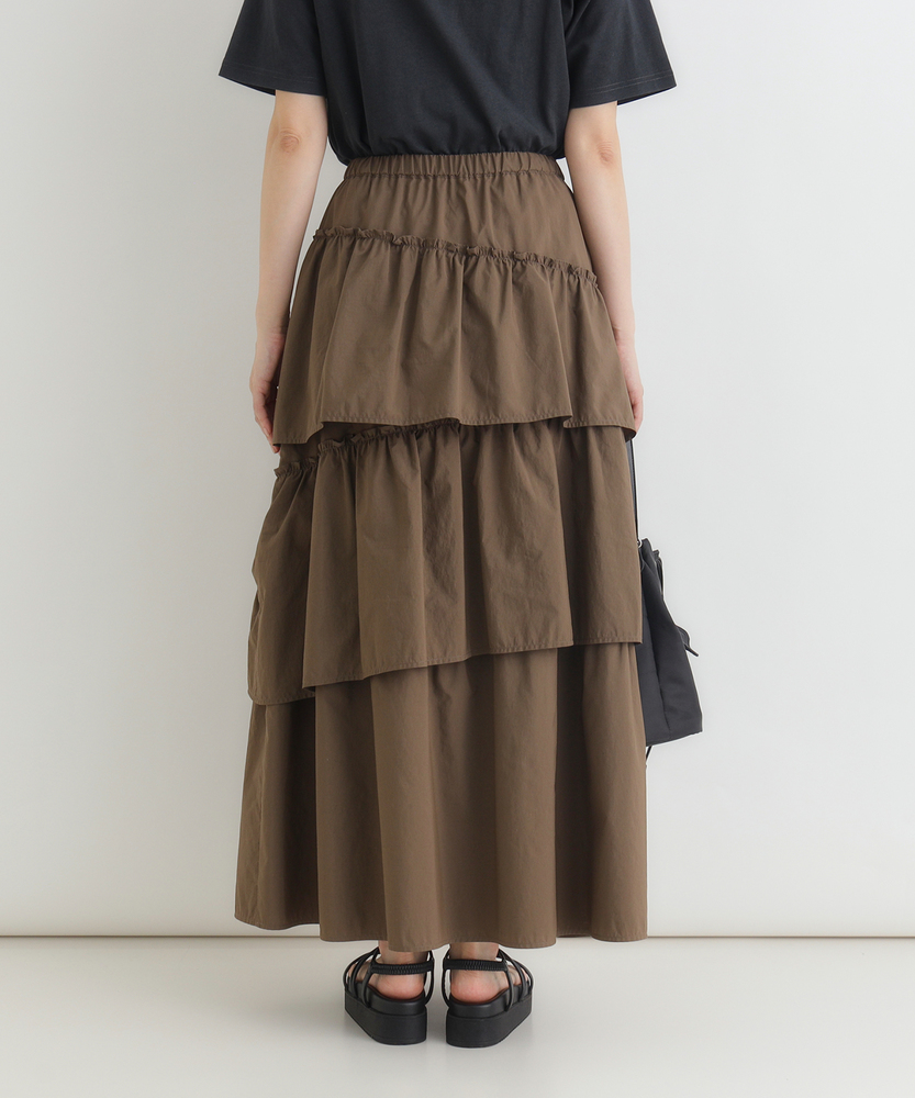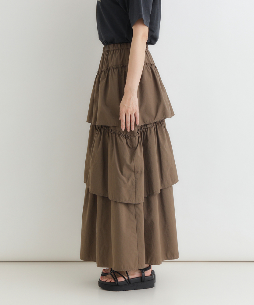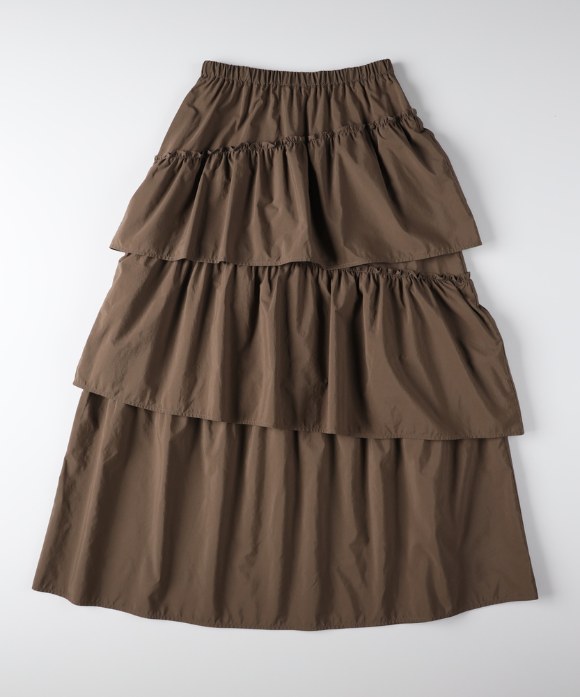 履くだけで、日常がドラマティックに。甘すぎない「大人の可愛げ」ティアード。体型カバーと華やかさを両立する一枚。■Point・華やぐティアード3段の切り替えが生む、立体的で美しいAラインシルエット。動くたびにふわりと揺れ、女性らしさを引き立てます。シンプルなトップスと合わせるだけで、洗練されたコーデが完成します。・安心の体型カバー腰回りから裾にかけて広がるデザインが、気になる下半身をカバー。脚のラインを一切拾わず、リラックスして過ごせます。「隠している感」なく、スタイルアップが叶います。・ストレスフリーな腰回りウエストは総ゴム仕様で、締め付け感のない快適な履き心地。着脱もスムーズで、長時間の移動やデスクワーク、たくさん食べるランチの日でも苦しくなりません。・甘さを抑えたカラー深みのあるブラウンカラーが、ティアードの甘さを程よく中和。大人の女性に似合う、落ち着いたフェミニンさを演出します。シックな色味で、可愛くなりすぎず上品に着こなせます。・軽やかな素材感ボリュームがありながらも、重たさを感じさせない軽やかな風合い。マットな質感がカジュアルなアイテムとも好相性です。季節の変わり目にも重宝する、使い勝手の良い生地感です。・自在な着回し力Tシャツでカジュアルに、ブラウスでキレイめに。足元もスニーカーからブーツまで幅広くマッチします。オンオフ問わず、毎日のワードローブの主役になります。【仕様】たっぷりと生地を使用した3段のティアードデザインが特徴のロングスカートです。計算された切り替え位置が、腰回りをすっきりと見せつつ、裾に向かって優雅なボリュームを生み出します。広がりすぎない絶妙なシルエットで、甘くなりすぎず大人っぽい印象に仕上げました。【素材】程よいハリ感とマットな風合いを持つ生地を使用しています。肌離れが良く、さらりとした質感でロングシーズン快適に着用いただけます。シワも気になりにくい素材感で、気負わずデイリーに使いやすいのも魅力です。【スタイリング】ロゴTシャツやスウェットを合わせてカジュアルダウンするのが今の気分。足元はスニーカーやボリュームブーツでハズすと、こなれ感がアップします。コンパクトなリブニットをインして着れば、メリハリのある上品なスタイルが完成します。
