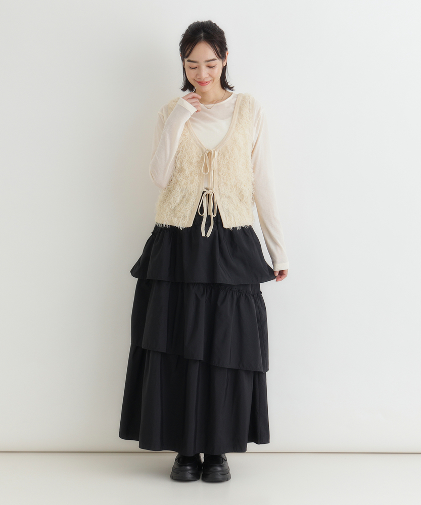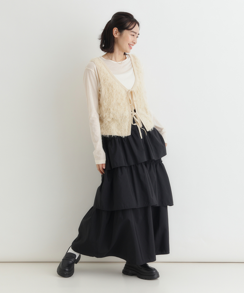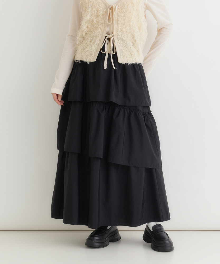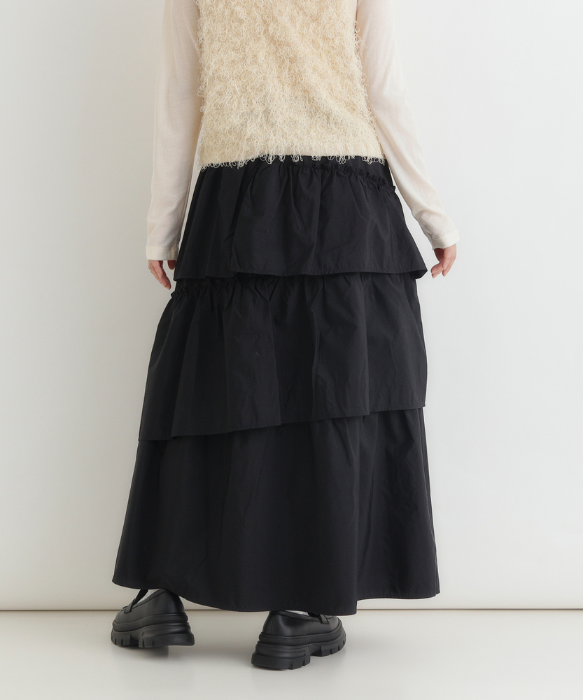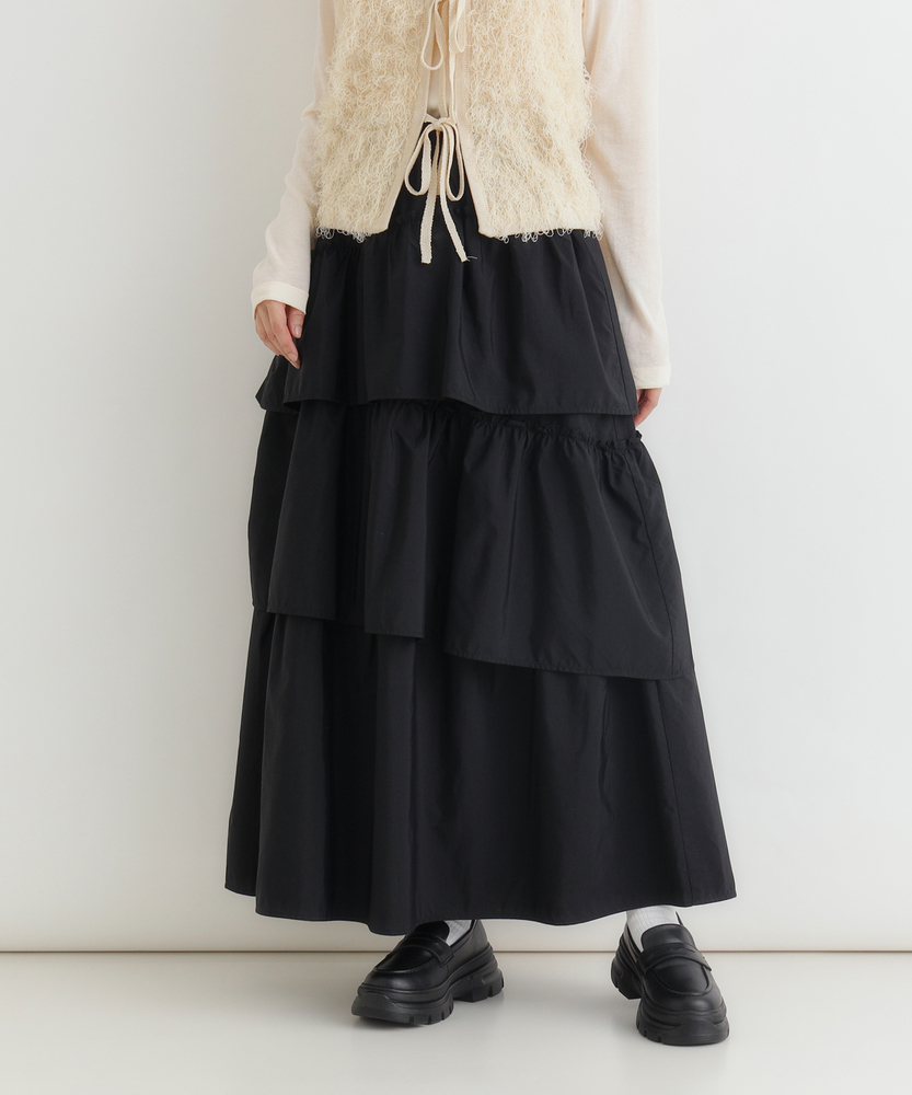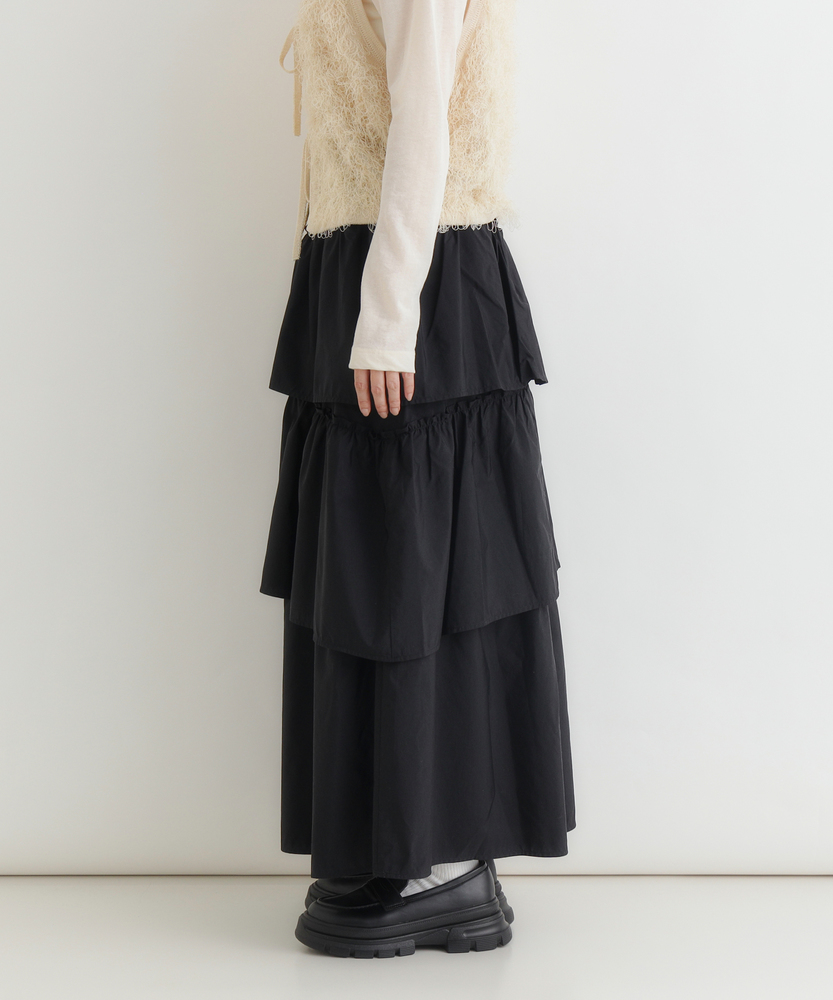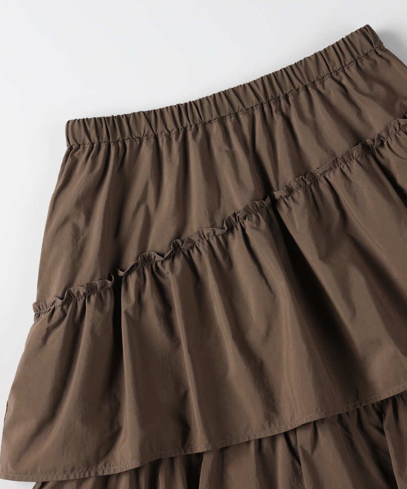 履くだけで、日常がドラマティックに。甘すぎない「大人の可愛げ」ティアード。体型カバーと華やかさを両立する一枚。■Point・華やぐティアード3段の切り替えが生む、立体的で美しいAラインシルエット。動くたびにふわりと揺れ、女性らしさを引き立てます。シンプルなトップスと合わせるだけで、洗練されたコーデが完成します。・安心の体型カバー腰回りから裾にかけて広がるデザインが、気になる下半身をカバー。脚のラインを一切拾わず、リラックスして過ごせます。「隠している感」なく、スタイルアップが叶います。・ストレスフリーな腰回りウエストは総ゴム仕様で、締め付け感のない快適な履き心地。着脱もスムーズで、長時間の移動やデスクワーク、たくさん食べるランチの日でも苦しくなりません。・甘さを抑えたカラー深みのあるブラウンカラーが、ティアードの甘さを程よく中和。大人の女性に似合う、落ち着いたフェミニンさを演出します。シックな色味で、可愛くなりすぎず上品に着こなせます。・軽やかな素材感ボリュームがありながらも、重たさを感じさせない軽やかな風合い。マットな質感がカジュアルなアイテムとも好相性です。季節の変わり目にも重宝する、使い勝手の良い生地感です。・自在な着回し力Tシャツでカジュアルに、ブラウスでキレイめに。足元もスニーカーからブーツまで幅広くマッチします。オンオフ問わず、毎日のワードローブの主役になります。【仕様】たっぷりと生地を使用した3段のティアードデザインが特徴のロングスカートです。計算された切り替え位置が、腰回りをすっきりと見せつつ、裾に向かって優雅なボリュームを生み出します。広がりすぎない絶妙なシルエットで、甘くなりすぎず大人っぽい印象に仕上げました。【素材】程よいハリ感とマットな風合いを持つ生地を使用しています。肌離れが良く、さらりとした質感でロングシーズン快適に着用いただけます。シワも気になりにくい素材感で、気負わずデイリーに使いやすいのも魅力です。【スタイリング】ロゴTシャツやスウェットを合わせてカジュアルダウンするのが今の気分。足元はスニーカーやボリュームブーツでハズすと、こなれ感がアップします。コンパクトなリブニットをインして着れば、メリハリのある上品なスタイルが完成します。