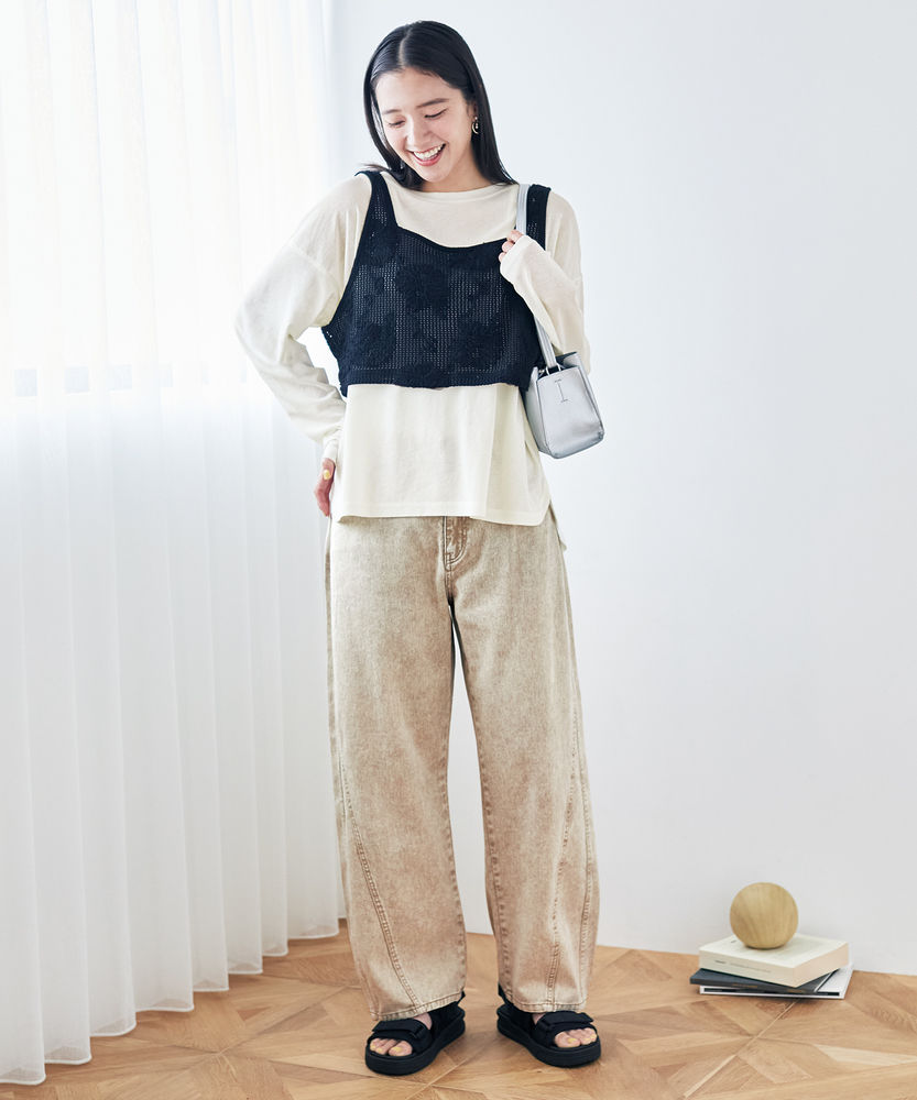穿くだけでこなれる、大人のヴィンテージライク。気になるラインをカバーする、最旬コクーンシルエット。頑張りすぎない、私らしい日常のカジュアルパンツ。■Point・最旬コクーンシルエット立体的な丸みが特徴。トレンド感を押さえつつ、大人のリラックスを演出。・嬉しい体型カバー効果ゆったりとしたサイジング。脚のラインを拾わず、すっきりと見せてくれます。・こだわりのケミカル加工硫化染めツイル生地を使用。絶妙な色落ちとアタリ感。表情豊かな仕上がりです。・快適な穿き心地の綿100%肌馴染みの良いコットン素材。ハリのあるしっかりとした生地。ロングシーズン活躍します。・すっきり見えの切り替えラインフロントに入ったダーツライン。縦のラインを強調し、野暮ったさを回避します。・楽ちんな後ろウエストゴムバックスタイルはゴム仕様。締め付け感を軽減し、快適なフィット感を実現。【仕様】丸みを帯びたトレンドのコクーンシルエットが、リラクシーな大人の抜け感を演出するパンツです。フロントにあしらわれた切り替えラインが立体感を生み出し、すっきりとした印象を与えます。後ろウエストはゴム仕様になっており、長時間の着用でもストレスフリーな穿き心地を実現。実用性とデザイン性を兼ね備えた一枚です。【素材】しっかりとしたハリ感のある綿100%のツイル生地を採用しています。特殊な硫化染めとケミカル加工を施すことで、長年穿き込んだようなヴィンテージライクな表情に仕上げました。肌触りが良く丈夫な素材なので、デイリーユースとして気兼ねなくお使いいただけます。季節を問わずロングシーズン着回せるのも魅力です。【スタイリング】存在感のあるパンツなので、シンプルなTシャツやリブニットを合わせるだけでこなれたカジュアルスタイルが完成します。トップスをコンパクトにまとめたり、フロントだけ軽くインすると、コクーンシルエットがより引き立ちバランス良くまとまります。足元はスニーカーからパンプスまで、幅広いアイテムと好相性です。 【セットアップで着用可能なアイテムはこちら】HR26102300019 ケミカル加工ワーク半袖シャツ/セットアップ対応