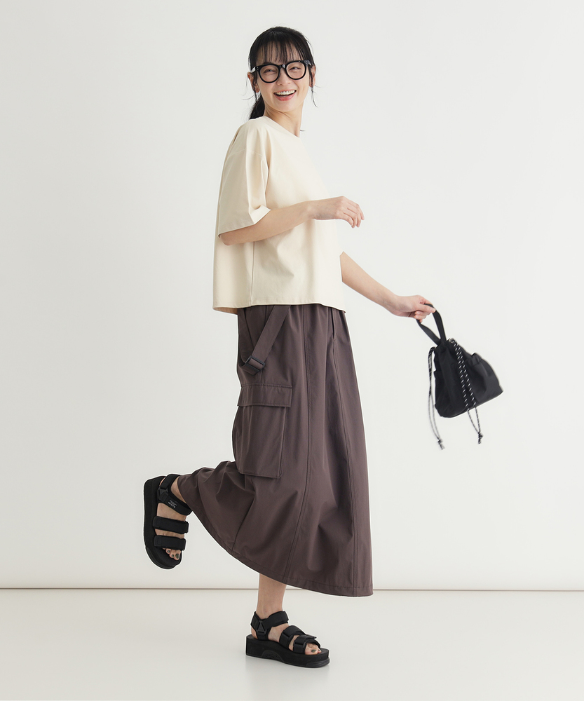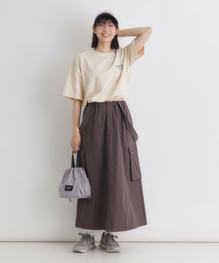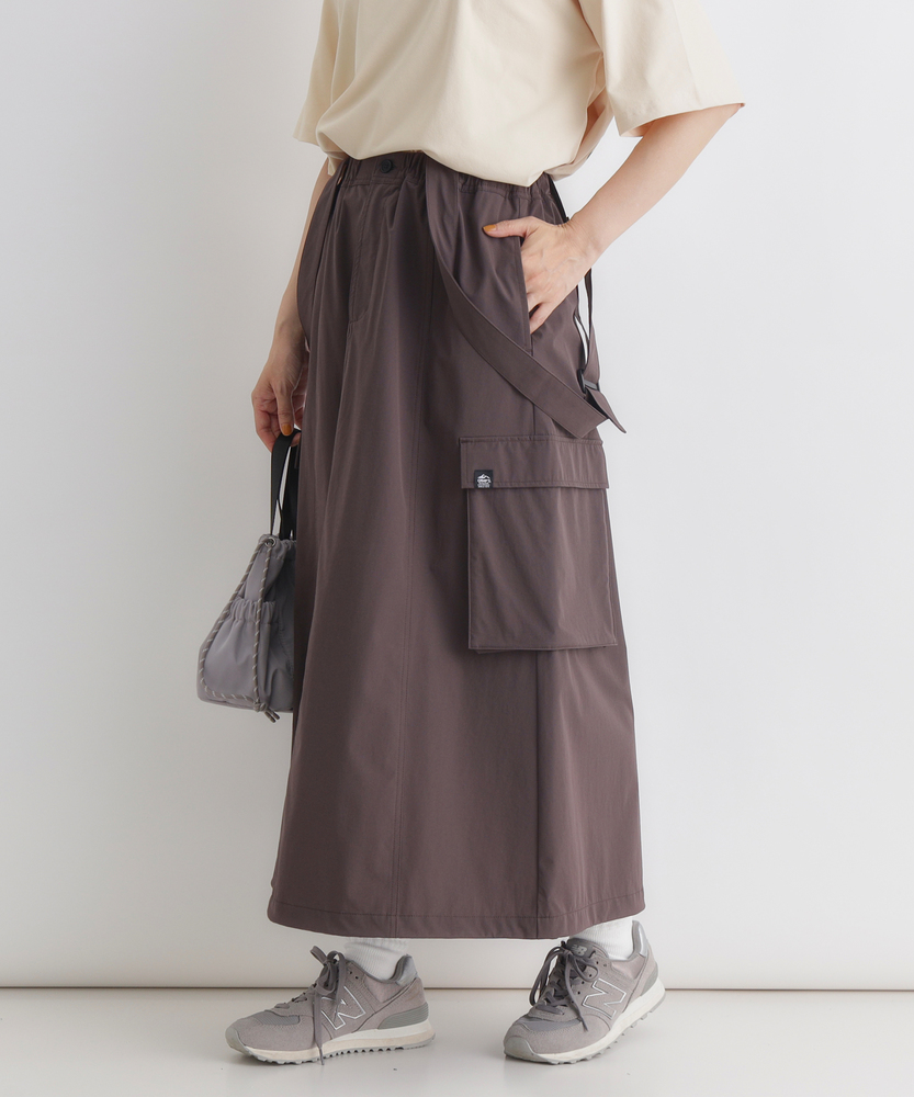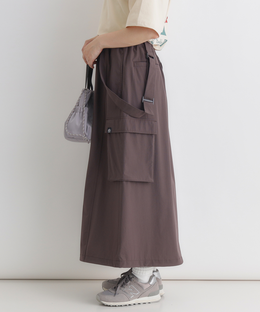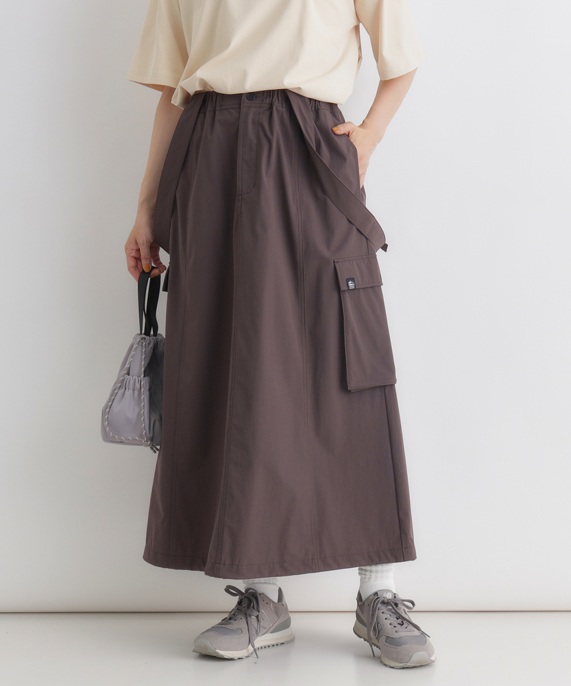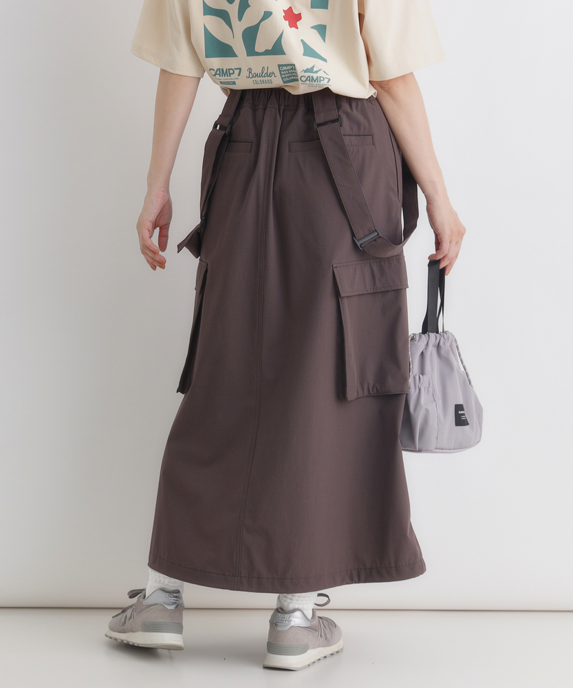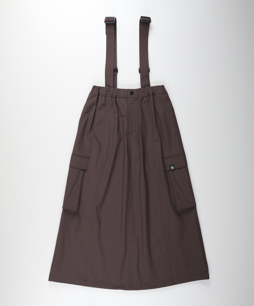 機能美と遊び心を纏う。「PLAY PROOF」サスペンダースカート。アウトドアの機能性を日常へ。大人のためのワークスタイル。汚れや動きを気にせず、自分らしく過ごせる一枚。■Point・着こなしの幅を広げるサスペンダー太めのストラップがコーデのアクセントに。長さ調整が可能で、身長や好みのスタイリングに合わせてバランスを整えられます。・トレンド感のあるカーゴポケット両サイドに配置された大きめのフラップポケット。デザインのポイントになるだけでなく、スマホや小物をサッと収納できる実用性も兼備。・ストレスフリーな総ゴムウエストウエスト部分はギャザーを寄せたゴム仕様。締め付け感のないリラクシーな穿き心地で、アクティブに動く日も快適に過ごせます。・すっきり見えするナローシルエット広がりすぎない絶妙なAラインシルエット。ワークテイストなディテールを取り入れつつも、縦のラインを強調しスタイルアップを叶えます。・気兼ねなく使える「PLAY PROOF」「遊び(PLAY)」に耐えるタフさと機能性を意識。公園遊びやアウトドア、日常の家事など、汚れを気にせずガシガシ使える頼もしい素材感です。・合わせやすい落ち着いたカラー深みのあるダークブラウンは、どんな色とも好相性。カジュアルな中にも大人の落ち着きを感じさせ、季節を問わずワードローブで活躍します。【デザイン】CAMP7が提案する、機能性とデザイン性を両立させたサスペンダースカートです。トレンドのミリタリー要素を感じさせるカーゴポケットや、太めのサスペンダーがワークな雰囲気を演出。カジュアルなディテールを盛り込みながらも、シルエットは広がりすぎないよう計算されており、子供っぽくならずに大人な印象で着こなせます。バックスリットはありませんが、足さばきの良いパターン設計で動きやすさも確保されています。【素材】アウトドアブランドならではの、マットでハリ感のある素材を使用しています。「PLAY PROOF」の名にふさわしく、アクティブなシーンでも気負わず着用できるタフな質感が魅力。しっかりとした生地感ながらも重たすぎず、シーズンレスで着用可能な厚みです。シワになりにくく、イージーケアで済むのも忙しい日常には嬉しいポイントです。【スタイリング】インナーを変えるだけで、ロングシーズン様々な表情を楽しめます。ロゴTシャツやスウェットを合わせれば、王道のアウトドアカジュアルスタイルに。タイトなリブニットやブラウスを合わせれば、女性らしさをミックスした都会的な着こなしが完成します。足元はスニーカーはもちろん、ボリュームのあるブーツやスポーツサンダルとも相性抜群です。