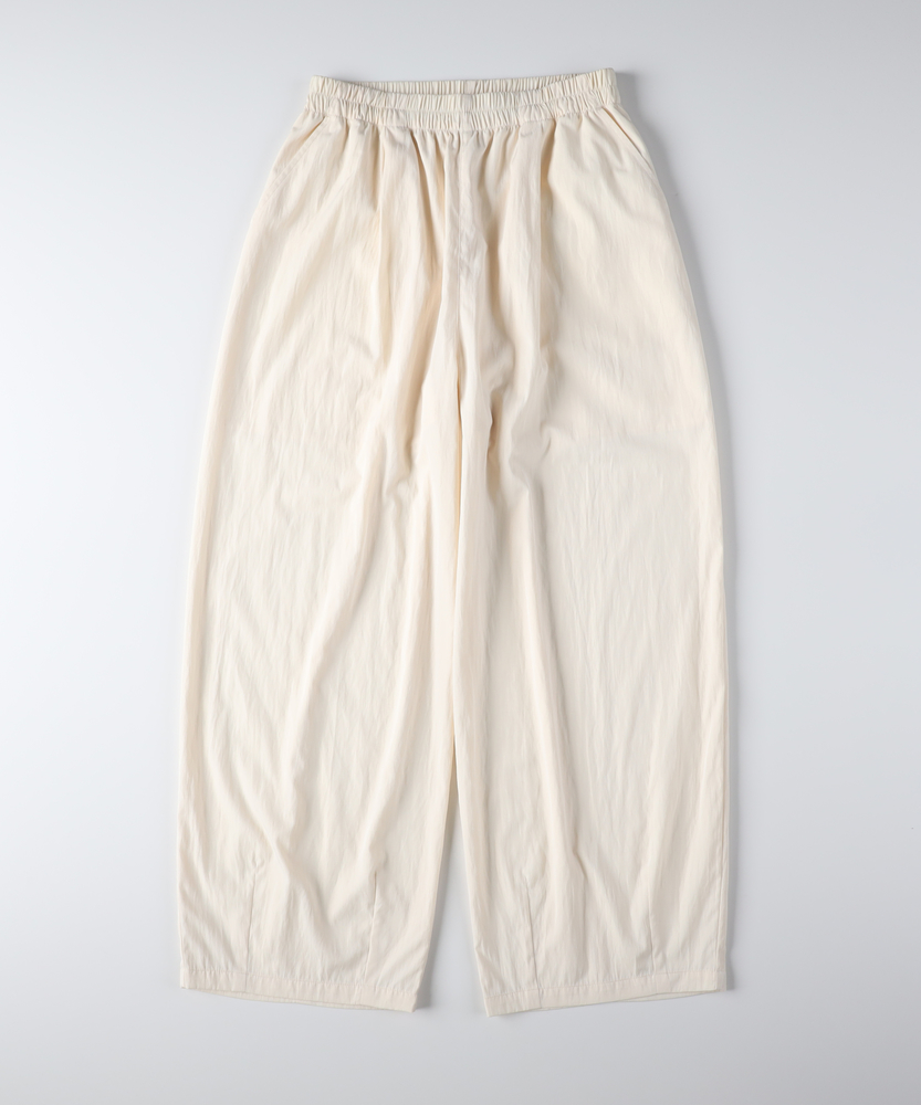 履くだけで決まる、大人の丸みシルエット。「楽ちん」と「こなれ感」を両立する一本。軽やかに包み込む、洗練コクーンパンツ。■Point・愛らしい「コクーン」シルエット裾に向かって緩やかに丸みを帯びたラインが、シンプルなコーデを格上げします。・脚のラインを"拾わない"安心感身体が泳ぐようなゆったりとしたワイドな作りで、ヒップや太ももを自然にカバー。・ストレスフリーな総ゴム仕様ウエストは全周ゴムで締め付け感ゼロ。一日中履いていたくなる快適な履き心地です。・軽やかでドライな素材感さらっとした肌触りと空気を含んだような軽さが魅力。アクティブな日にも最適です。・立体感を作る裾のディテール裾に施したダーツ処理が、絶妙なバルーンのようなフォルムを一日中キープします。・すっきり見えするバックポケット後ろ姿も野暮ったくならないよう、シンプルな玉縁ポケットですっきりと仕上げました。【デザイン】全体にたっぷりとゆとりを持たせつつ、裾にかけて緩やかにカーブを描く独特のフォルムが特徴です。ダボっとしすぎず、計算された丸みが女性らしい柔らかさと、ほんのりモードな雰囲気を演出します。ウエスト周りの細かなギャザーと裾のダーツが立体的なシルエットを作り出し、履くだけでスタイリングの主役になる存在感です。【素材】ナイロンを混紡することで、程よいハリと軽量感をプラスしました。ドライなタッチで肌離れが良く、ロングシーズン快適に過ごせる質感です。表面の微細な凹凸感がニュアンスを与え、洗いざらしのようなナチュラルな風合いが、大人のカジュアルスタイルに馴染みます。【スタイリング】ボリュームのあるボトムスなので、トップスはコンパクトなTシャツやリブニットをインするとバランス良くまとまります。あえてオーバーサイズのシャツを合わせれば、リラックス感のある大人の休日スタイルに。足元はスニーカーでラフに振るのも、パンプスやショートブーツで引き締めて都会的に仕上げるのもおすすめです。
