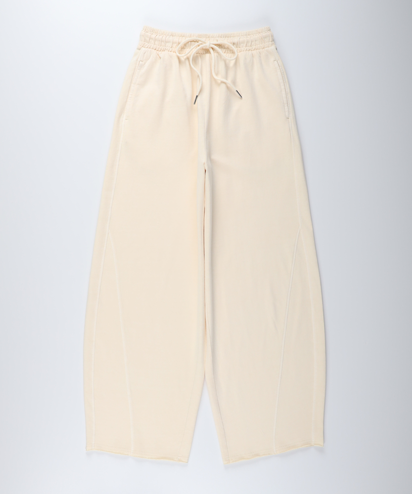 「穿くだけでこなれる」大人のカーブシルエット。ヴィンテージライクな表情で、いつもの日常を格上げ。楽ちんなのに手抜きに見えない、洗練スウェット。■Point・大人の余裕漂うコクーンシルエット脚のラインを拾わない立体感。気になる部分を自然にカバー。穿くだけでトレンド感のある装いに。・味わい深いヴィンテージ風加工ピグメント加工による絶妙な色落ち。初めから肌に馴染む柔らかな風合い。シンプルなトップスもサマになります。・ストレスフリーなウエストゴム仕様お腹周りを締め付けない総ゴム。ドローストリングでサイズ調整も簡単。長時間の着用でもリラクシーな穿き心地。・メリハリを生む切り替えラインサイドから裾に入るシームデザイン。丸みのあるシルエットを綺麗にキープ。野暮ったく見せない計算されたディテール。・抜け感を演出するカットオフの裾ラフな印象を与える切りっぱなし風の裾。足元に軽やかなアクセントをプラス。スニーカーやブーツとも好相性です。・日常に寄り添う便利なサイドポケットスマホや小物がサッと入る深めの設計。ちょっとしたお出かけにも便利。機能性とデザイン性を両立しました。【仕様】ややゆったりとしたサイジングで、脚のラインをカバーするカーブシルエットが魅力。サイドの切り替えラインが立体感を生み出し、リラックスした穿き心地ながらもすっきりとした印象に。ウエストのドローストリングや裾のカットオフ仕様など、細部にまでこだわった抜け感のあるデザインです。【素材】日常使いにぴったりな、柔らかな肌触りのスウェット生地を採用。表面には古着のような風合いを引き出すピグメント加工を施し、ヴィンテージライクな表情に仕上げました。穿くたびに馴染んでいくようなリラクシーな素材感で、お家時間から休日のお出かけまで、気兼ねなく快適に過ごせるアイテムです。【スタイリング】リラックス感のあるアイテムなので、あえてハリのあるシャツやブラウスと合わせたミックススタイルがおすすめ。足元はスニーカーでカジュアルにまとめるのはもちろん、華奢なパンプスやブーツを合わせると、大人の抜け感が漂う洗練されたコーディネートが完成します。タックインですっきり着こなすのも素敵です。