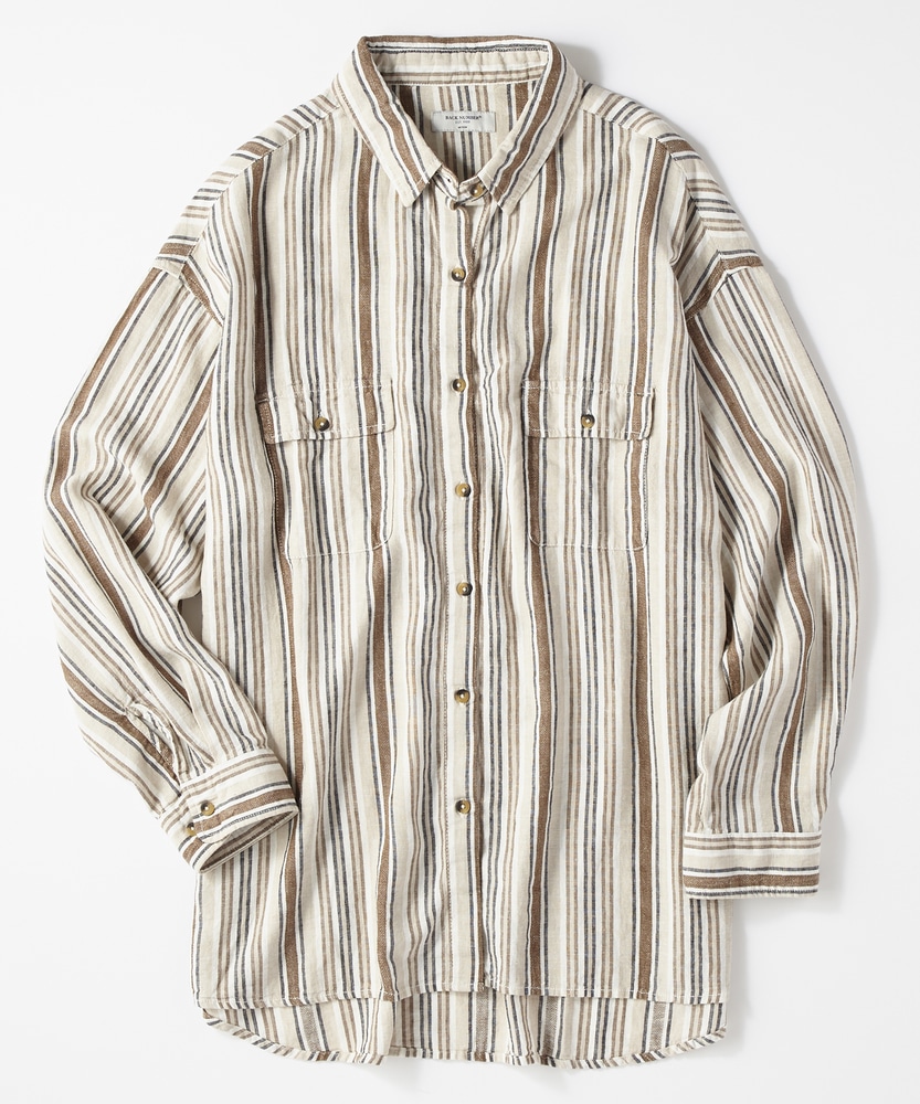 ライトオン オリジナルブランド BACK NUMBER(バックナンバー)のワークシャツワークシャツのディテールはそのまま活かし、イマドキ感のあるゆったりした着用感が出るようなビッグシルエットに仕上げました。ドルマンのような袖付けではなく、アーム自体はすっきりとした太さなので、ルーズ感はありながら腕はほっそり見えるようなお作りです。1枚でもはおりでも、どちらでも着やすいように前後差のある身頃です。ワークディテールのサロペットやオーバーオールの上から羽織るのに最適です。またチノやベイカーパンツなどメンズライクなボトムに組み合わせたミックスコーデも◎合わせやすベージュとブラウンの無地と、コーディネイトのポイントになる茶系のストライプを2色ご用意しました。※麻とレーヨンの長所を合わせ持った素材です。ネップのある生地感で、麻のドライさとレーヨンの柔らかさが共存する肌触りです。