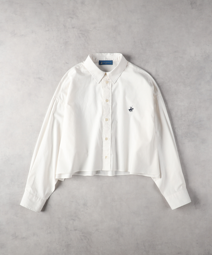 「Beverly Hills Polo Club」のクロップド丈シャツ。【仕様】トレンドのキレイめ見えするショート丈シャツ。胸元にワンポイントでブランドアイコンの刺繍を施しました。若年向けに思われるショート丈ですが、「スッキリ見え」「脚長効果」とどんなボトムスともバランスよく着こなせる、年代問わず着用できるアイテムです。【素材】春~初夏にかけて使いやすい厚さの張りのある生地を使用。【スタイリング】ショート丈を活かして、ボトムはワイド目のシルエットを選んでAラインを意識して頂くのがオススメ!デニム・スラックス・スカートまで幅広くお使いいただけます。