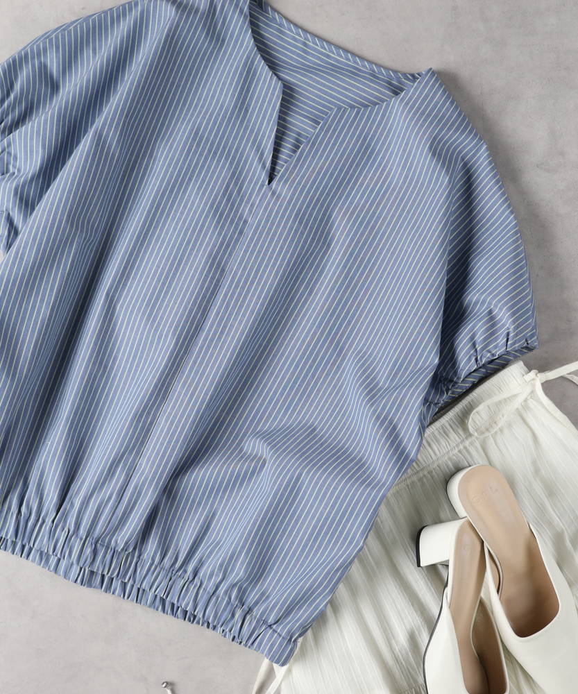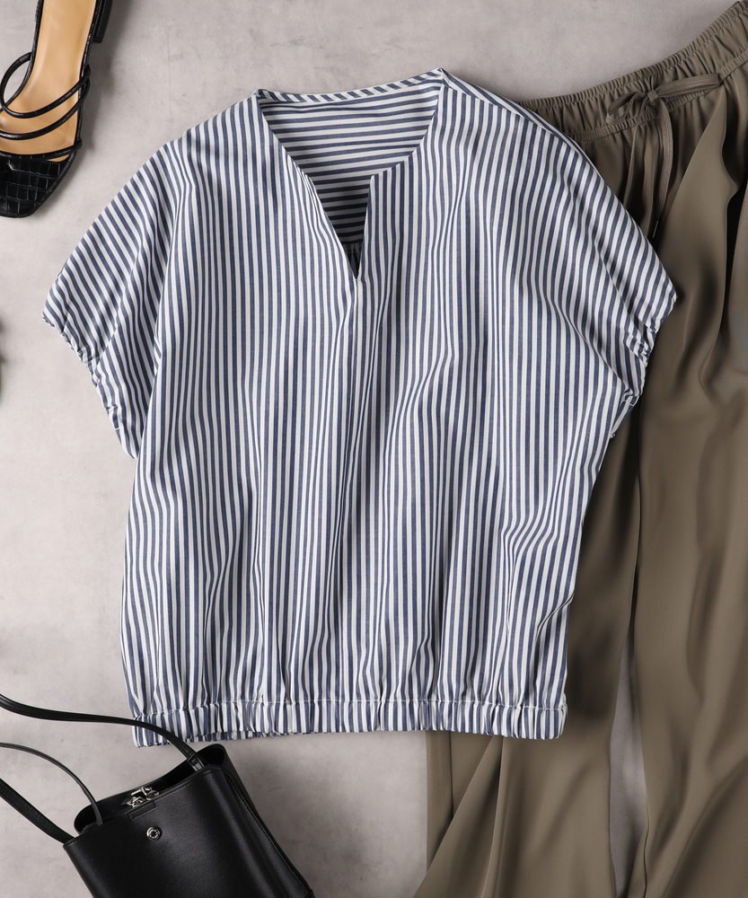【仕様】リラックスしたシルエットのバルーンブラウスが魅力的。ストライプ柄が視覚的に新鮮さを演出し、フロントのVネックラインが首元をすっきりと見せてくれます。ウエスト部分はゴム仕様で、フィット感もありながら動きやすさを確保。【素材】通気性に優れたブロード素材を使用し、軽やかな着心地を実現。柔らかな肌触りが特徴で、日常使いにぴったりです。シンプルでありながら、パターンが個性的な印象を与えます。【スタイリング】デニムやワイドパンツとの相性が抜群で、カジュアルなコーディネートにぴったり。足元にはスニーカーを合わせれば、若々しさと動きやすさが際立つスタイルに。軽快な印象で、春夏の着こなしに最適です。