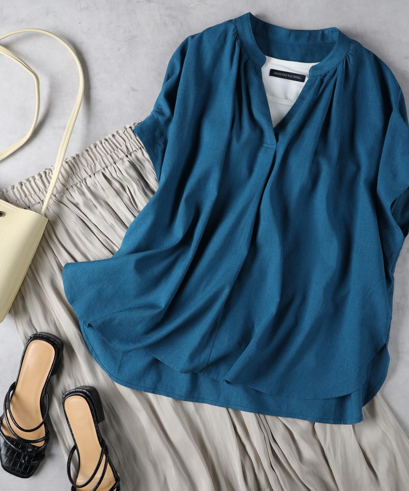 【仕様】ゆったりとしたシルエットが魅力のスキッパーブラウス。胸元のスリットデザインがさりげない抜け感を演出し、リラックスした雰囲気を纏っています。裾はラウンドカットで、女性らしさを引き立てるデザインとなっています。【素材】リネン混の素材を使用し、通気性と軽やかさが特長です。自然な風合いに加え、さらりとした質感が心地よい着心地を実現しています。暑い季節でも快適に過ごせるため、デイリーコーデに重宝するアイテムです。【スタイリング】シンプルなデニムやスカートと合わせて、抜け感のあるスタイルを楽しんで。アクセサリーやスニーカーでカジュアルダウンさせたり、ヒールを合わせてきちんと感を出すことも可能です。多彩なコーディネートをお楽しみいただけます。